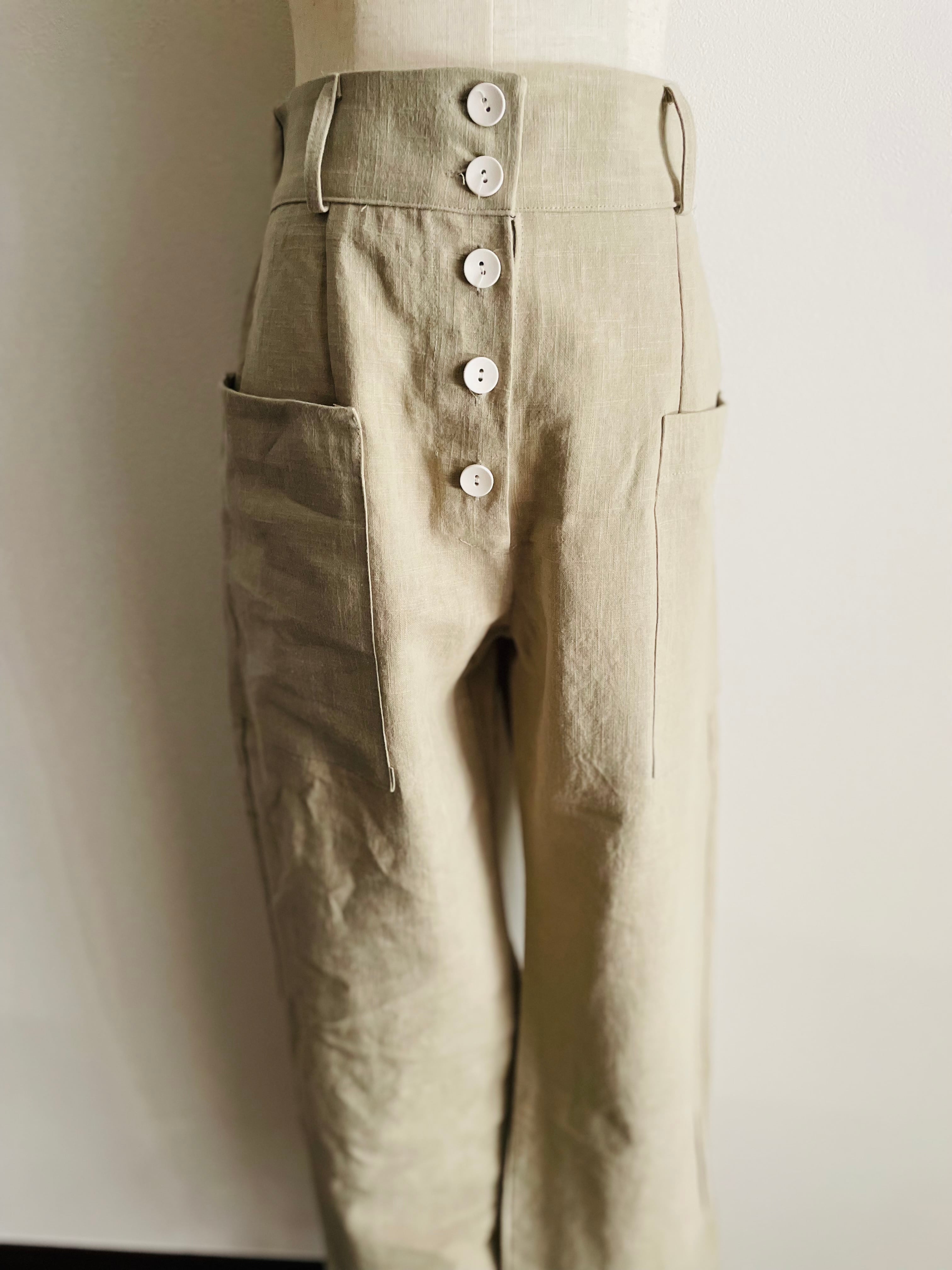 フロントボタンのハイウエストシルエットがすっきりした印象に。