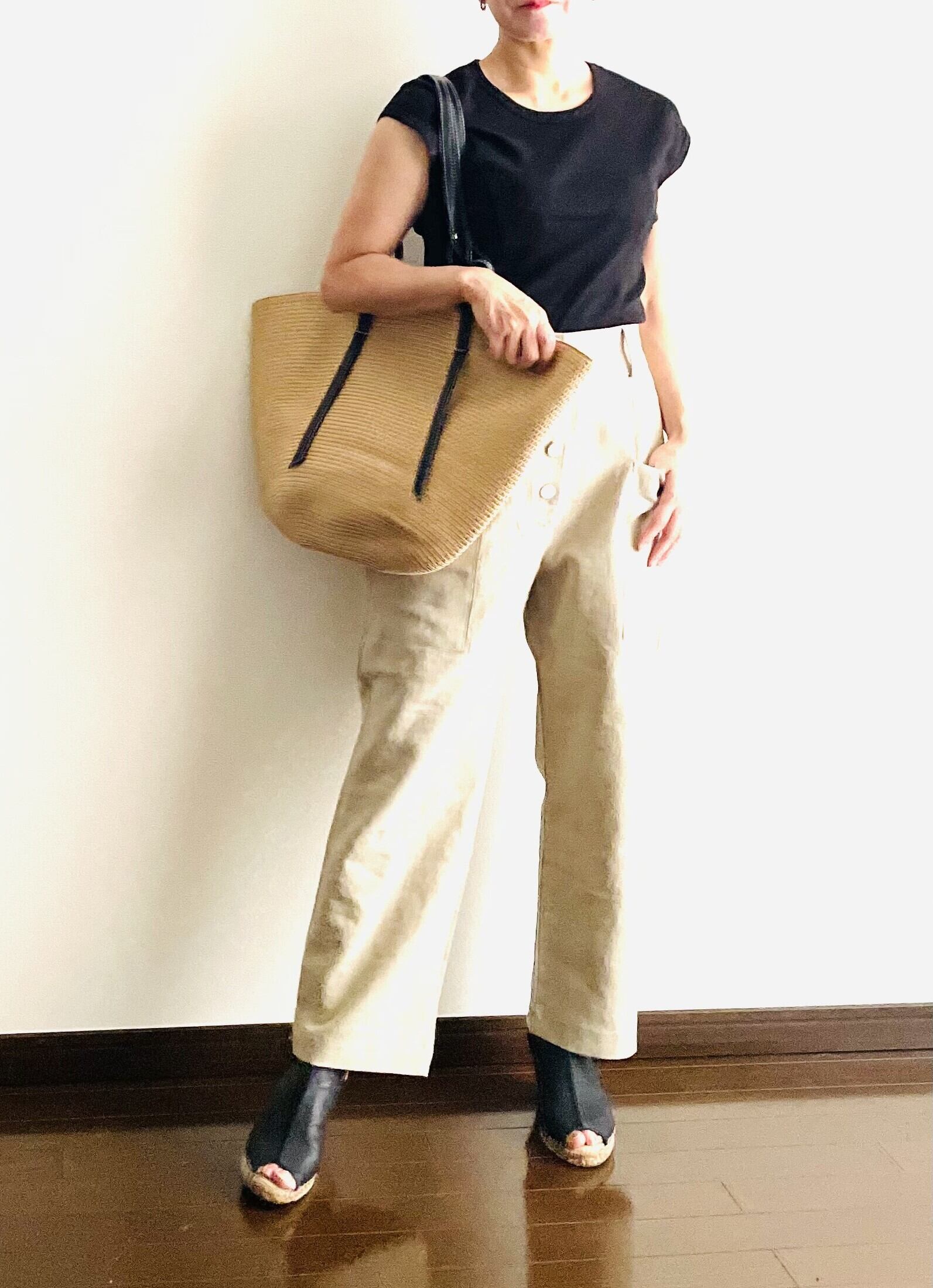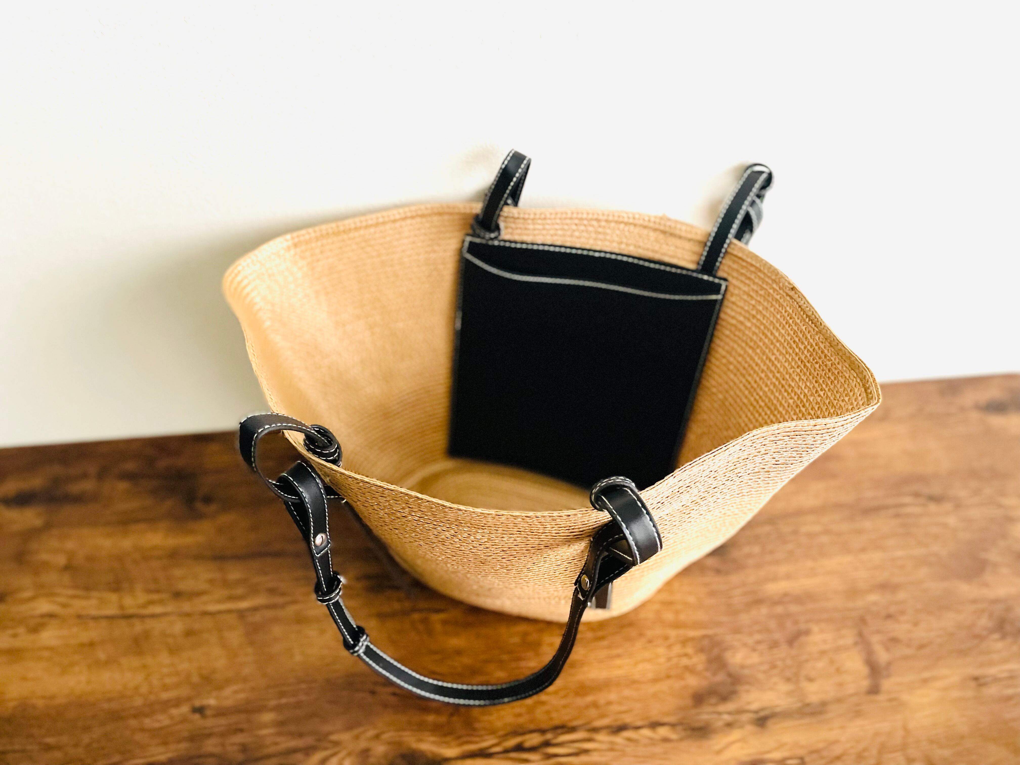内側にはしっかりとした高級感ある合皮素材の大きなポケットがついているのもポイントです。リゾートにもお仕事にも、万能に使えます。