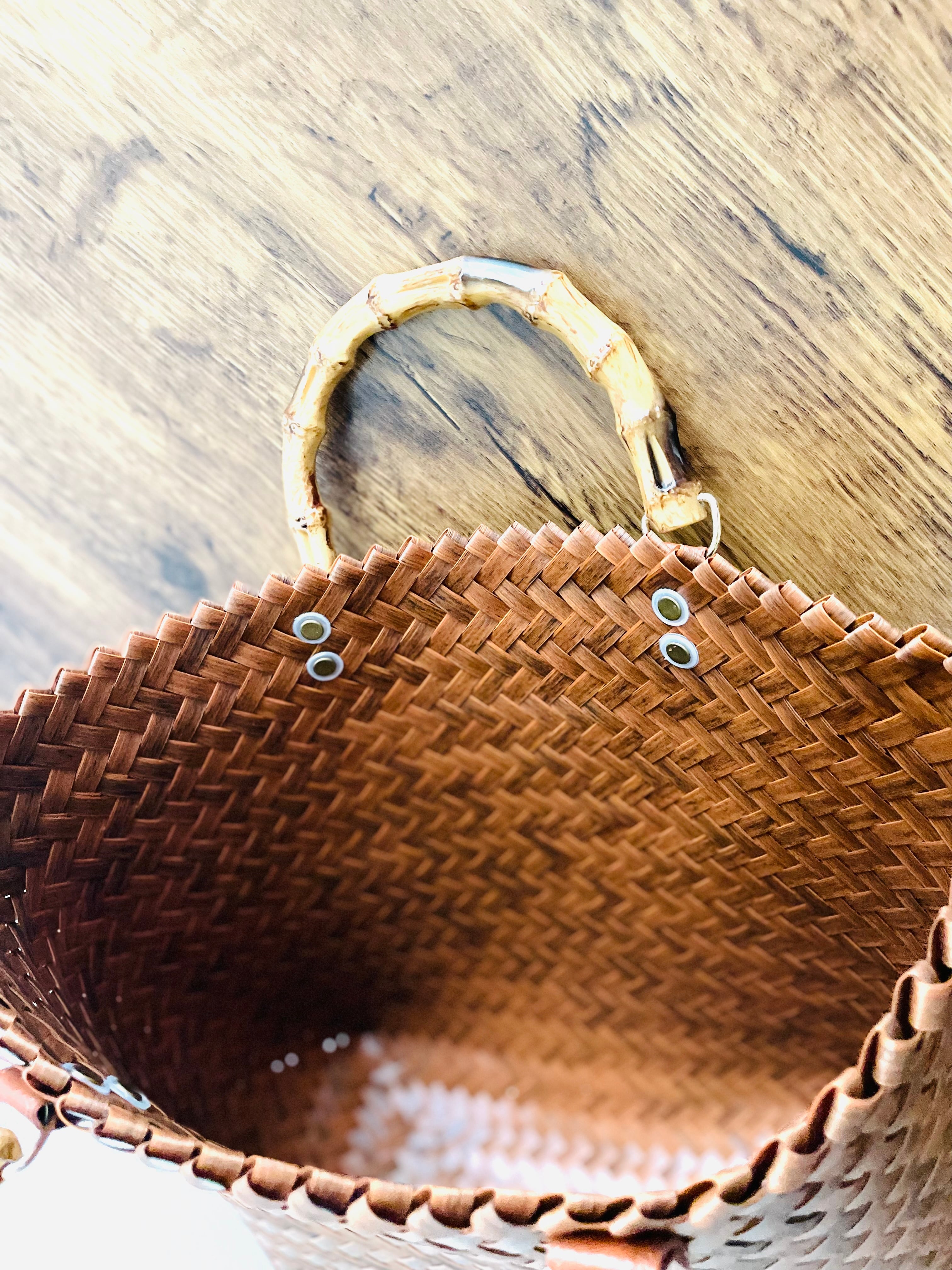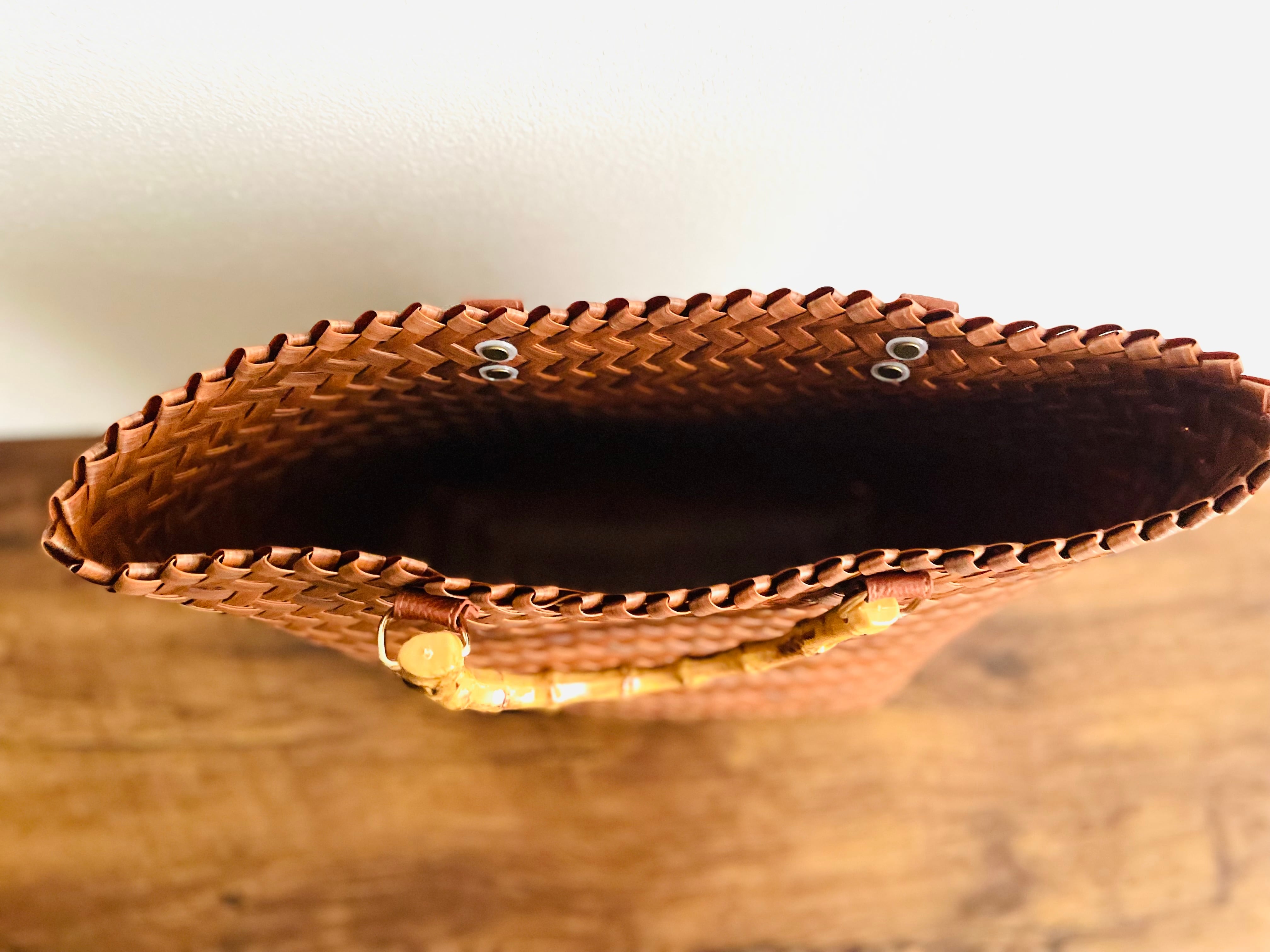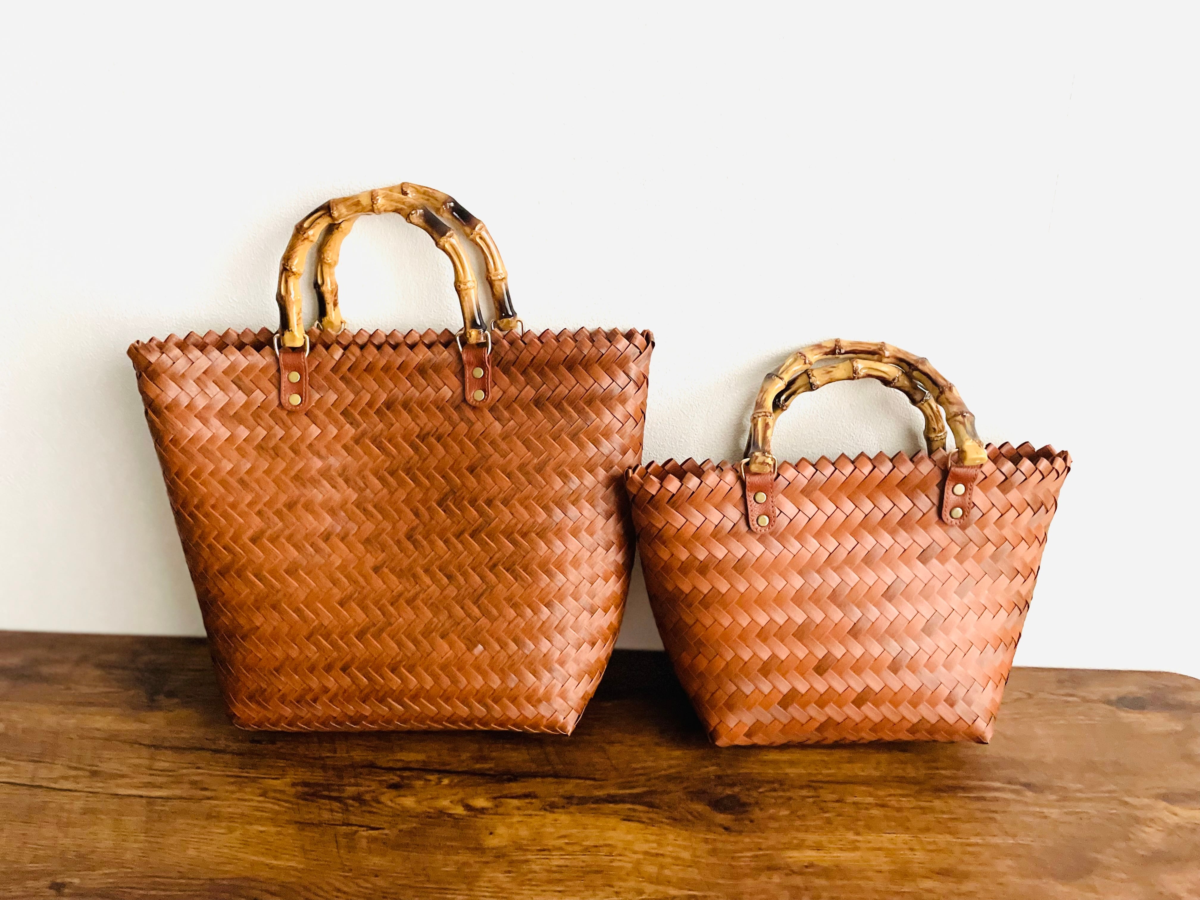 PVC素材でヘリボーン編みを施した籐のような見た目のカゴバッグ。