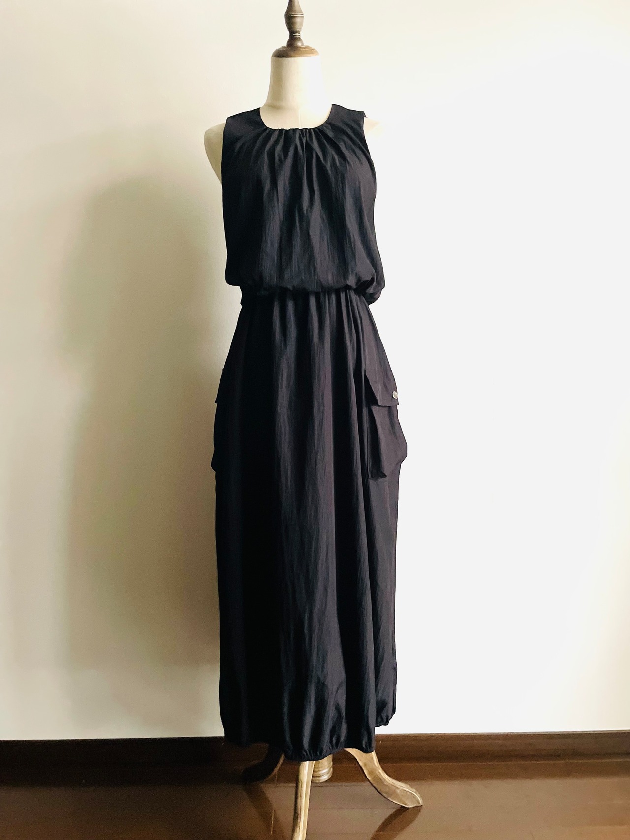 後ろのゴムの調整で、トップスの裾がAラインになったり、ウエストを絞ったスタイルにもなる、遊び心ある一枚です。