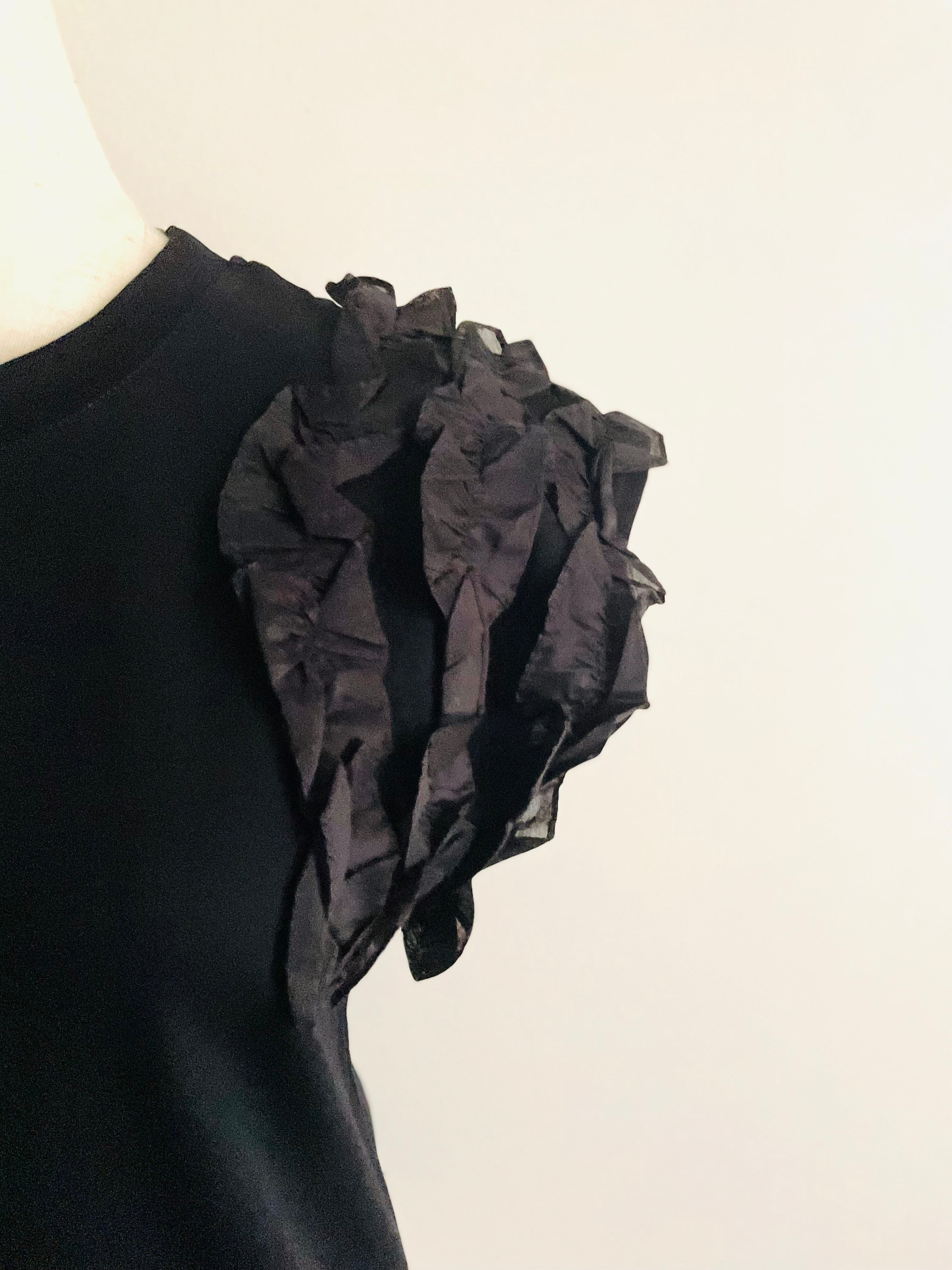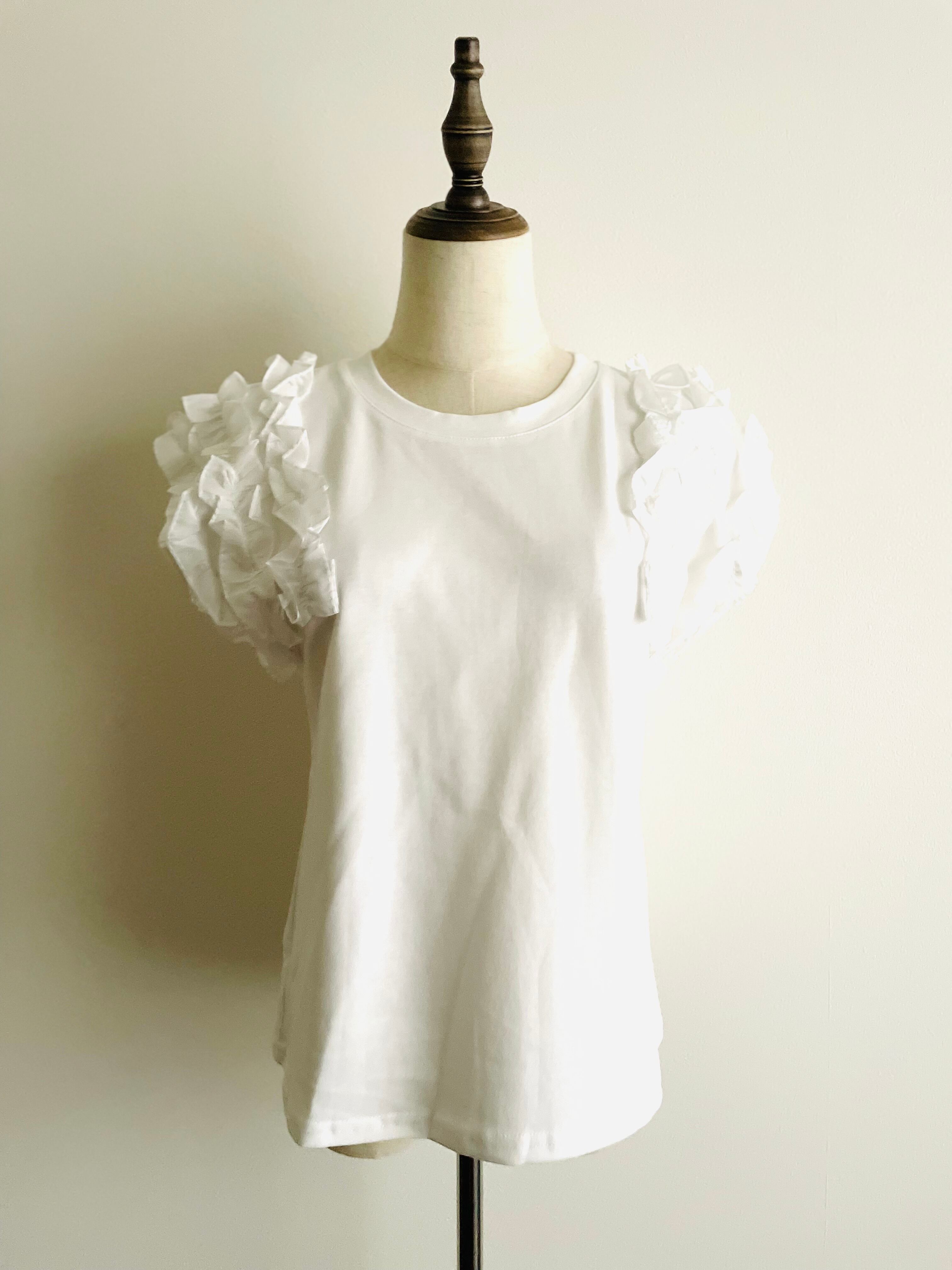フレンチスリーブの袖にレースフリルが華やかな印象のトップス。