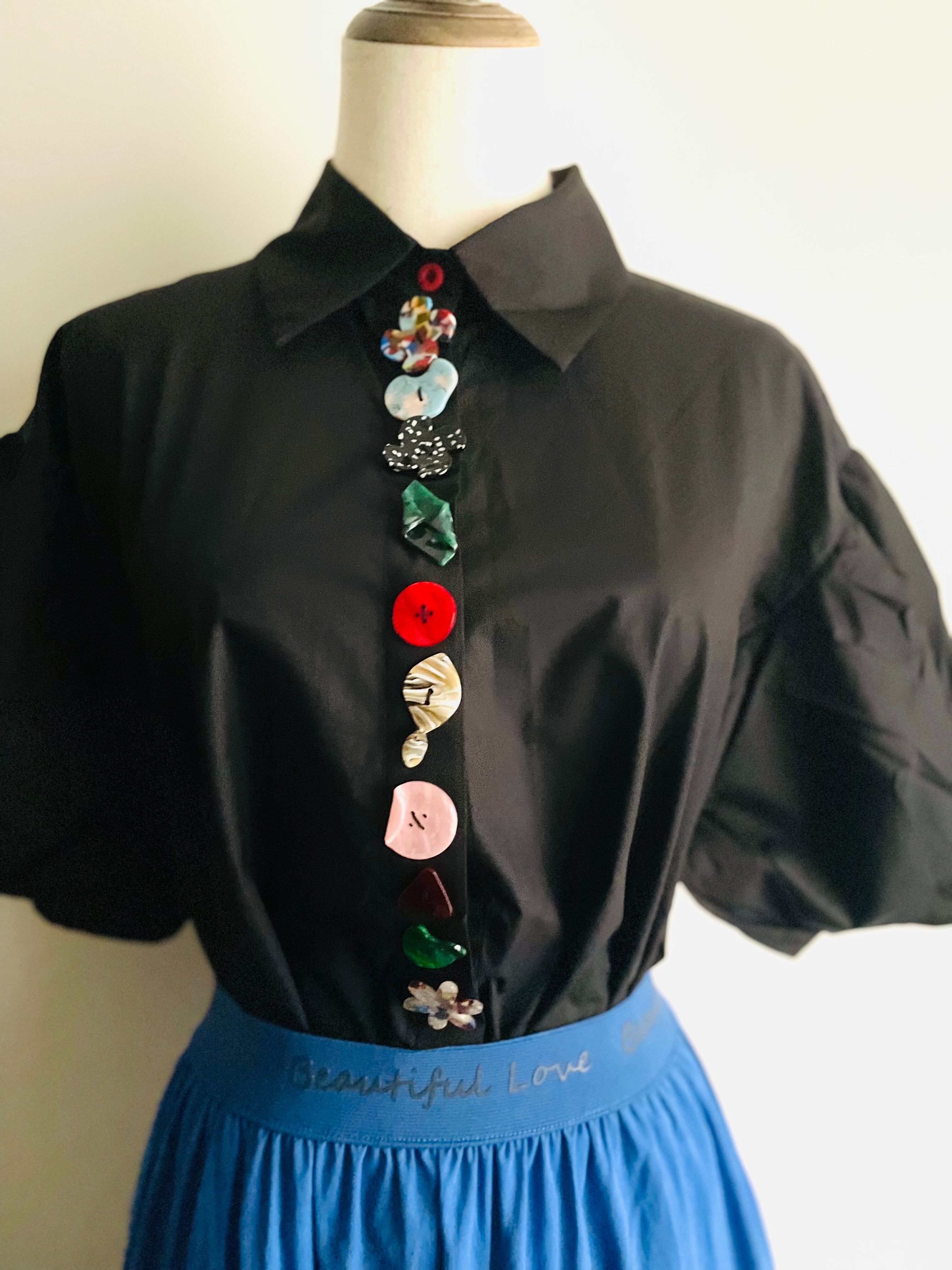 フロントにあるアートなデザインボタンが特徴のコットンブラウス。