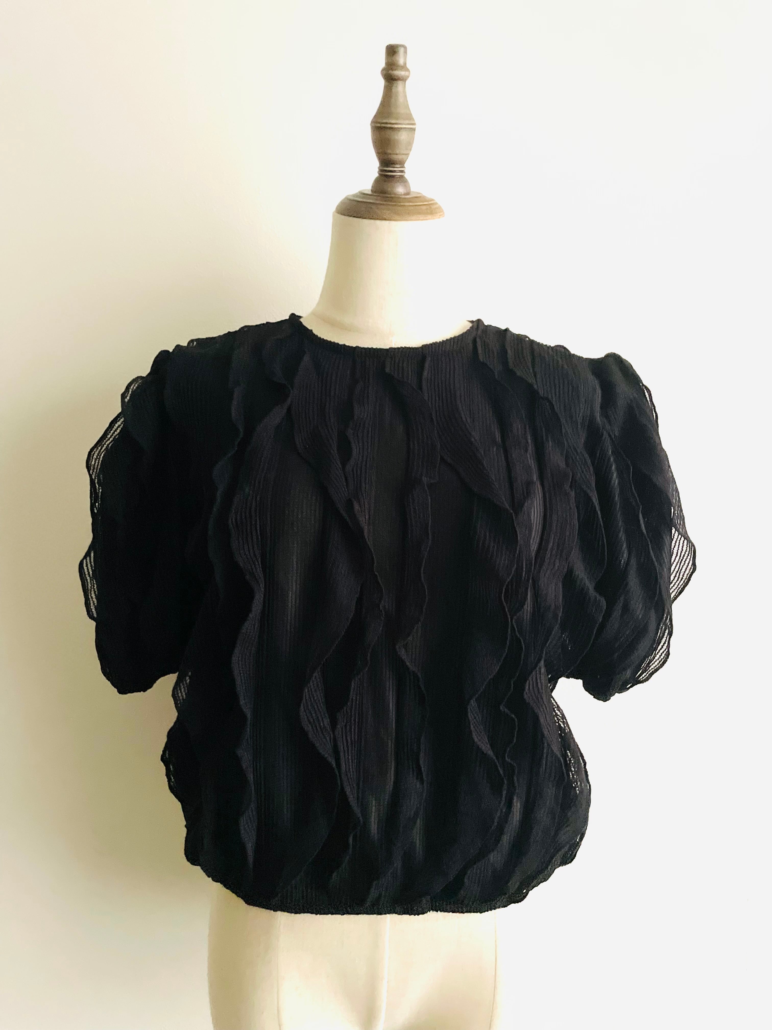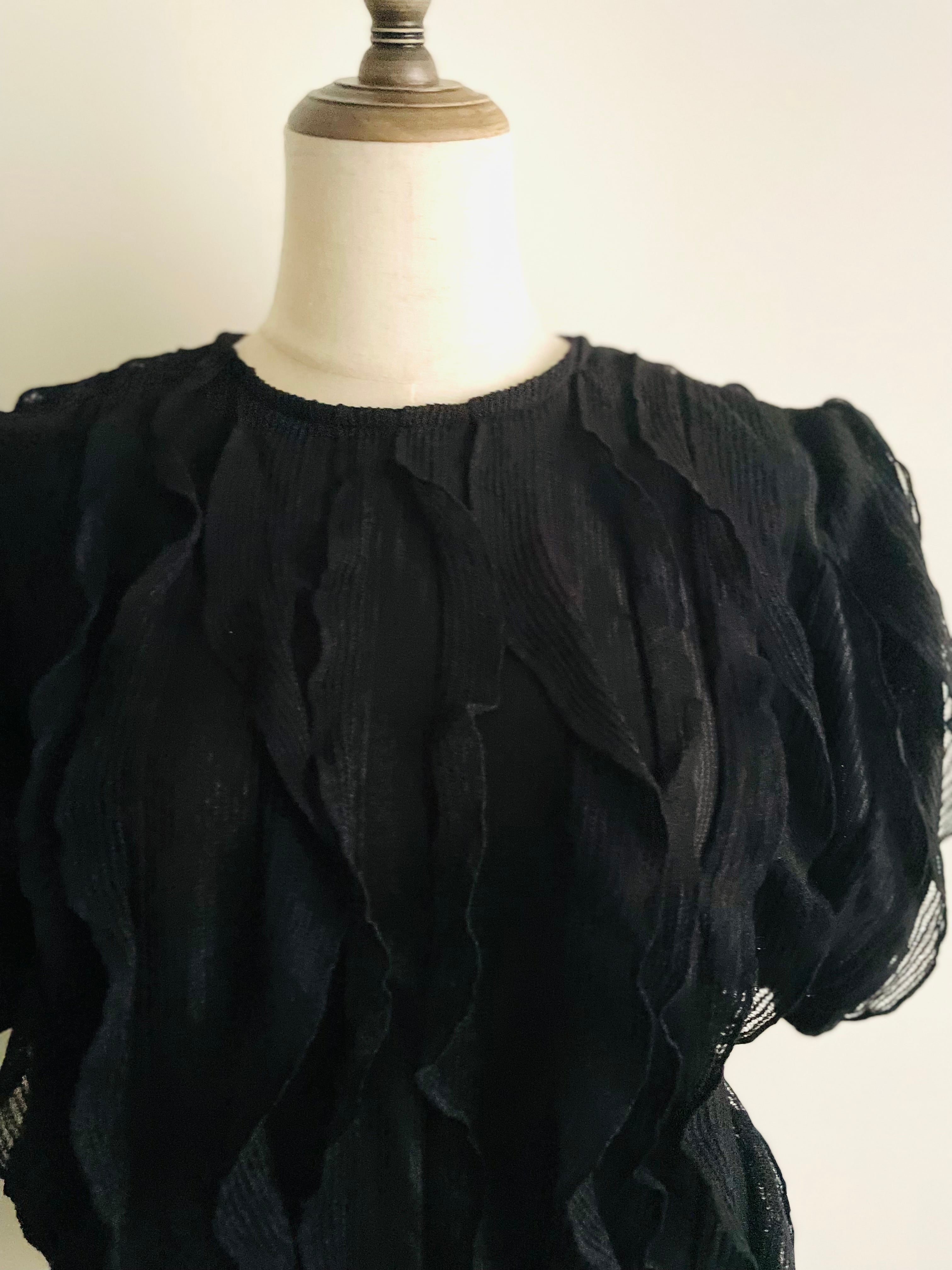 ゴムレースで施されたスパイラルフリルの半袖ニット。