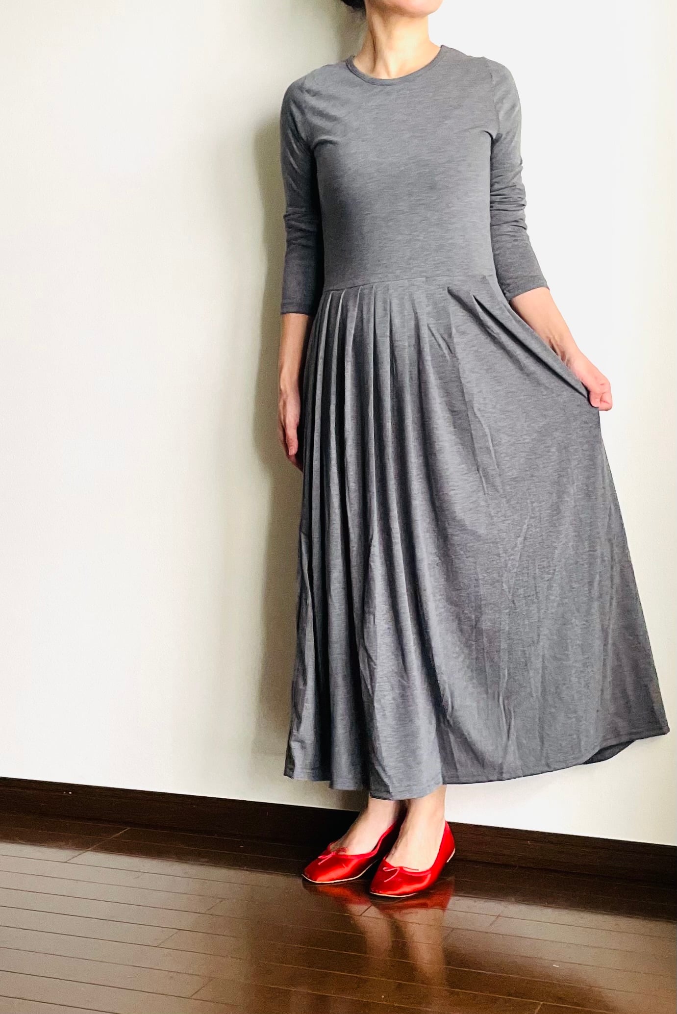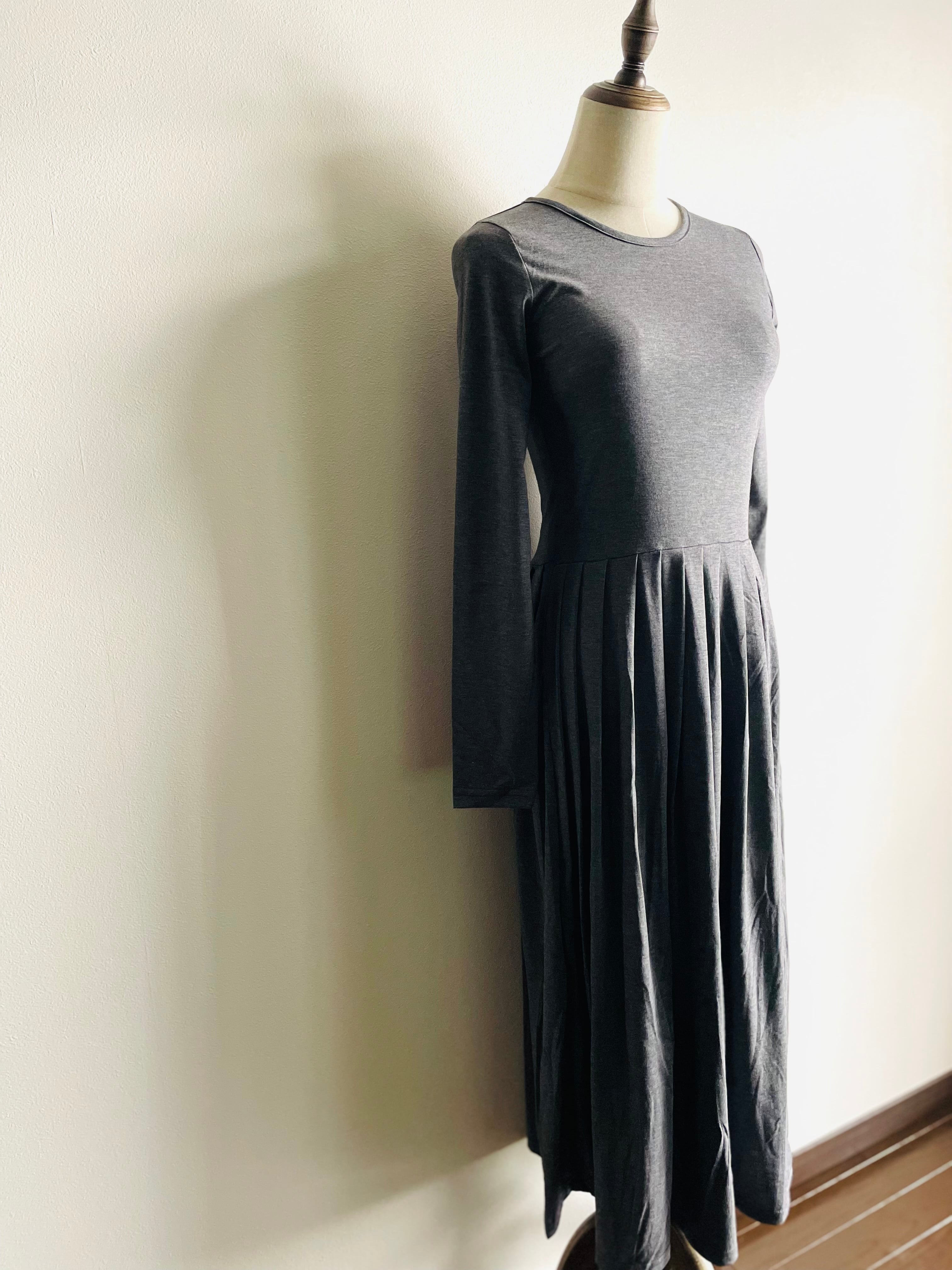 ストレッチの効いたカットソー素材のプリーツワンピース。