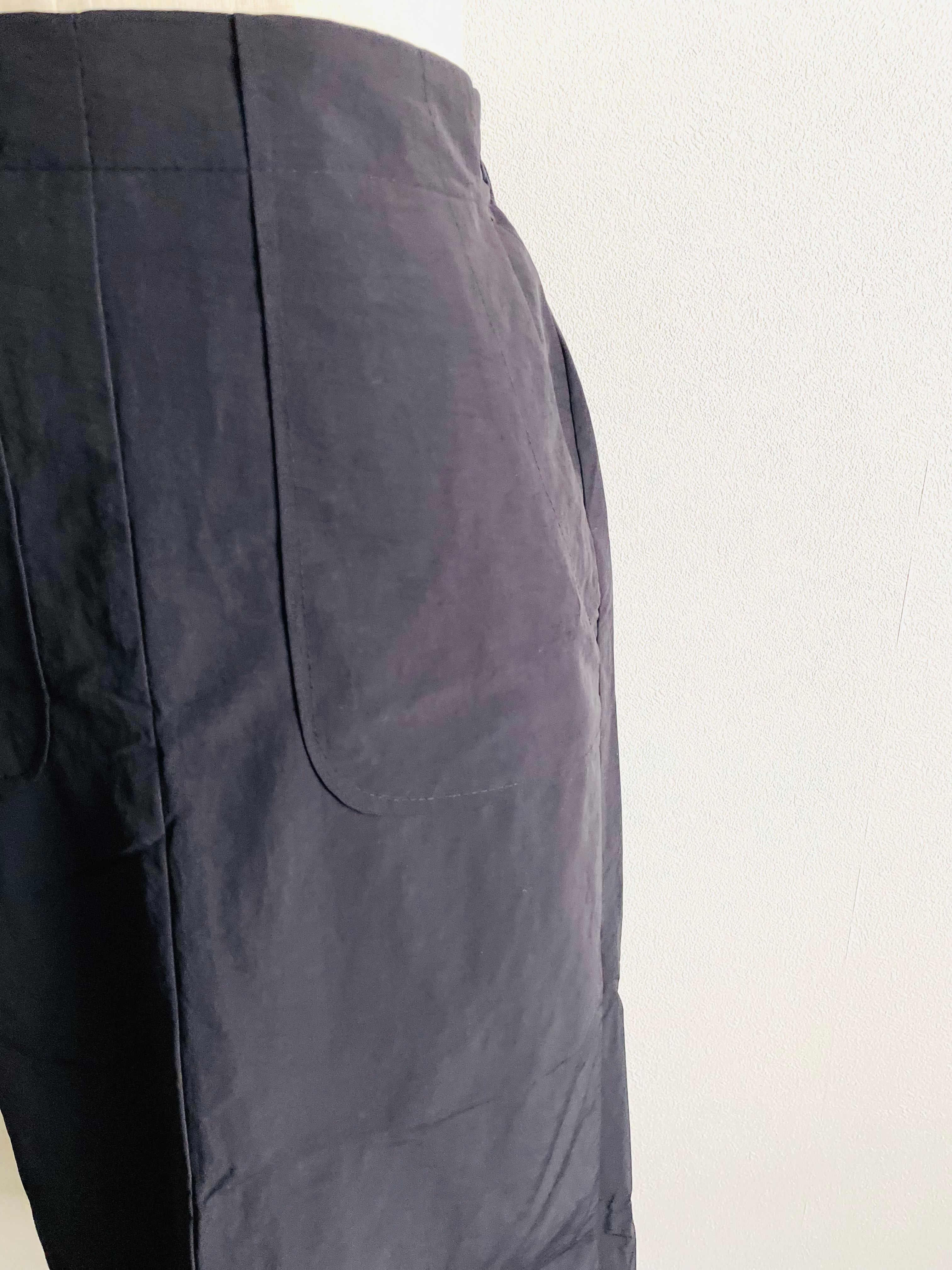 ウエストはゴム仕様なのに、少しハイウエストの位置で履くとスッキリ細身のシルエットになります。両サイドにある大きめのポケットもデザインの特徴です。