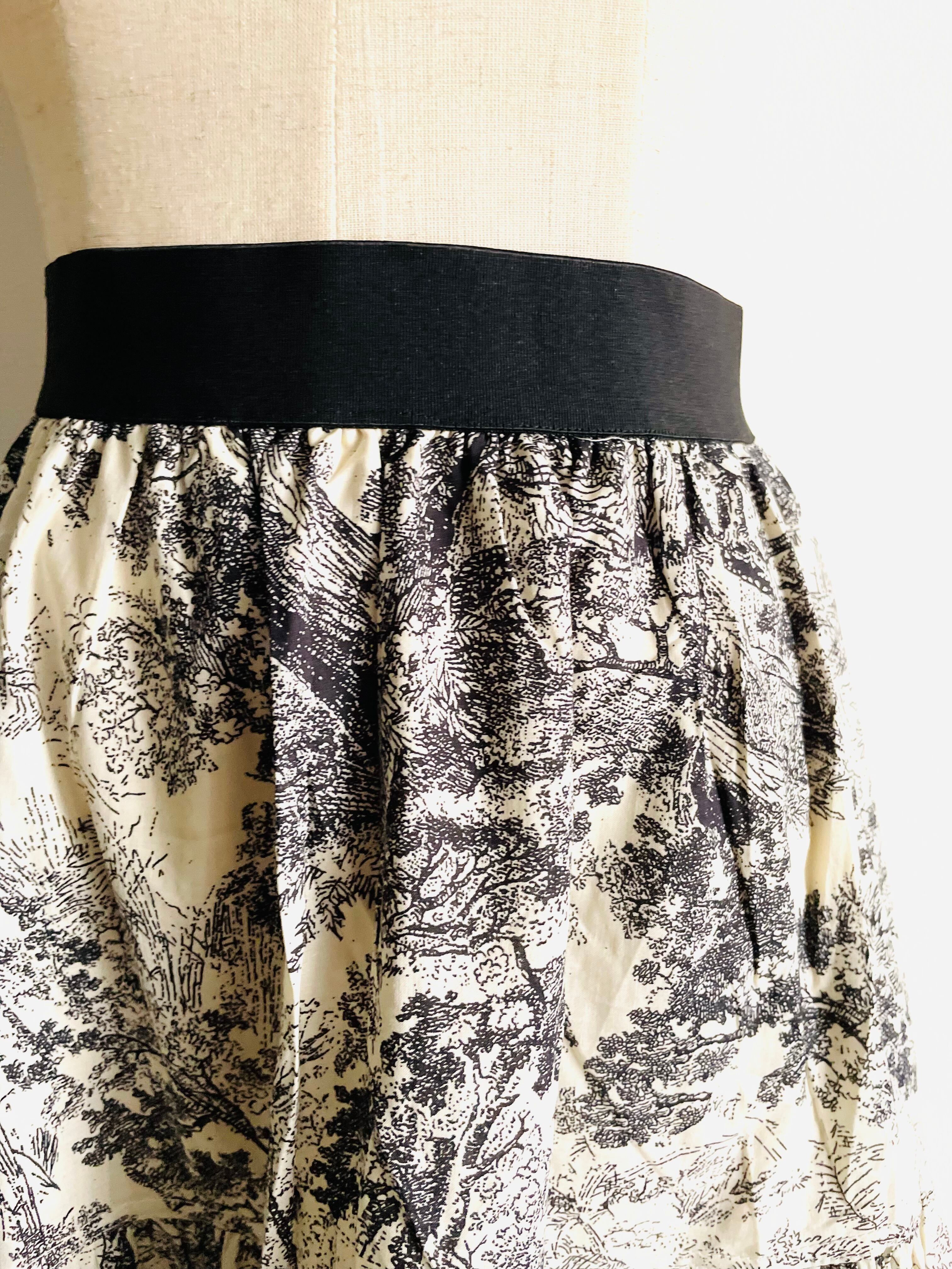 クラシカルなアンティーク調で描かれたモノクロの草木などのモチーフが特徴のティアードスカート。