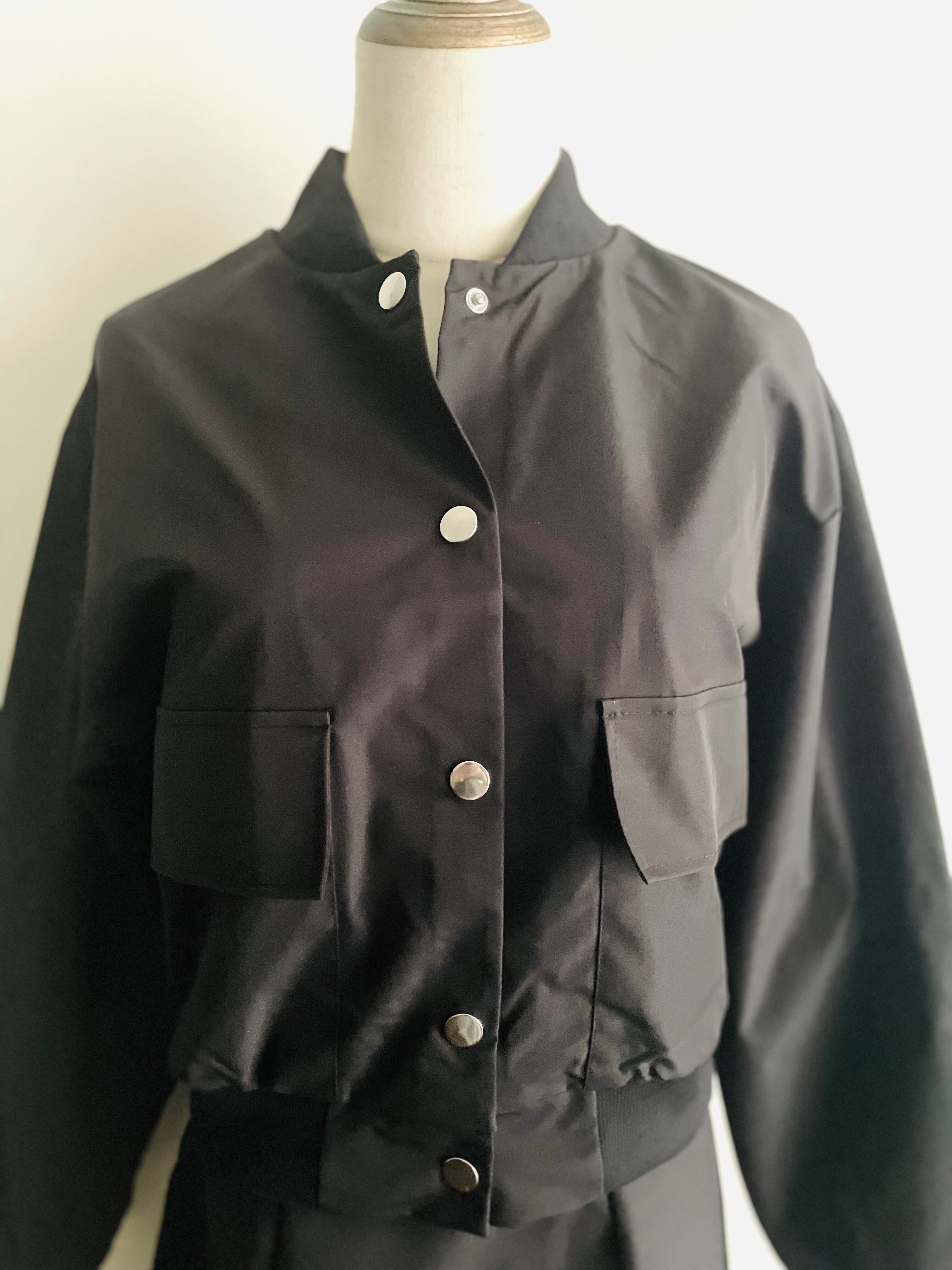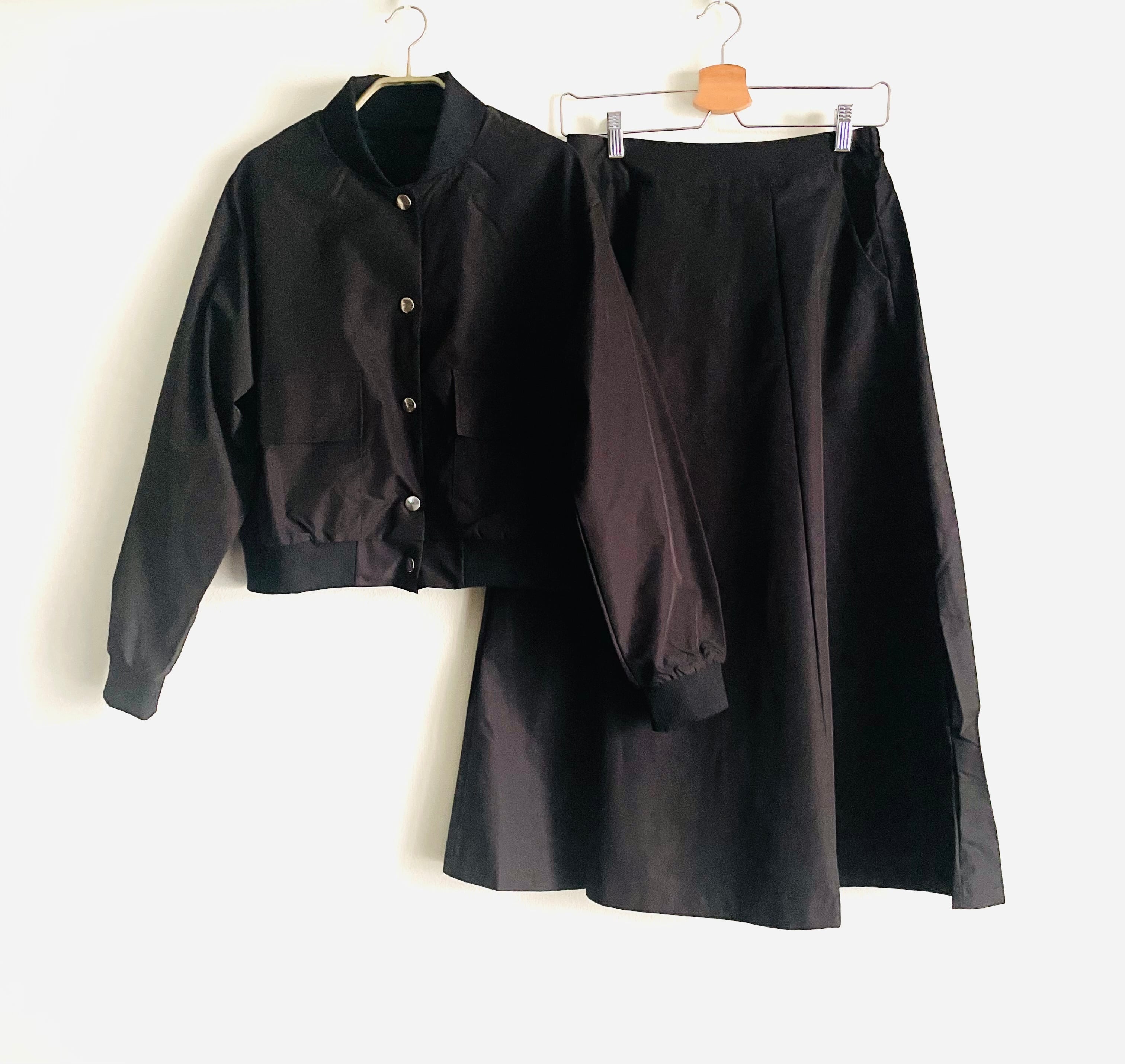 ブルゾンはボタン仕様でフロントに大きめのポケットが二か所ついています。スカートはAラインシルエットで、ウエストはゴム仕様、サイドにポケットが2つあります。