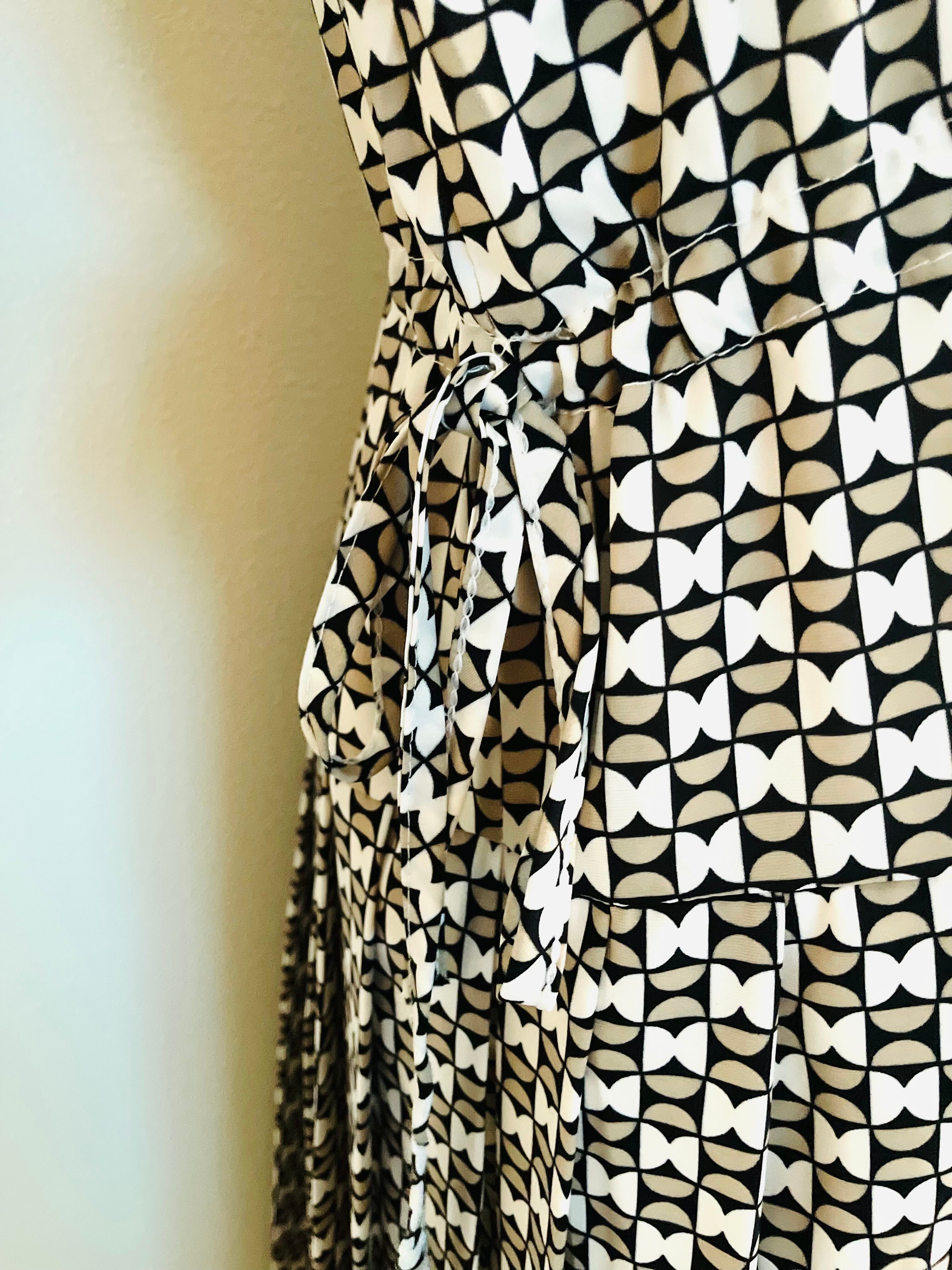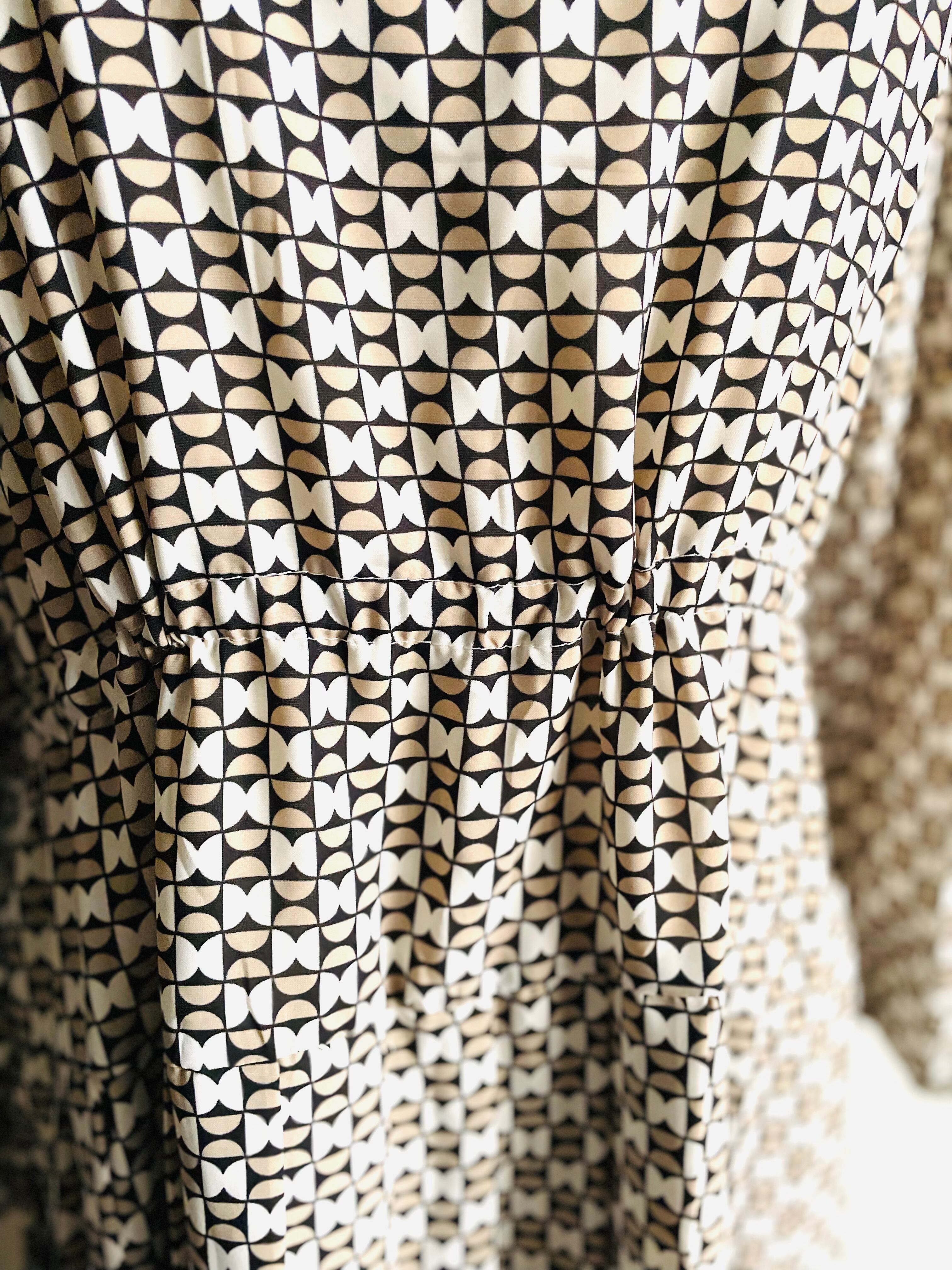 シックな幾何学模様のポリエステル100%素材ワンピース。