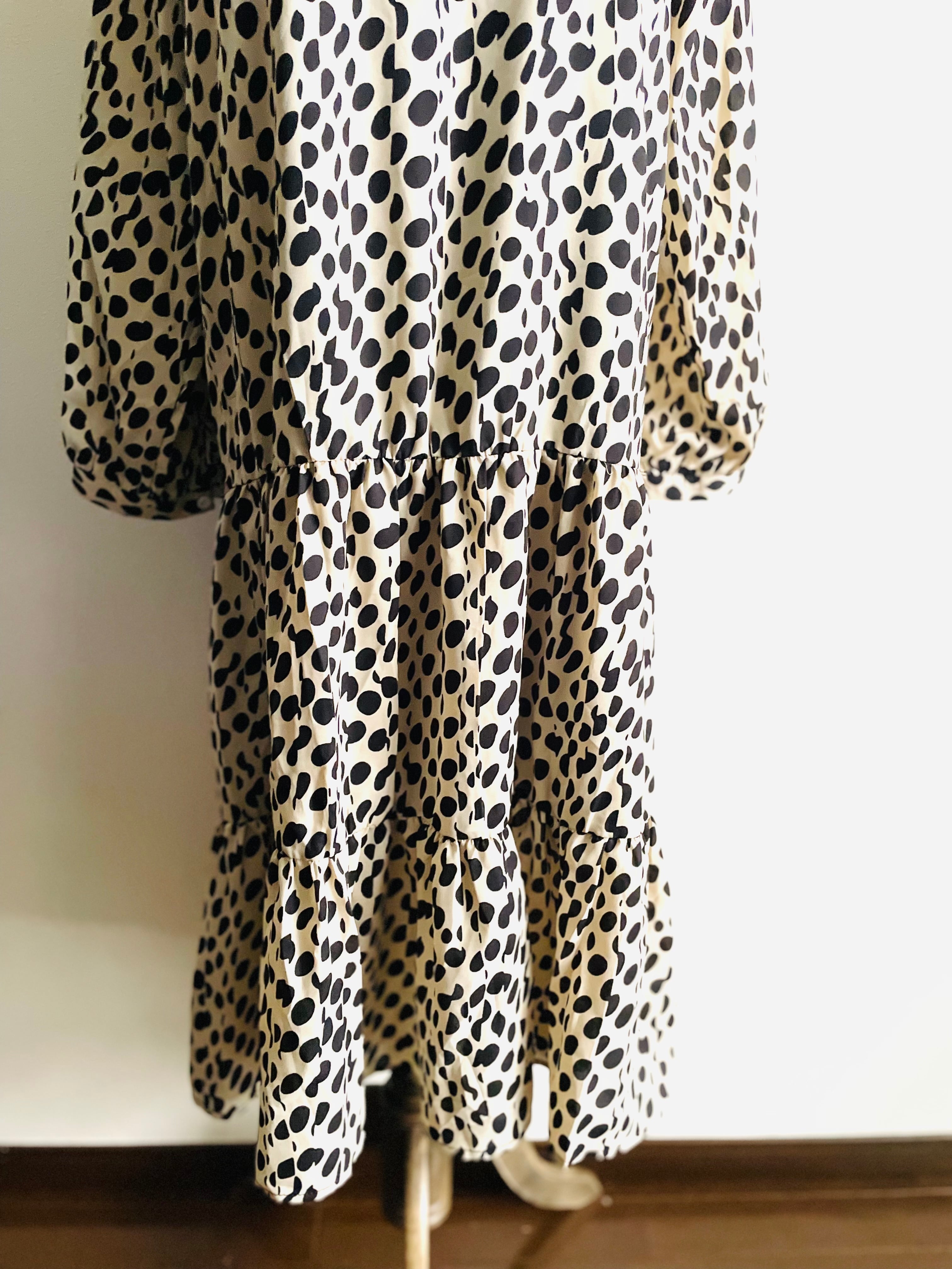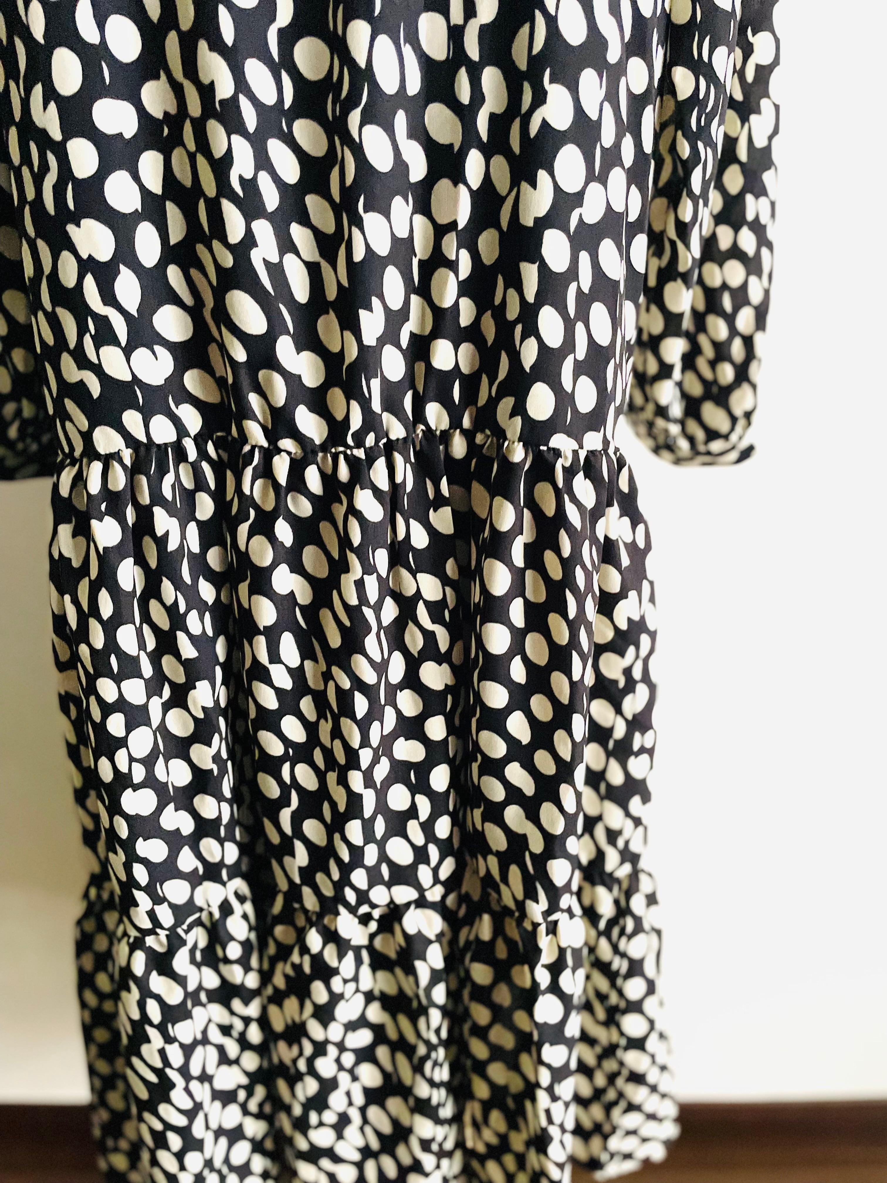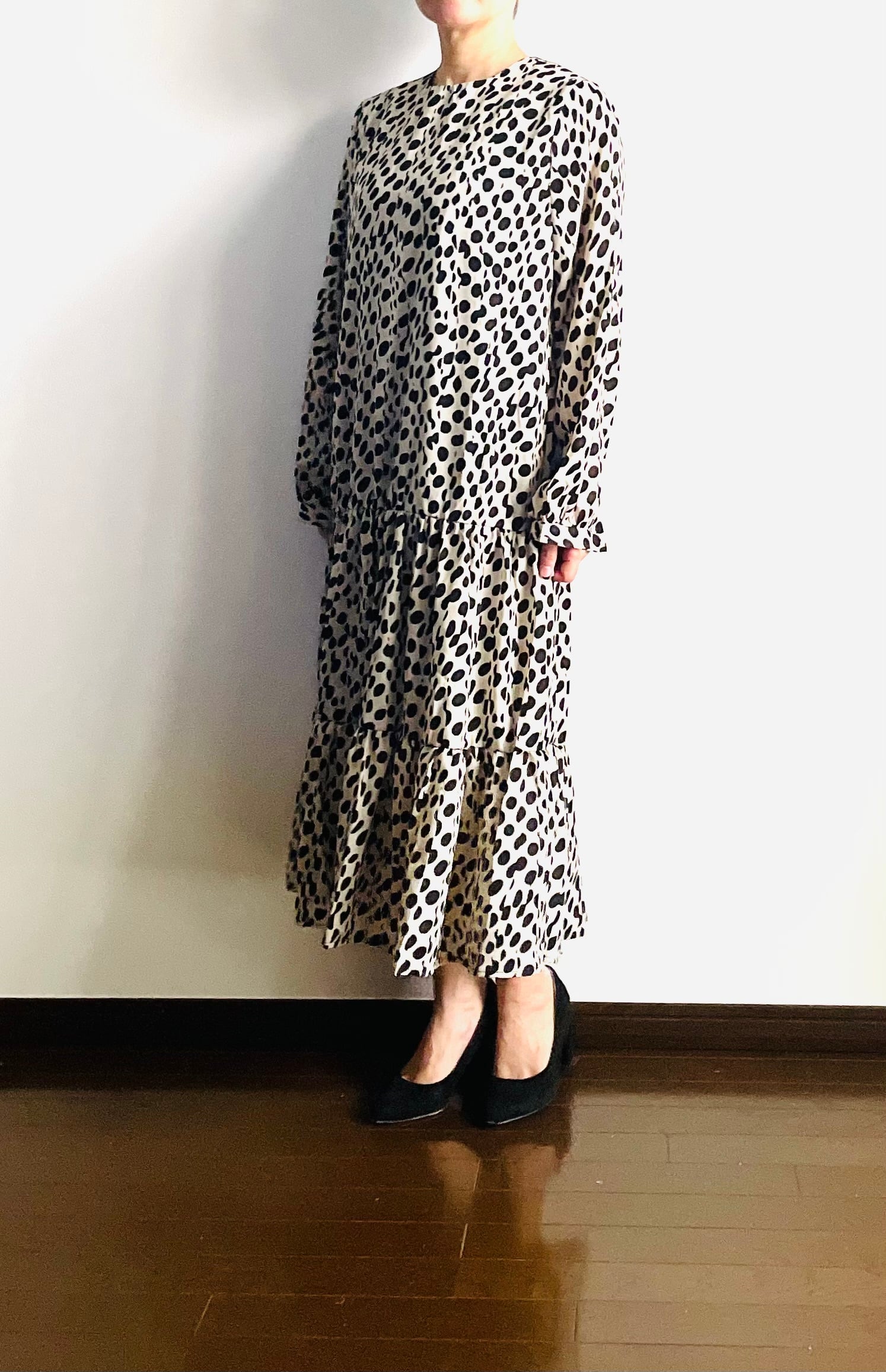 トップスはゆったりとしたストレートシルエットで、ヒップのあたりからティアードフレアが2段で施されたデザインです。
