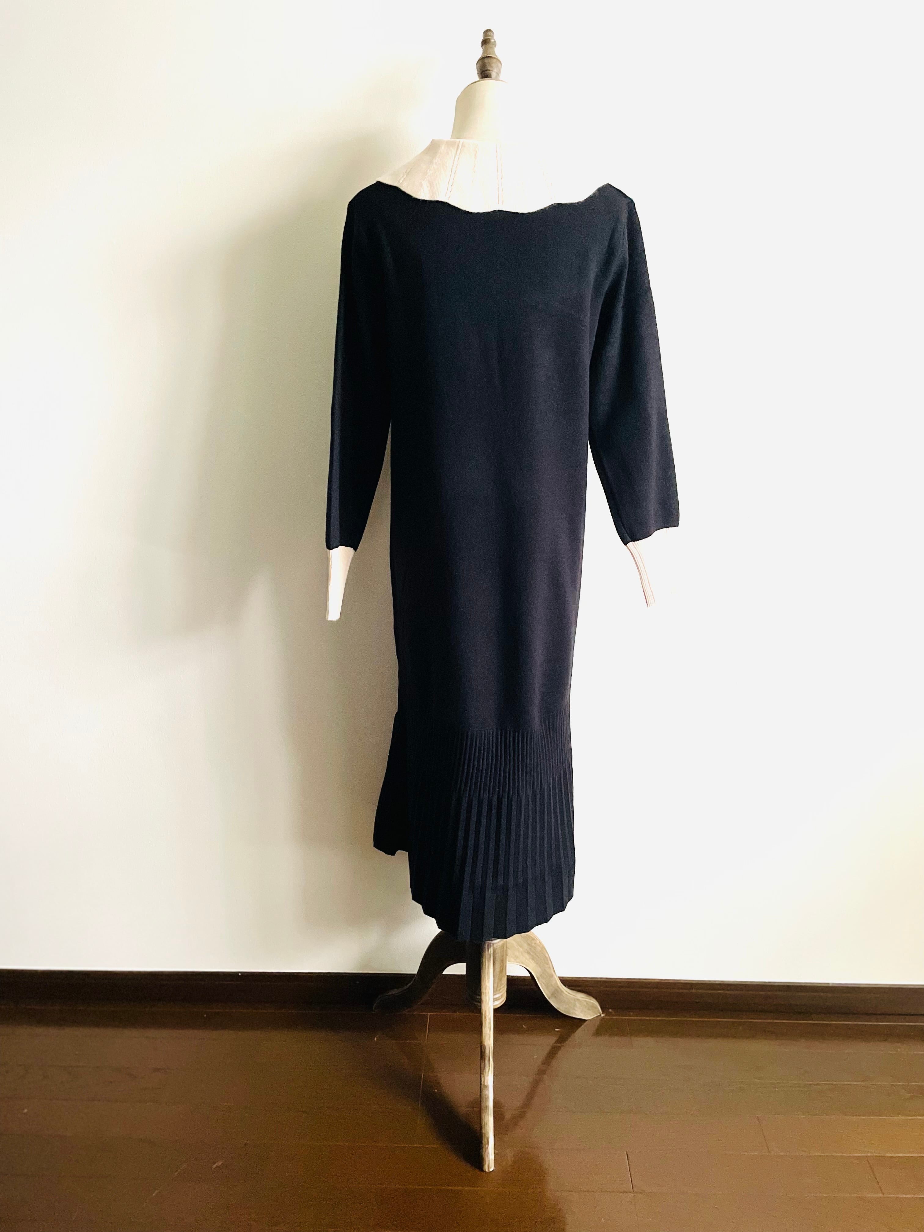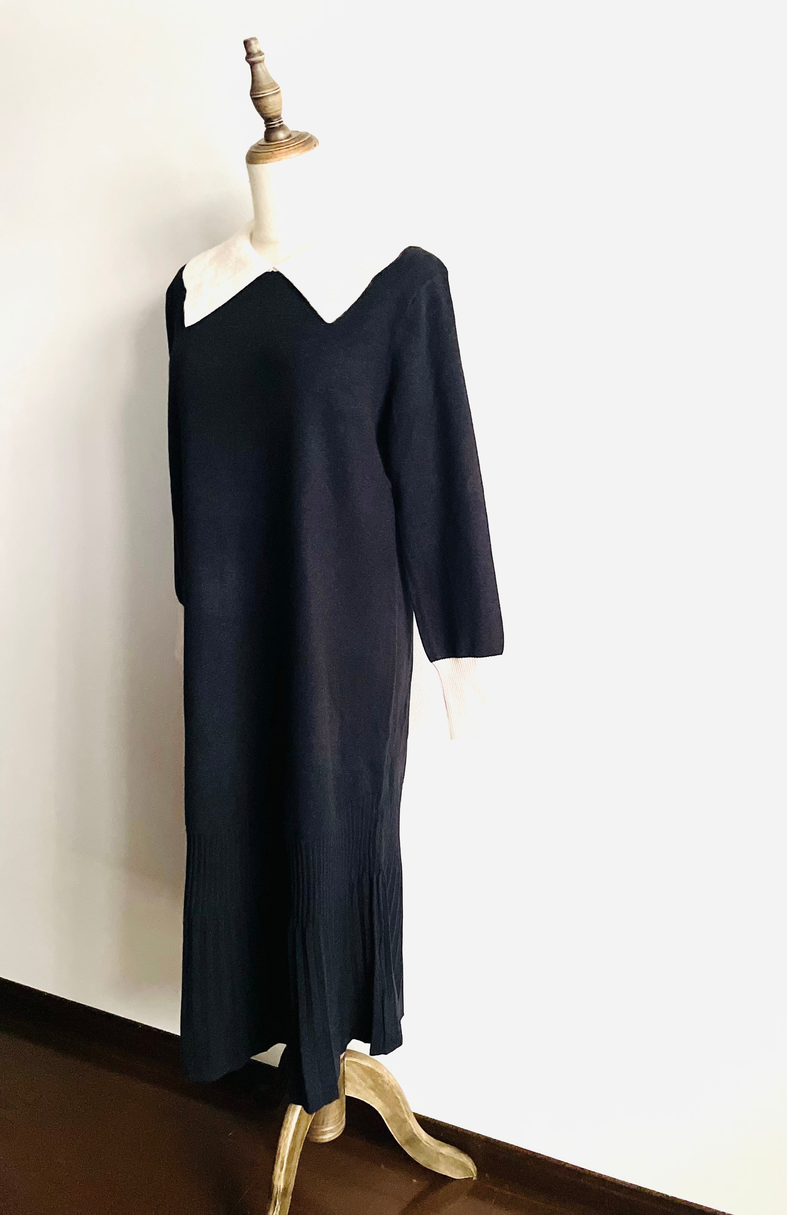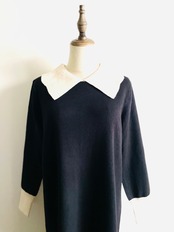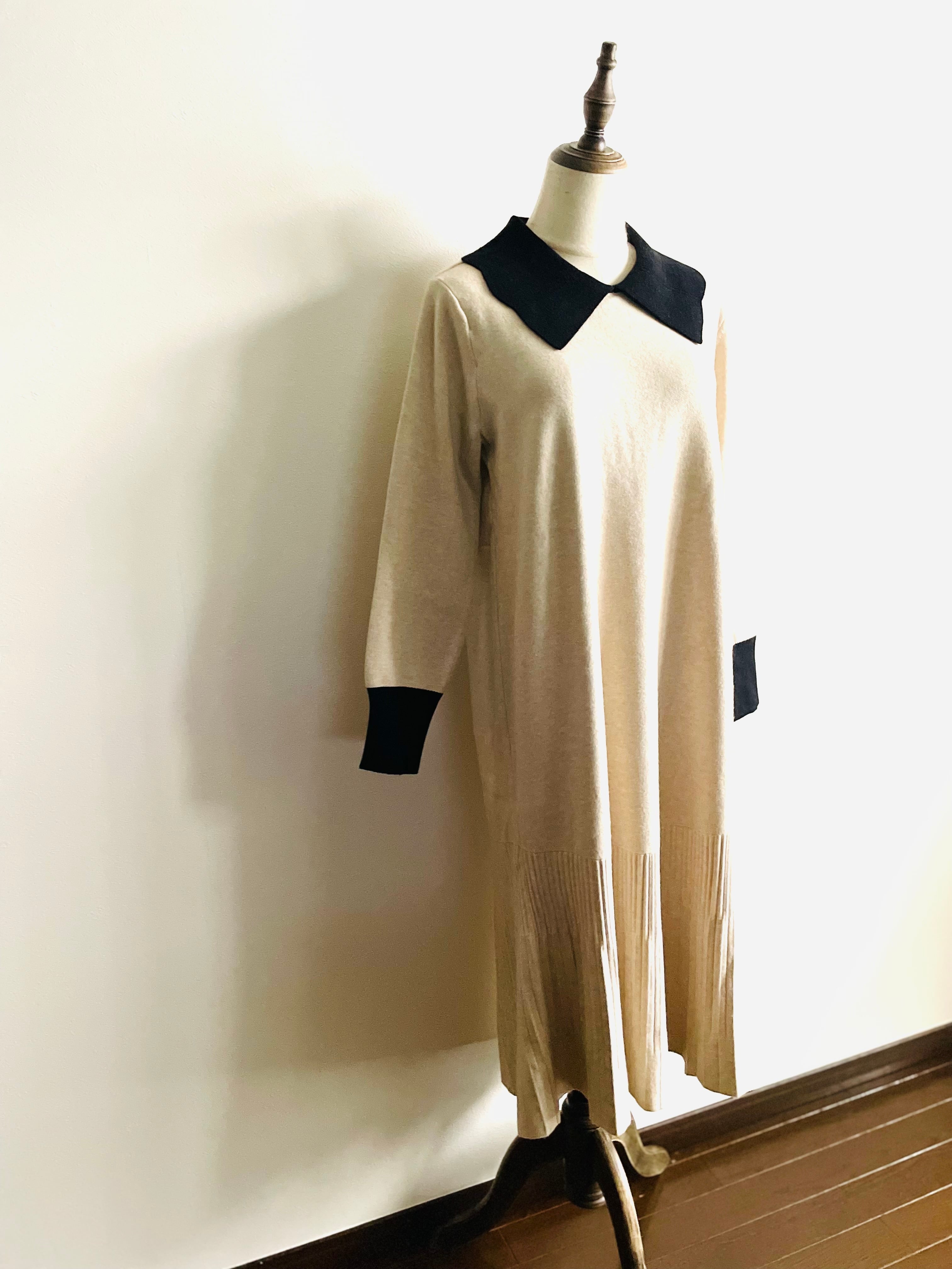 バイカラーの大きな襟と袖が特徴のニットワンピース。