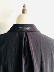 また、後ろの襟首には樹脂素材のネームプレートがワンポイントになった特徴あるデザインです。袖はギャザーの入ったラウンドタイプで、七分の長さです。