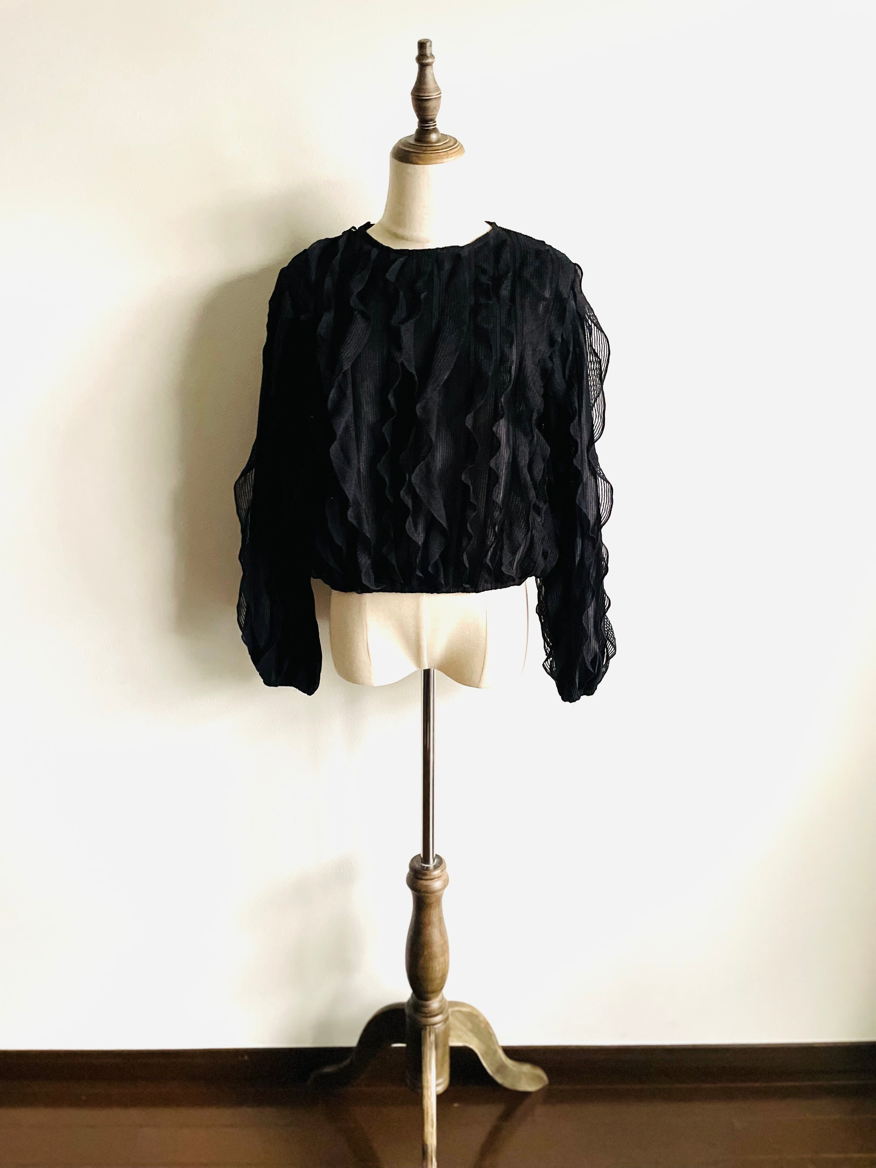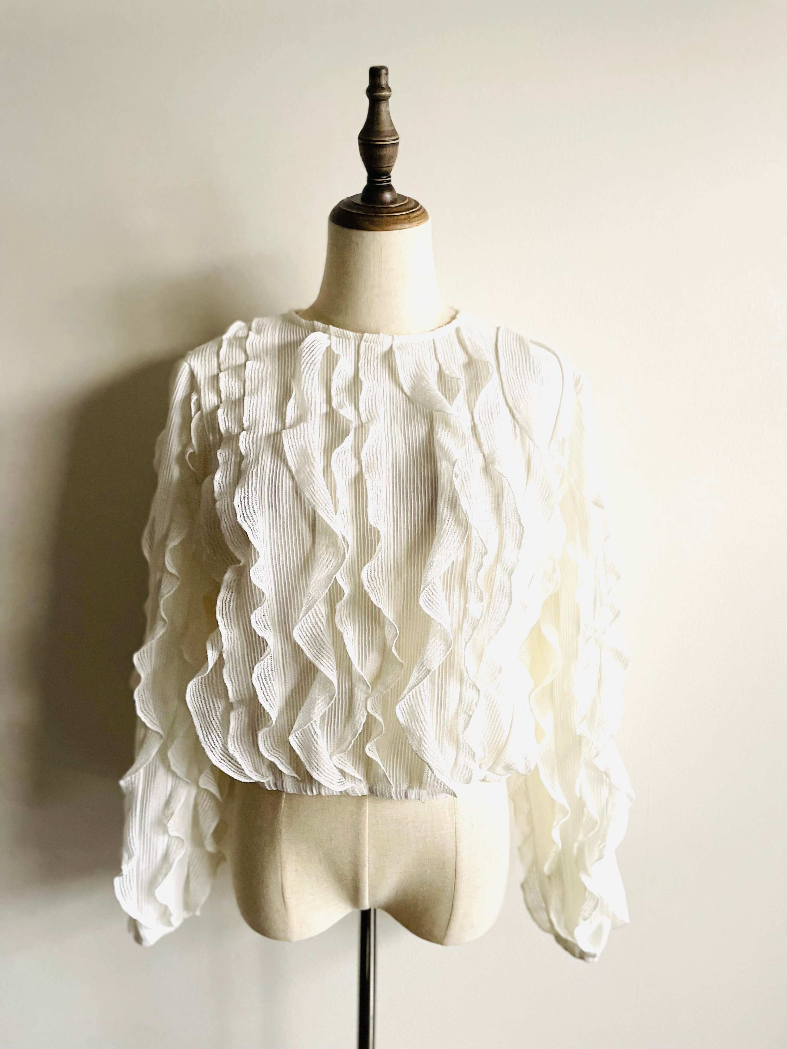 ゴムレースで施されたスパイラルフリルの長袖ニットブラウス。