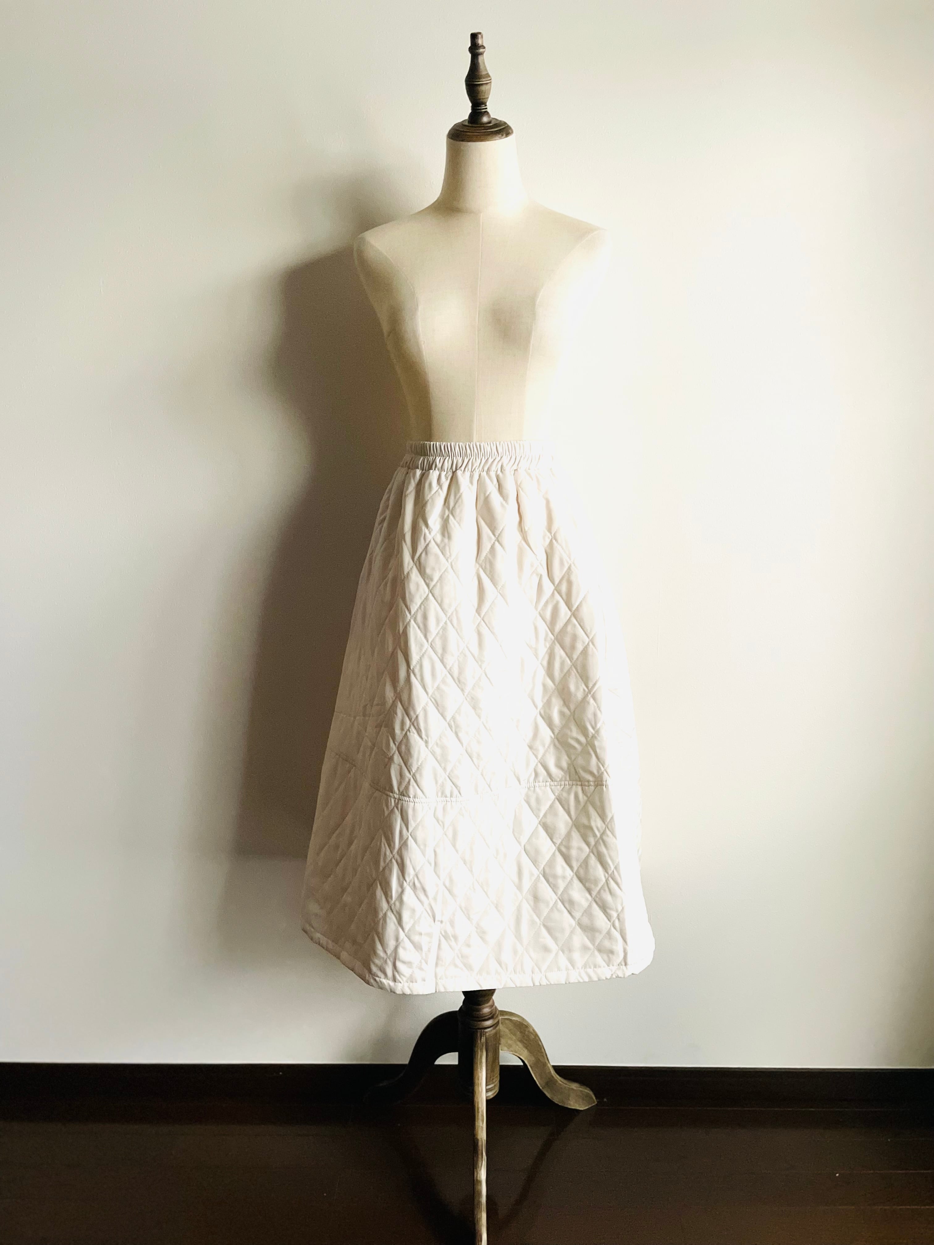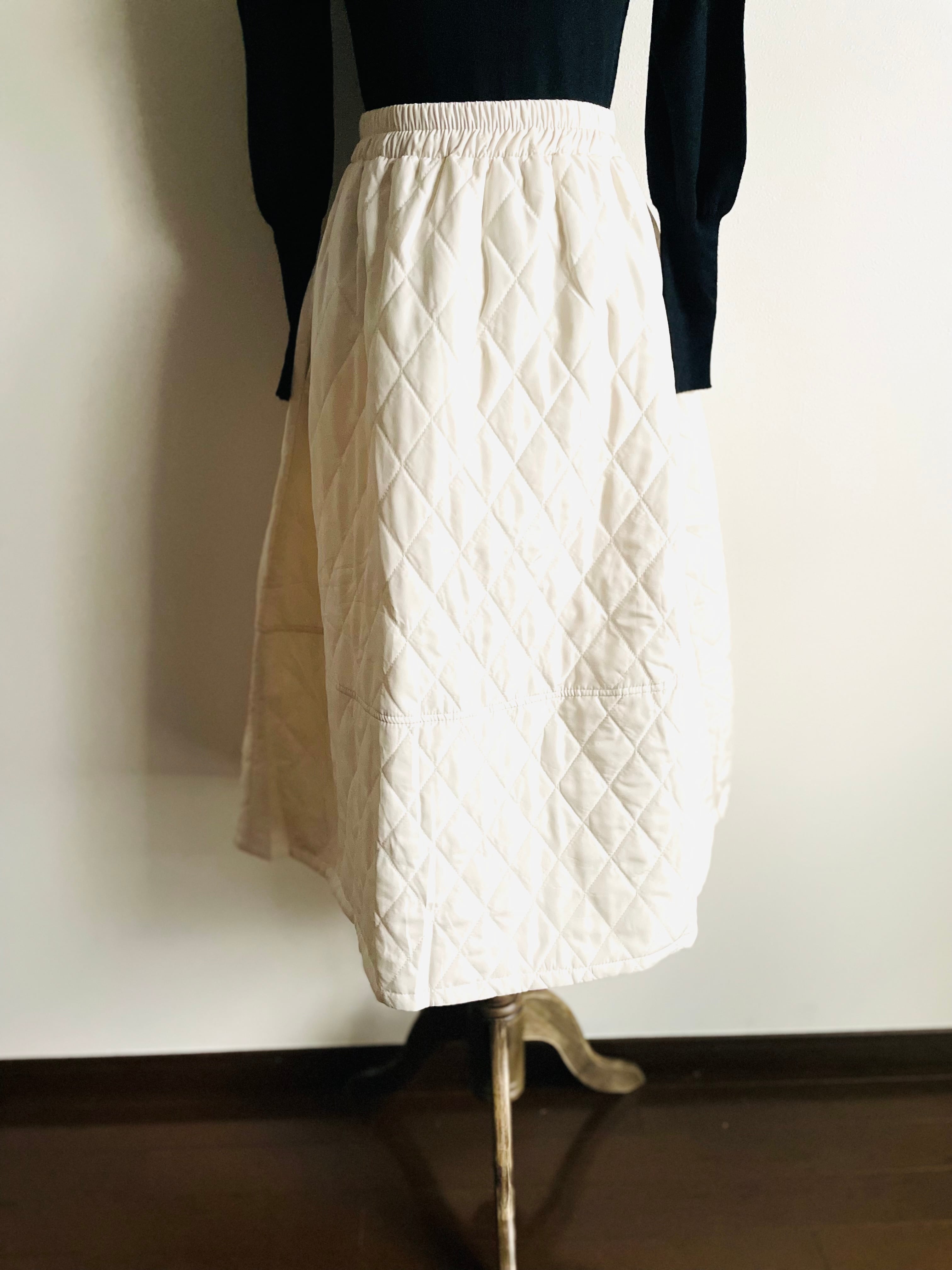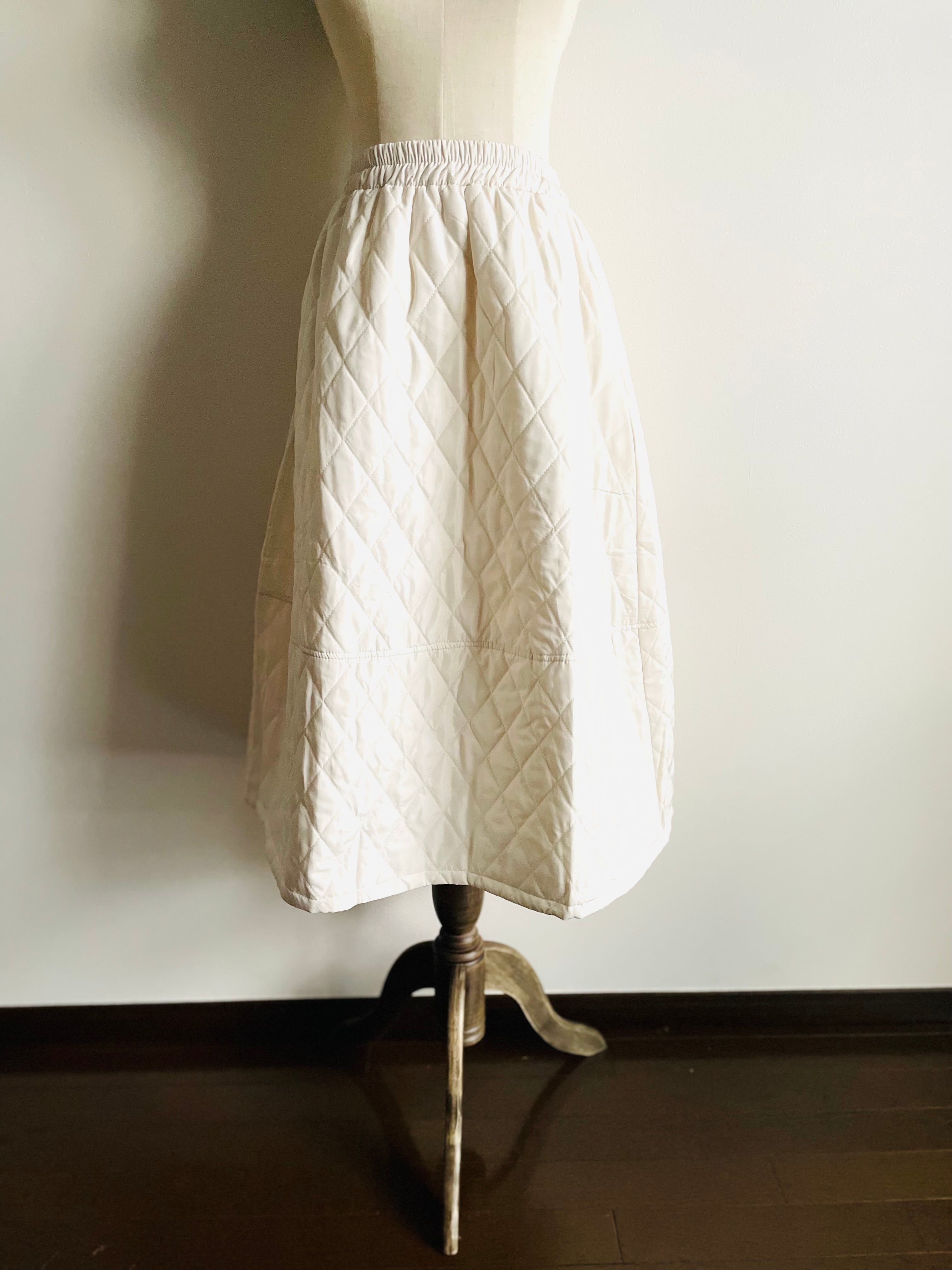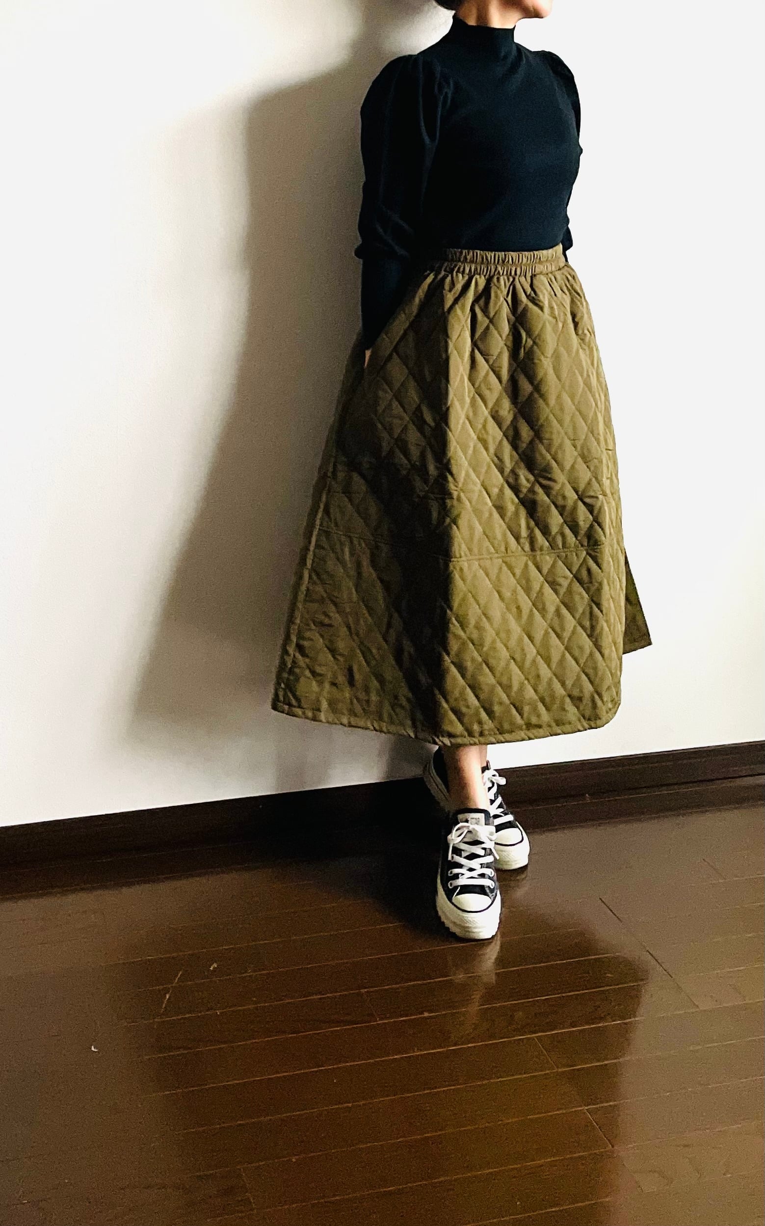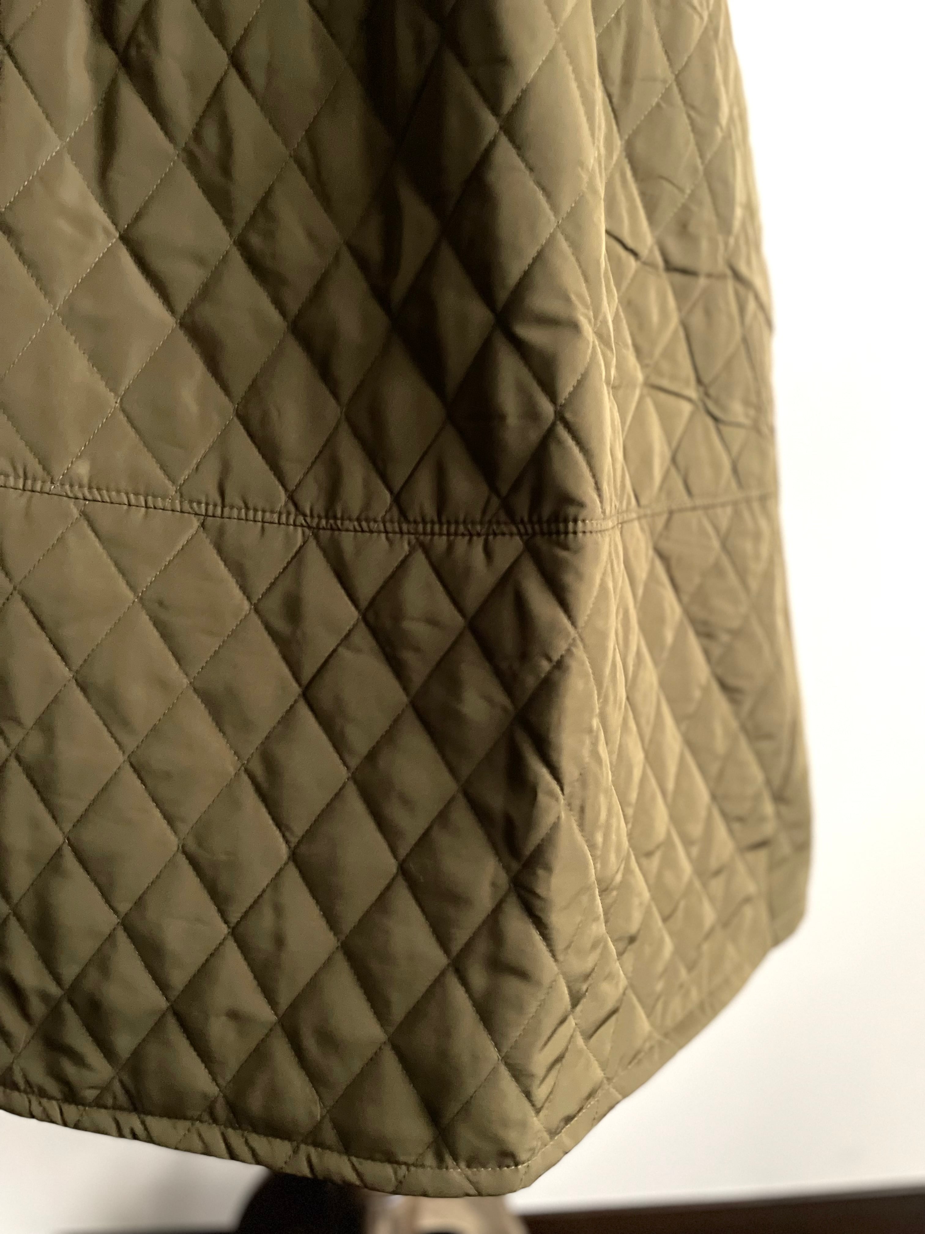 ふんわりとしたシルエットで、切り替えがあるので広がり過ぎず、とてもバランス良く使えます。ポケットはサイドに2か所あり、キルティング素材で裏地も一緒に縫われているので保温性も高く、この冬に重宝する一枚です。