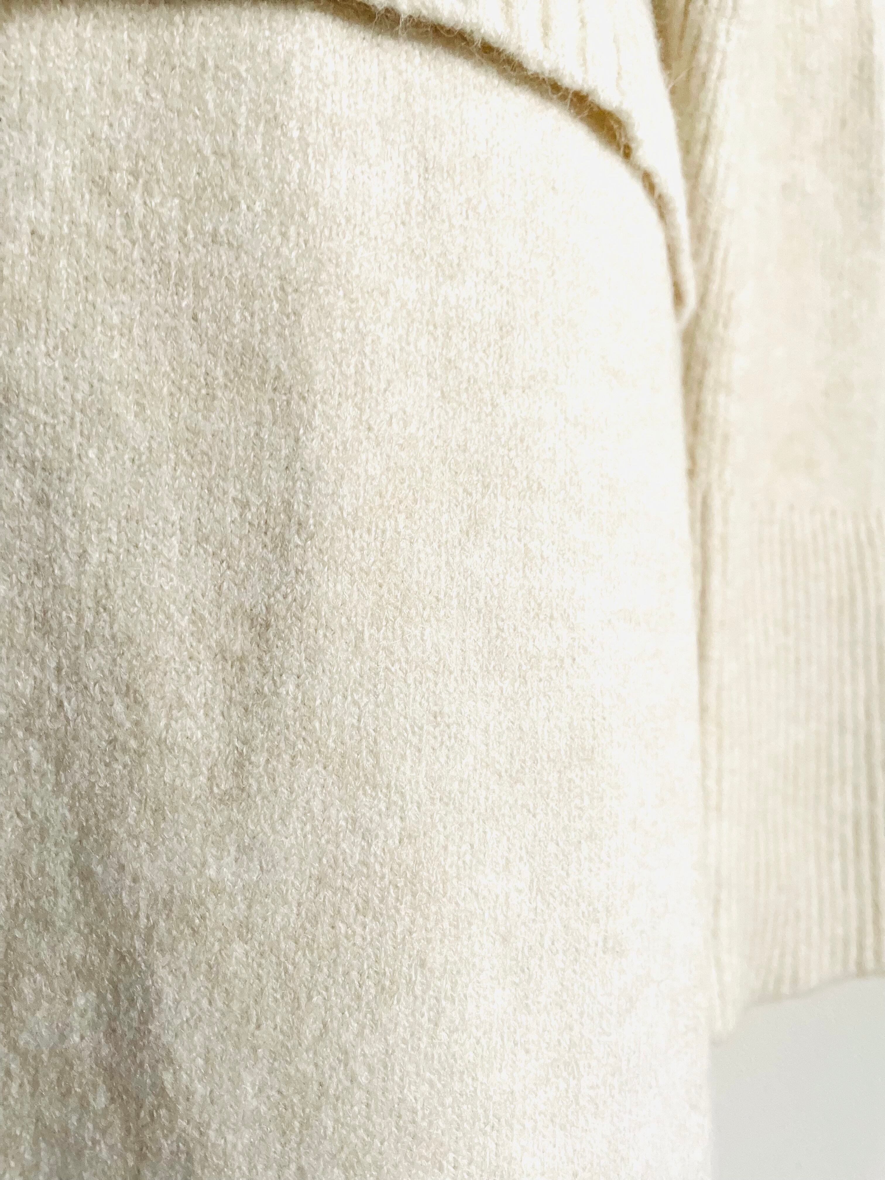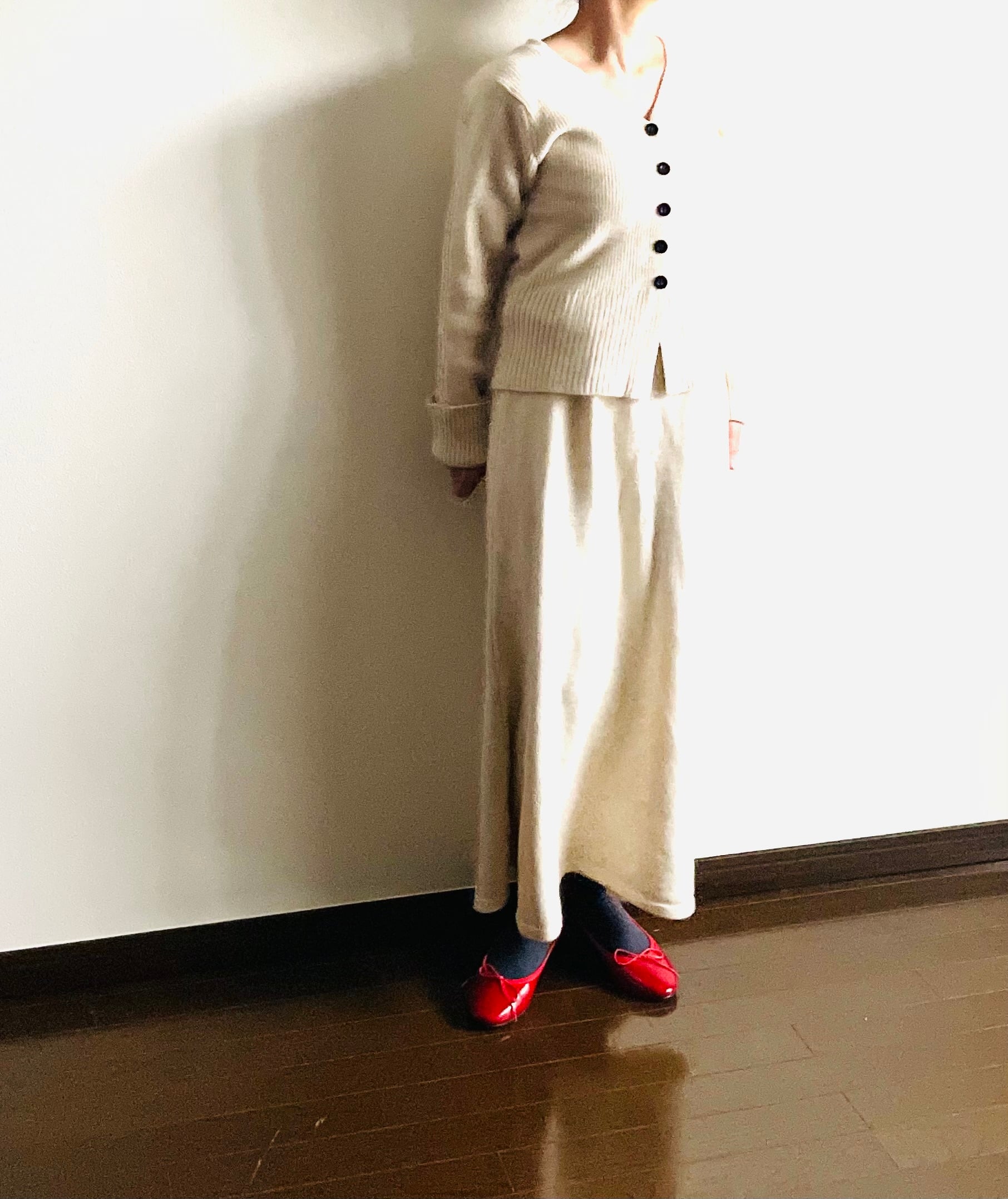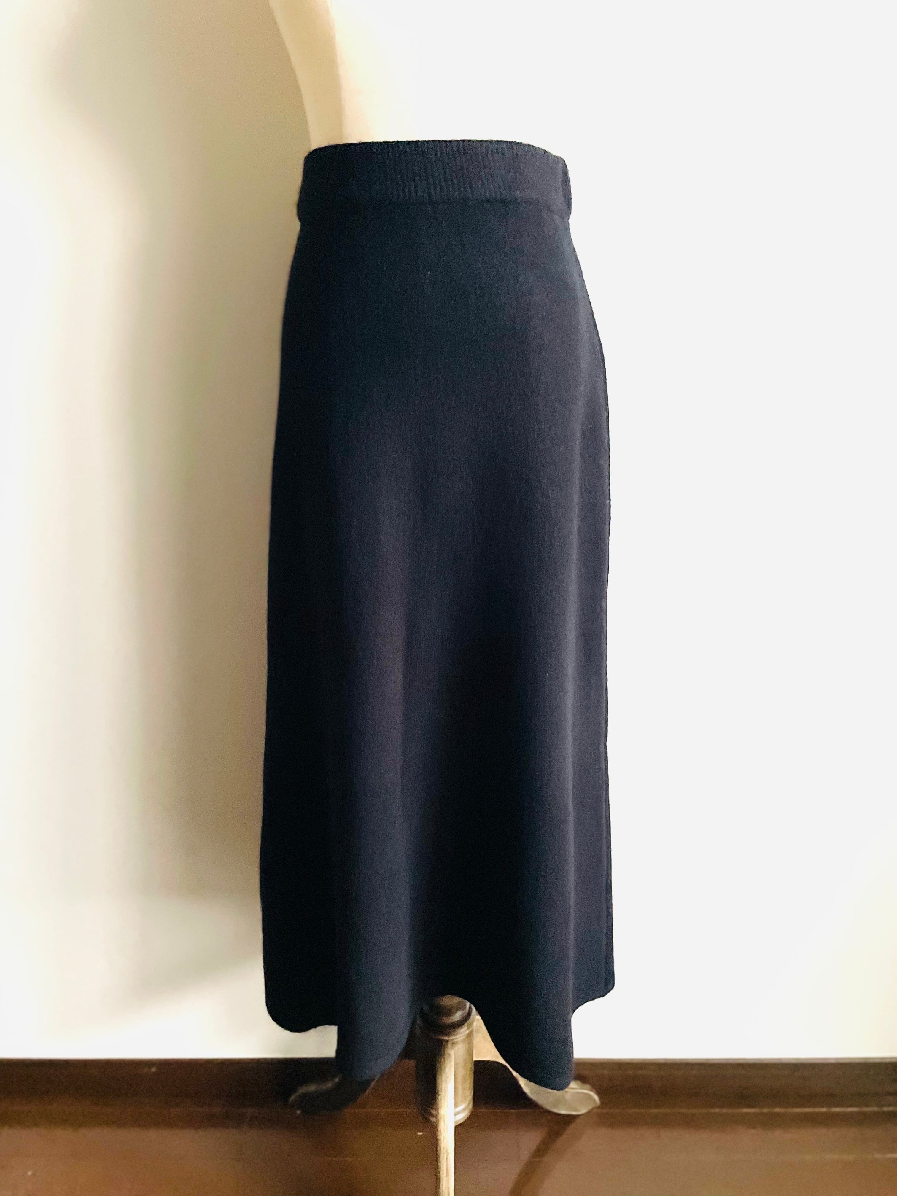 ニットスカートはウエストはゴム仕様、シルエットは裾に広がるAラインタイプ、丈も長めなので高身長の方にもオススメです。