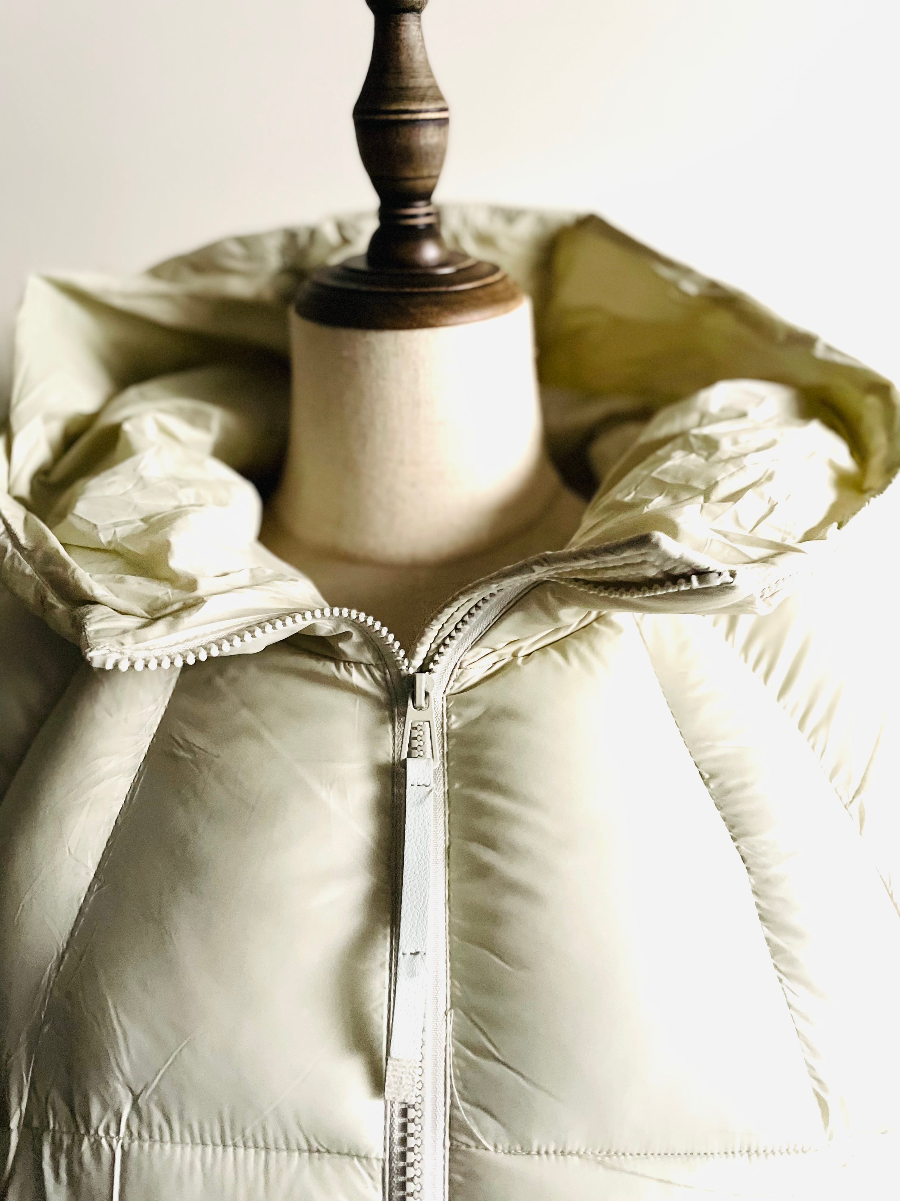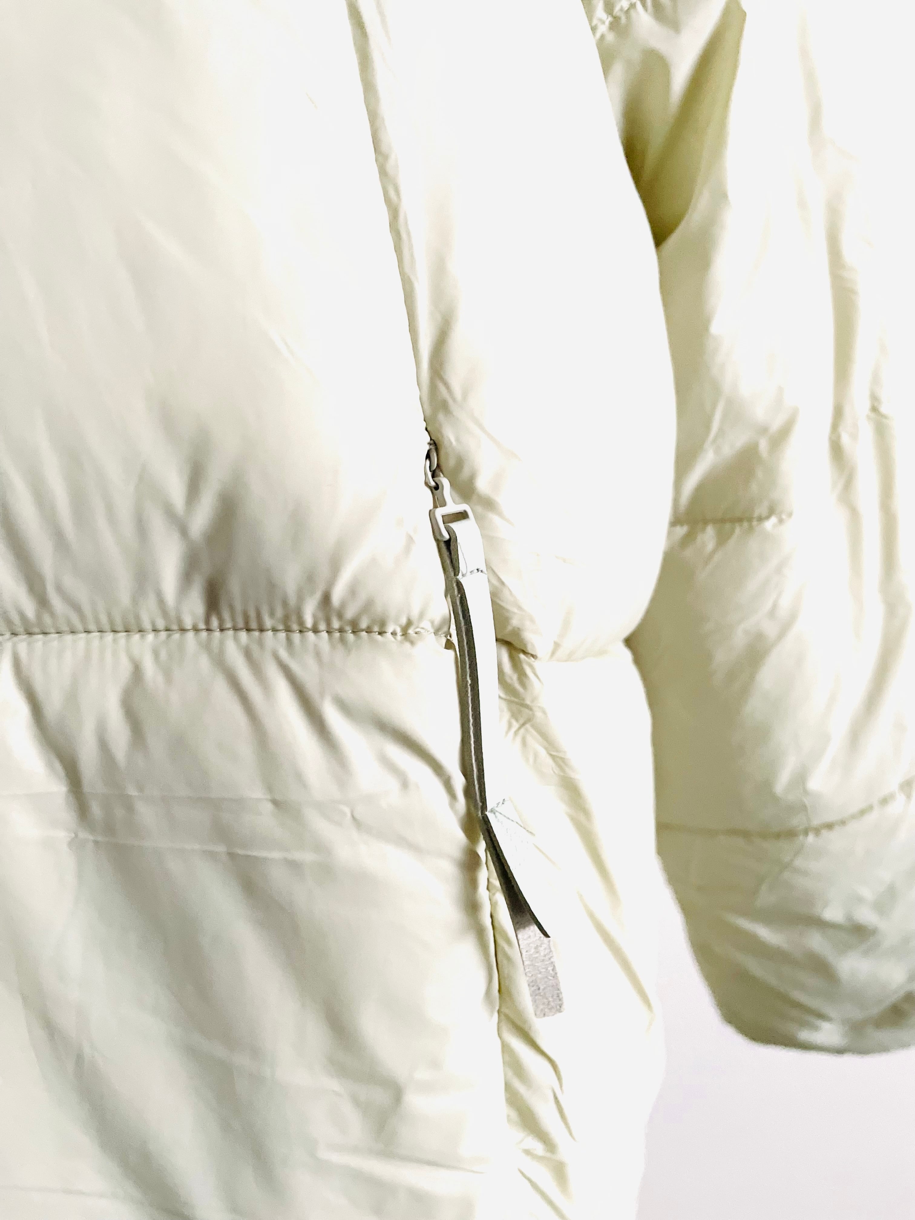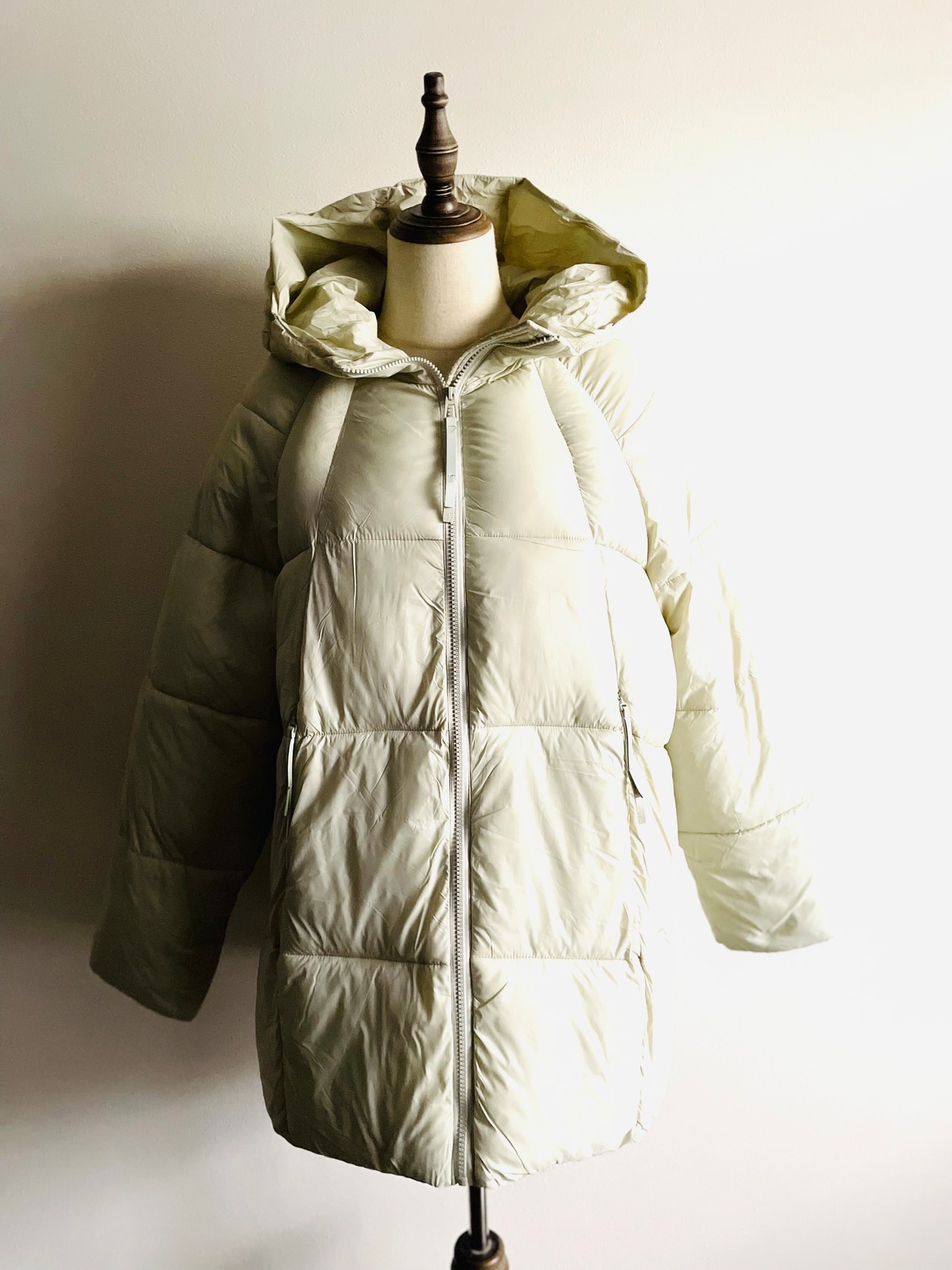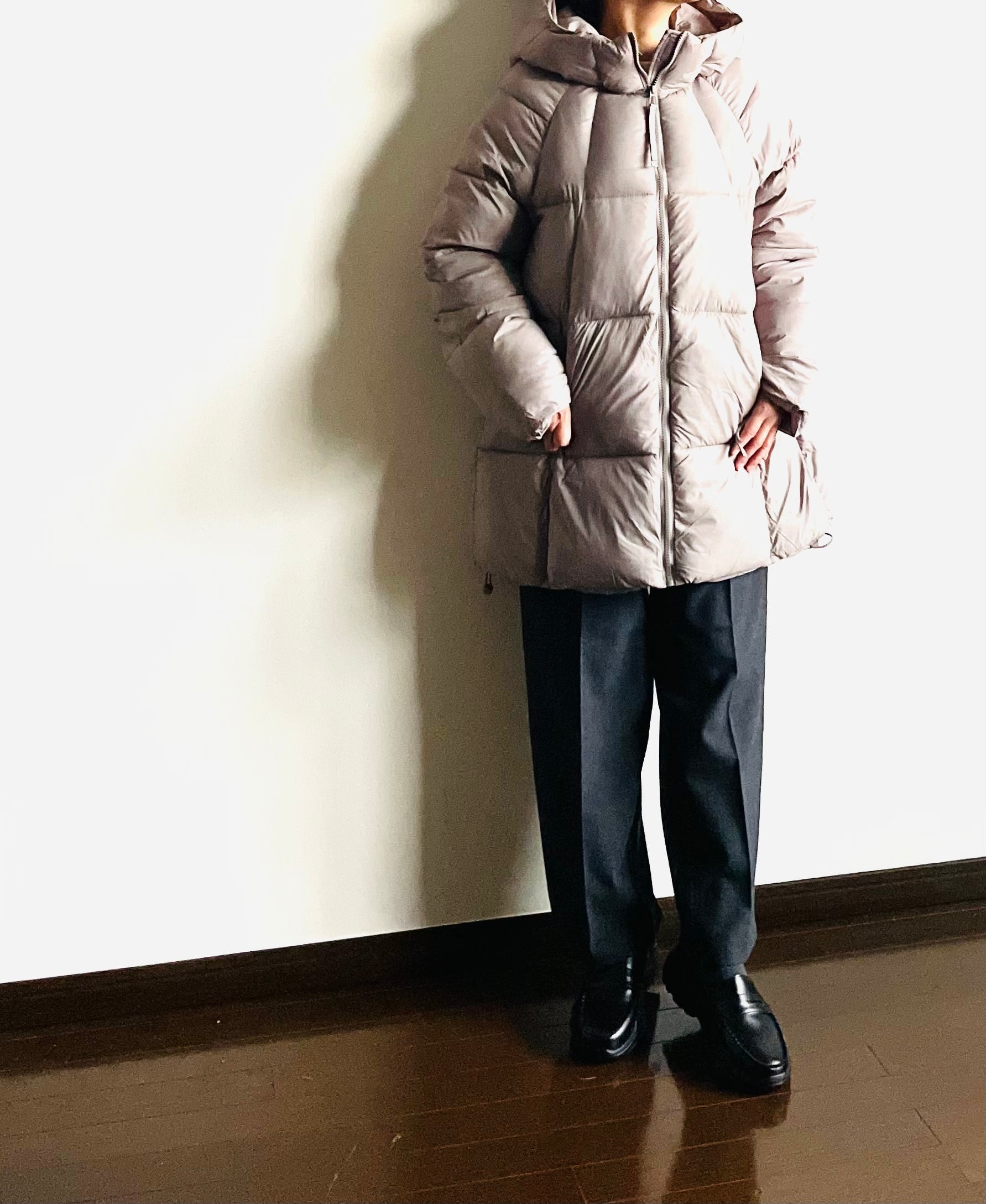 フードは一体型なので襟元も暖かく、フロントや両サイドのポケットにあるファスナーには合皮の取っ手があしらわれているのがポイントです。