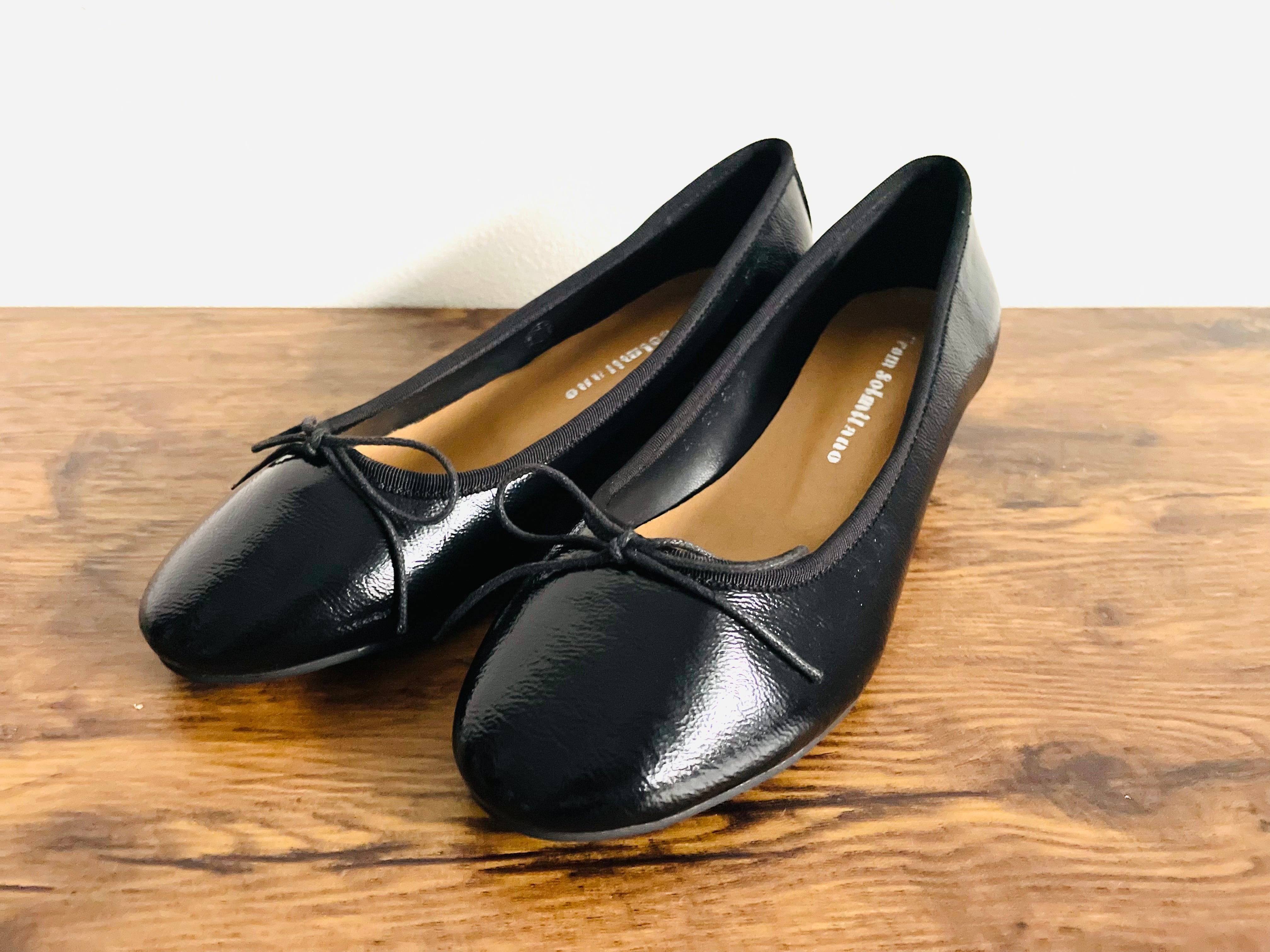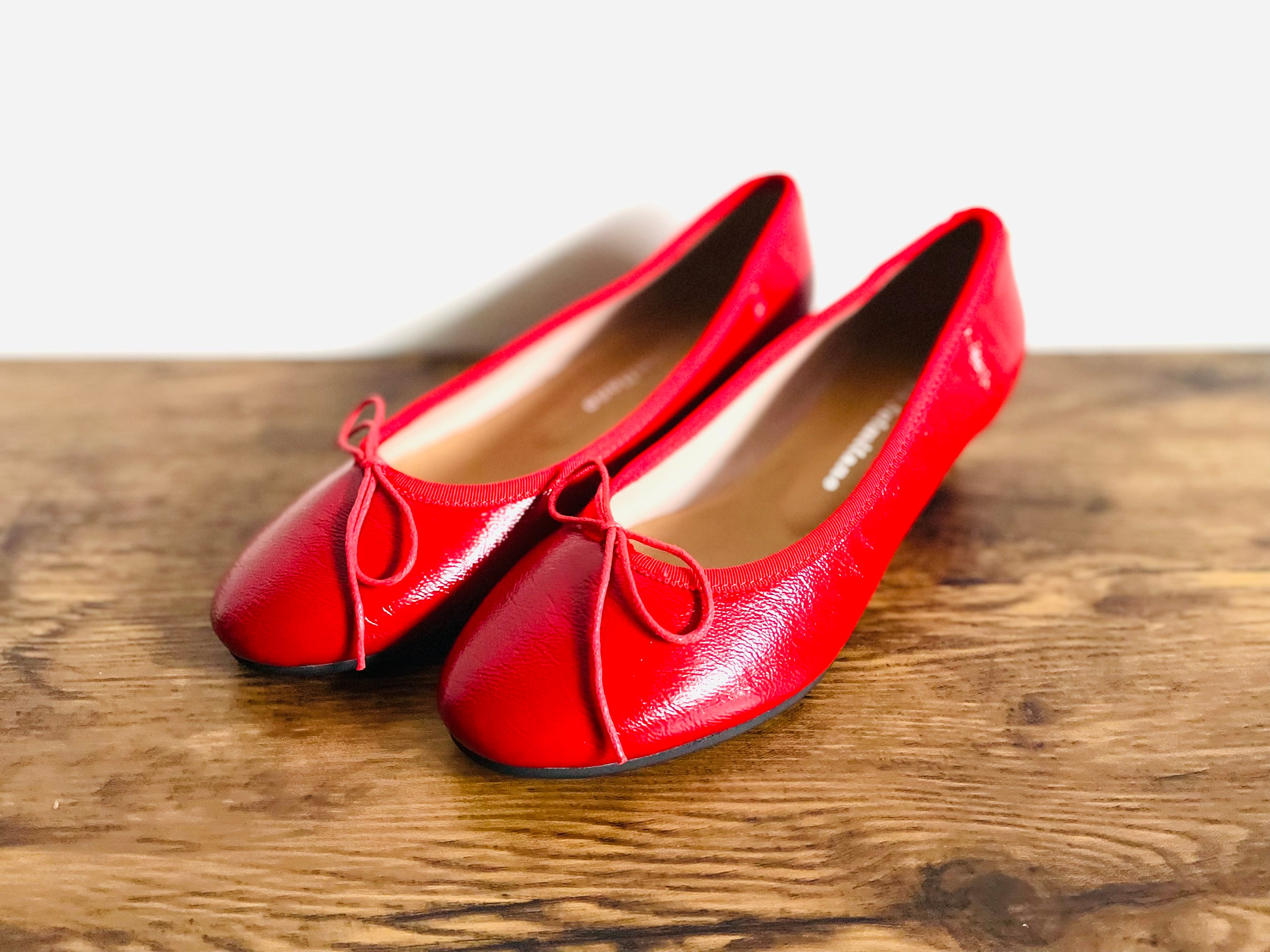 かかと部分の中敷きにクッションがあり、ヒールは3.5㎝の程よい高さなので、歩きやすいです。素材は合成皮革、カラーは光沢感のあるレッドとブラックの2色。サイズはそれぞれ23.0、23.5、24.0の3サイズです。
