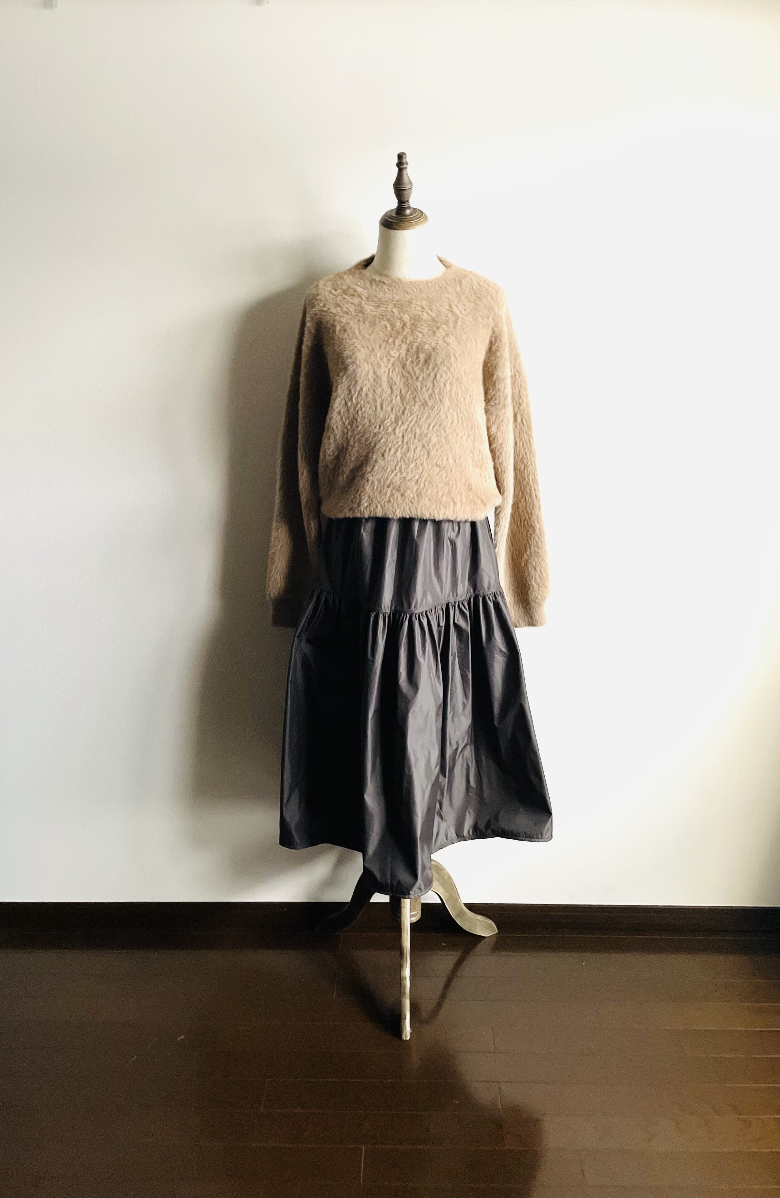 表面は張りのある厚手のナイロン素材が高級感を演出し、そして裏地は起毛生地でしっかりと暖かい仕様です。ふんわり広がるティアードタイプのシルエットなので、タイトなインナーやざっくりニットなど、様々なトップスに合わせられる優れもの! ウエストはゴム仕様で、両サイドにポケットがあるのも嬉しいポイントです。