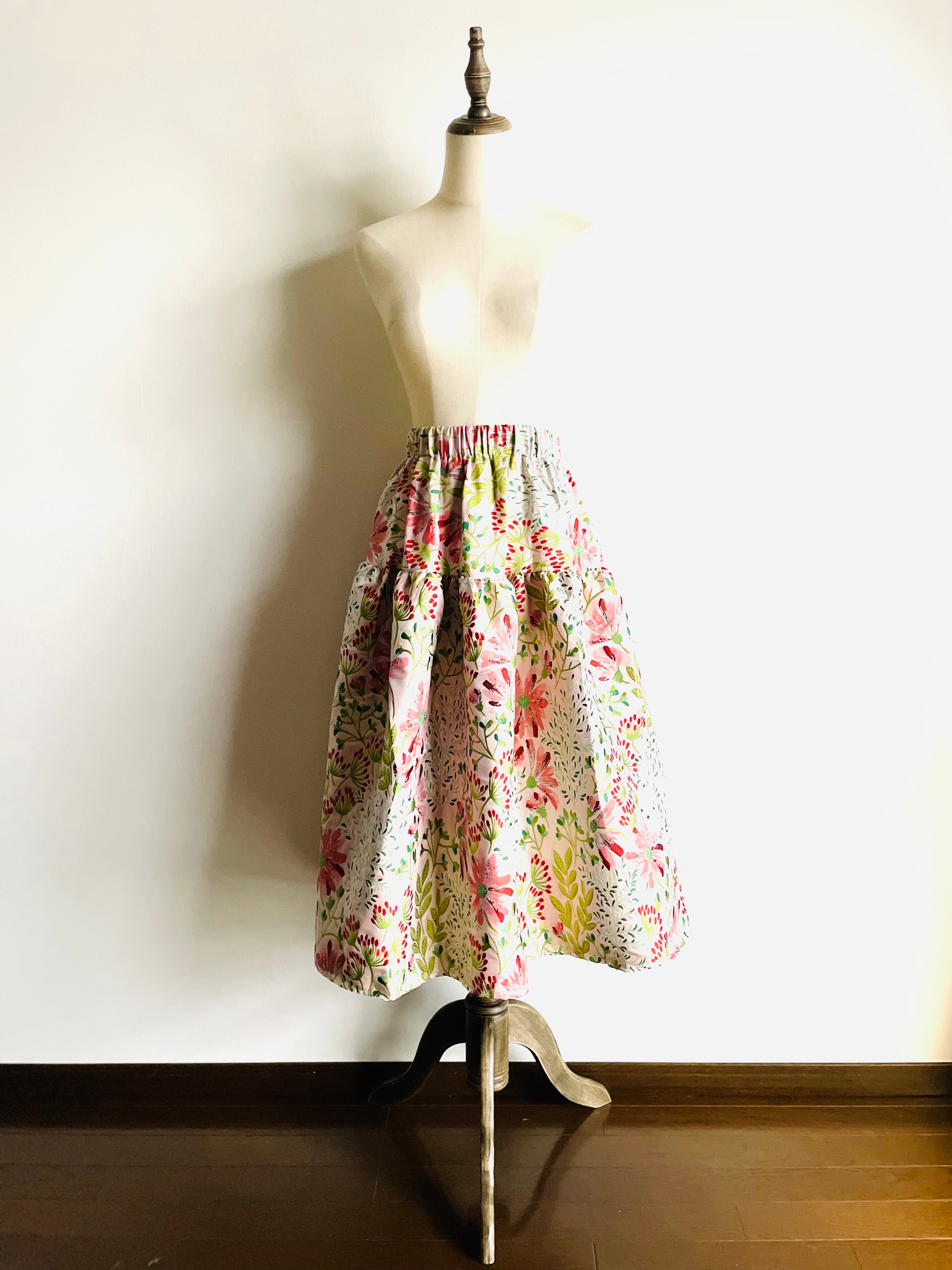 ふんわりとしたティアードシルエットで、光沢のある厚手のジャガード織りがとても高級感ある一枚です。ウエストはゴム仕様なのも嬉しいポイント。