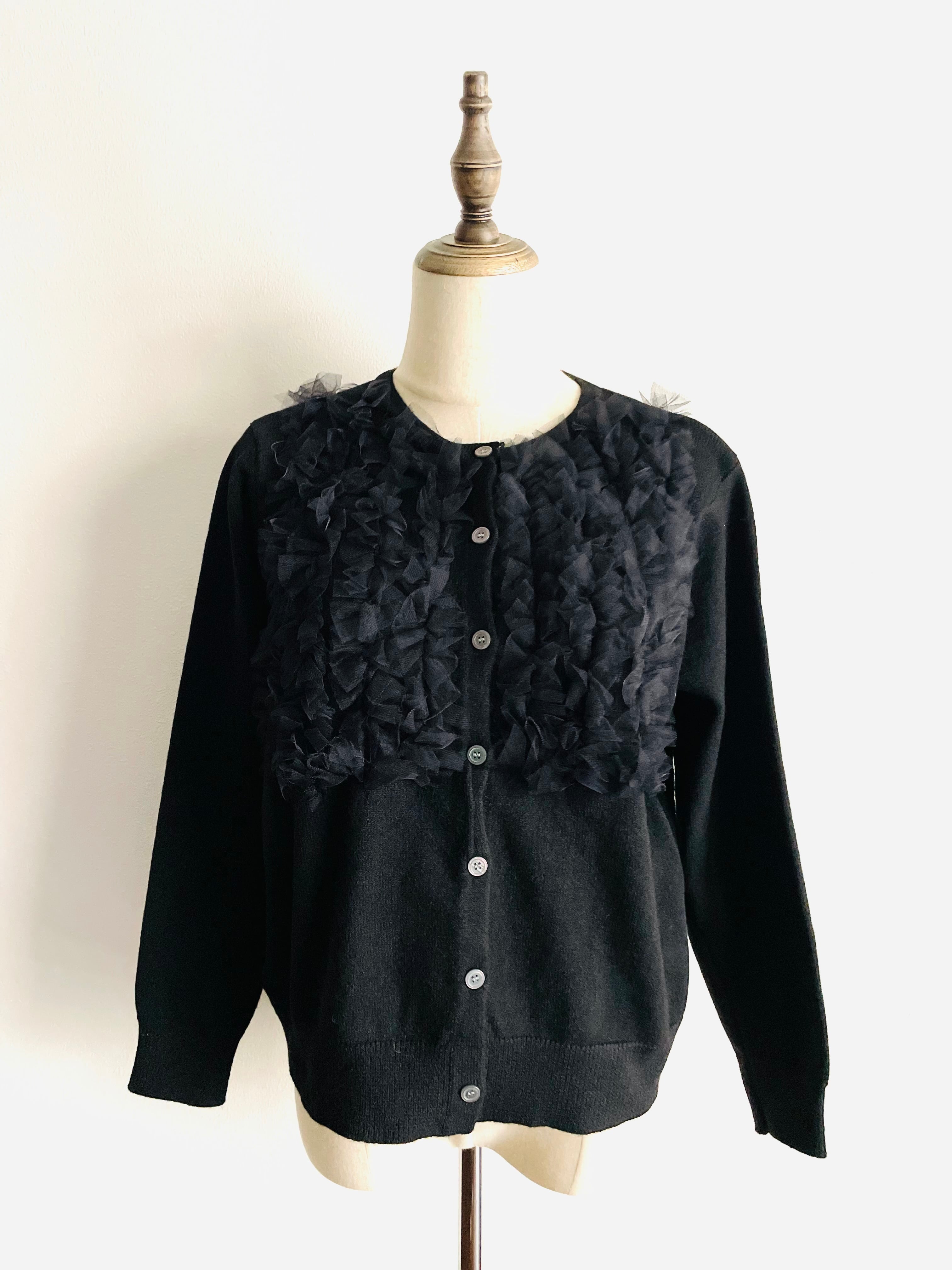 フロントのチュールレースが特徴のニットカーディガン。
