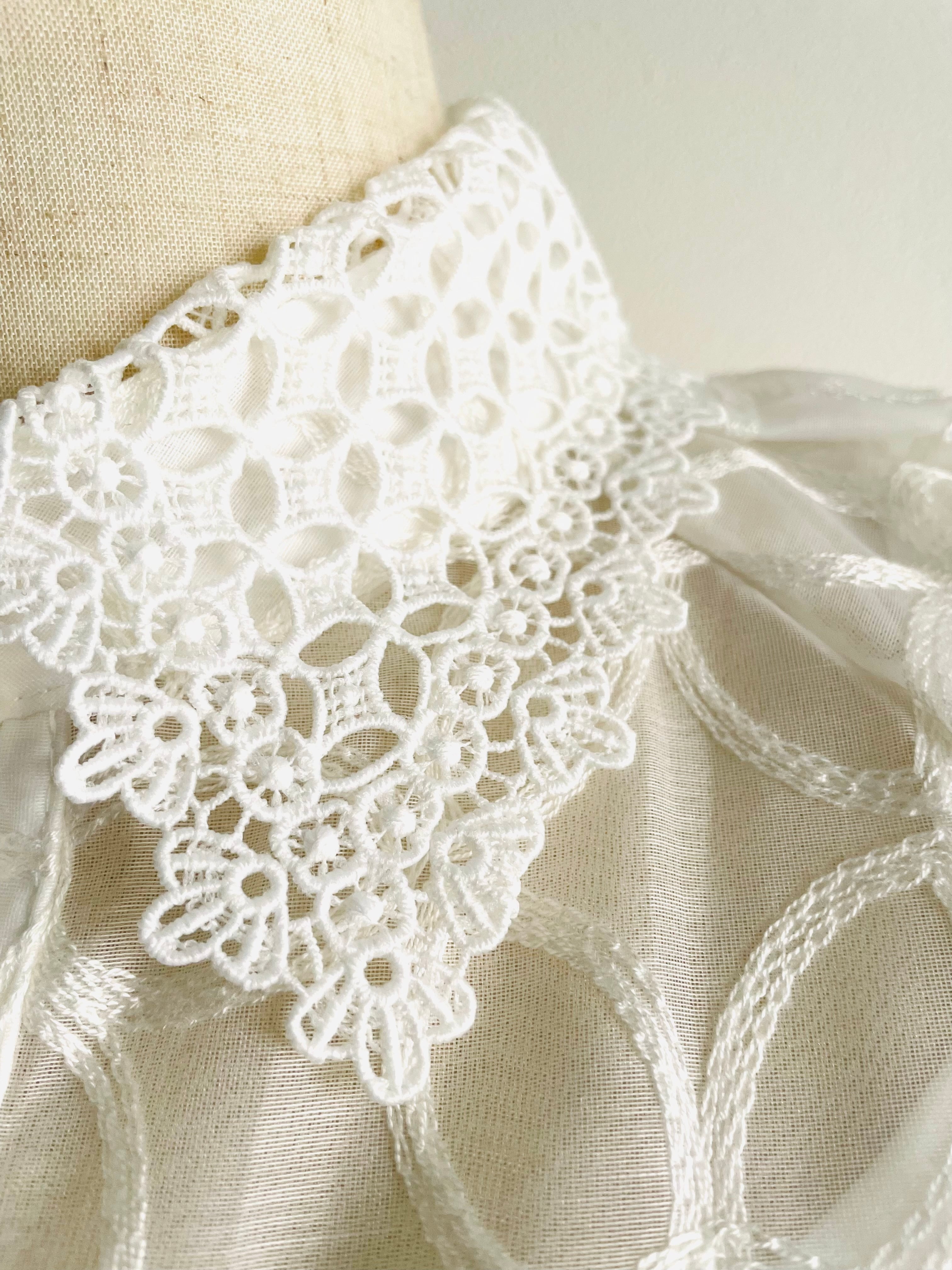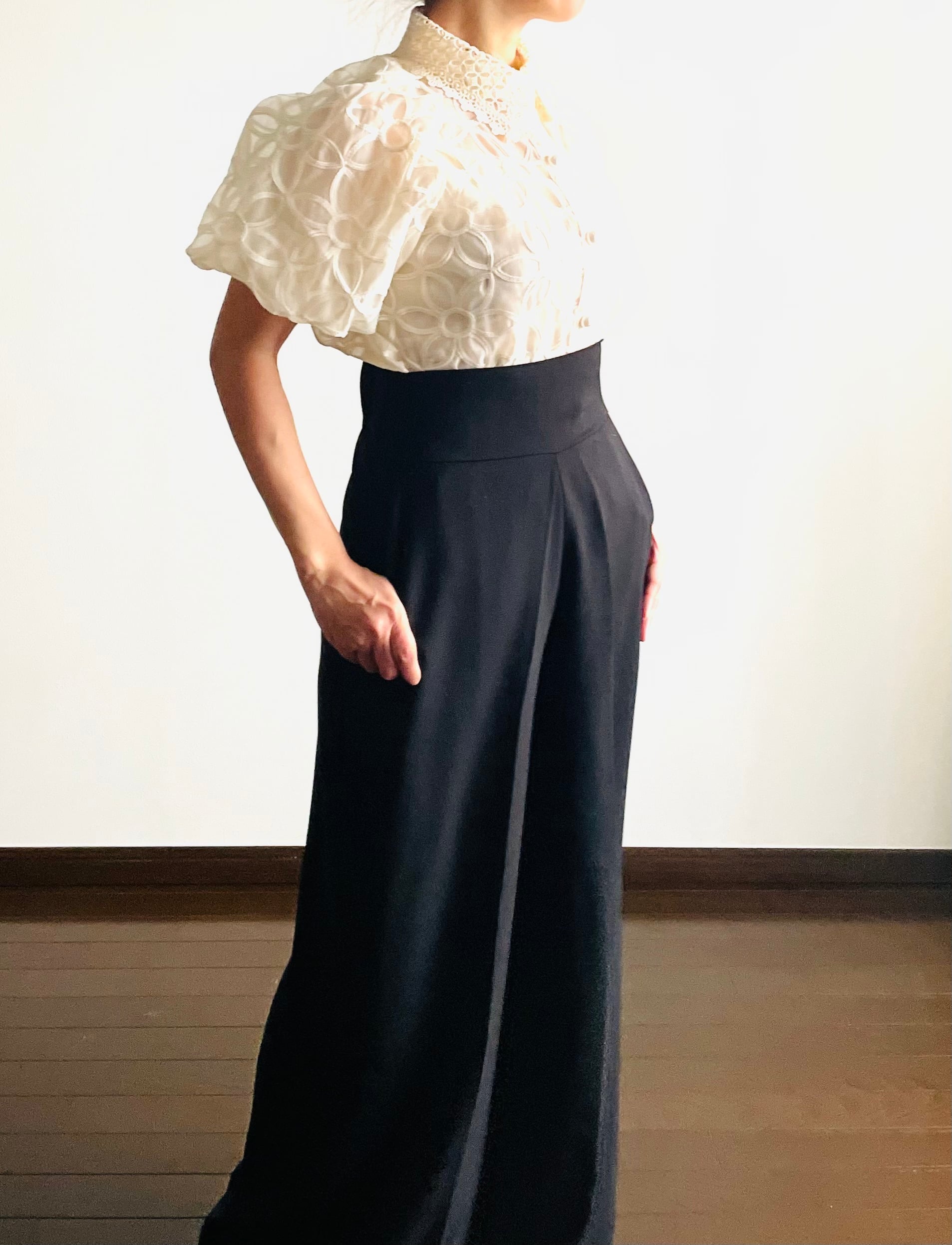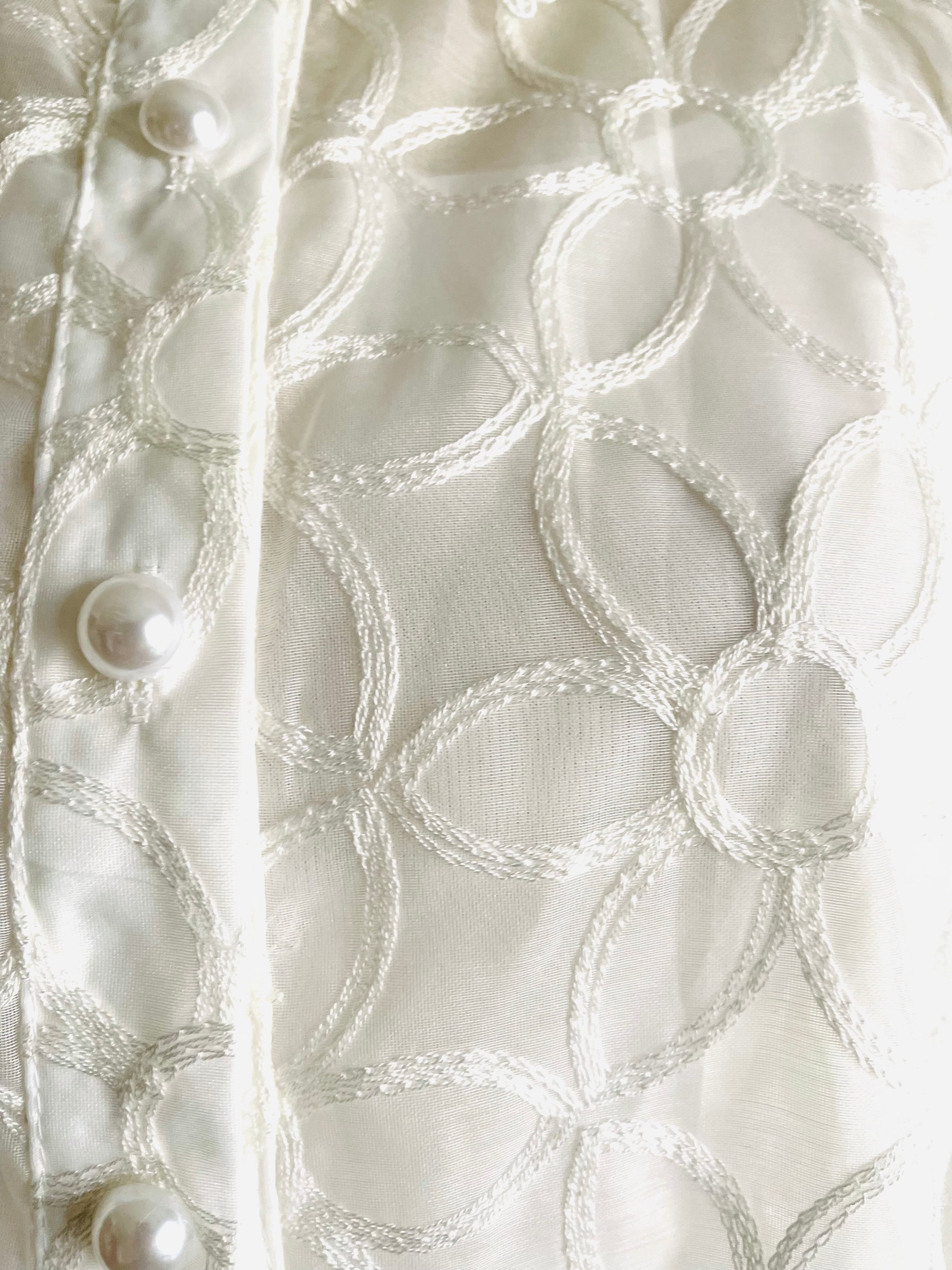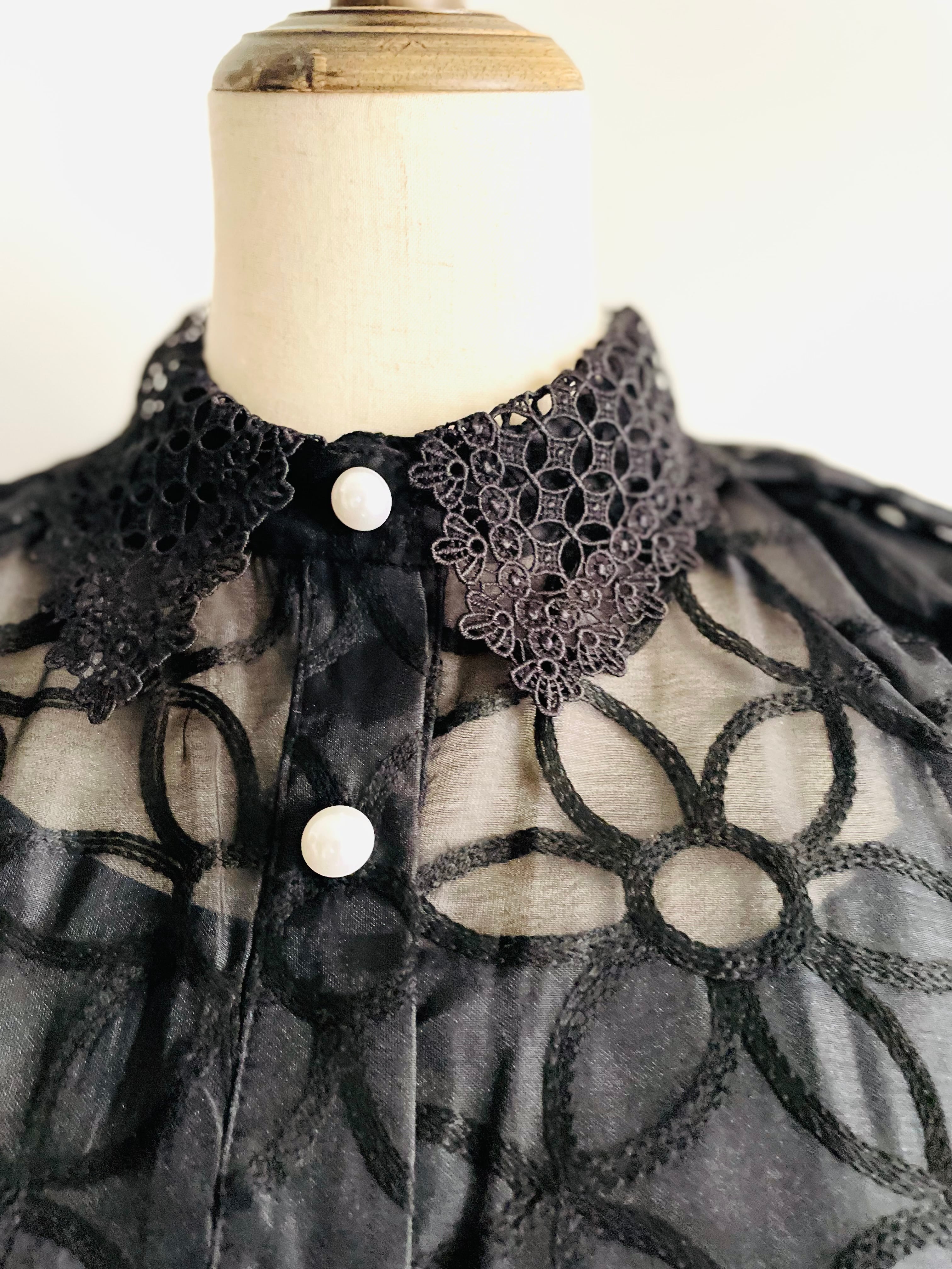 高級感のあるレースの襟が特徴で、フロントにはパール調のボタンが上品な印象を与えてくれる一枚です。