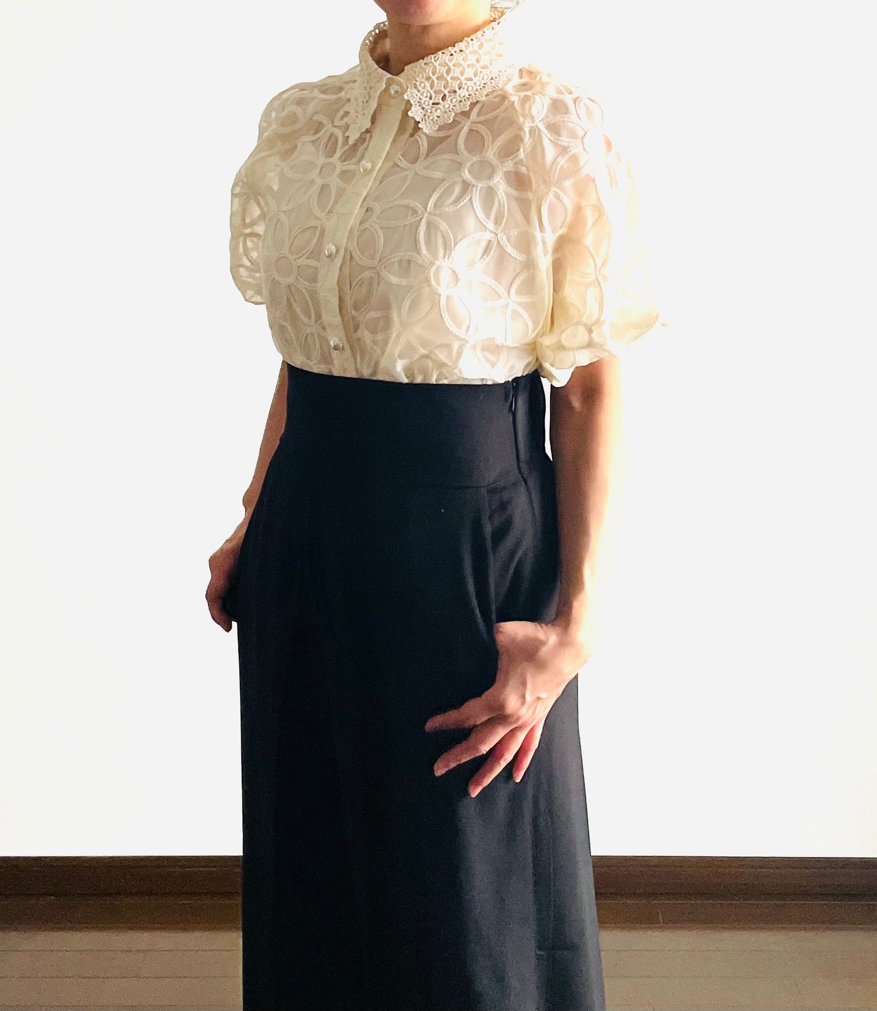 フラワーシースルーレース襟_半袖ブラウス(インナーキャミ付き)