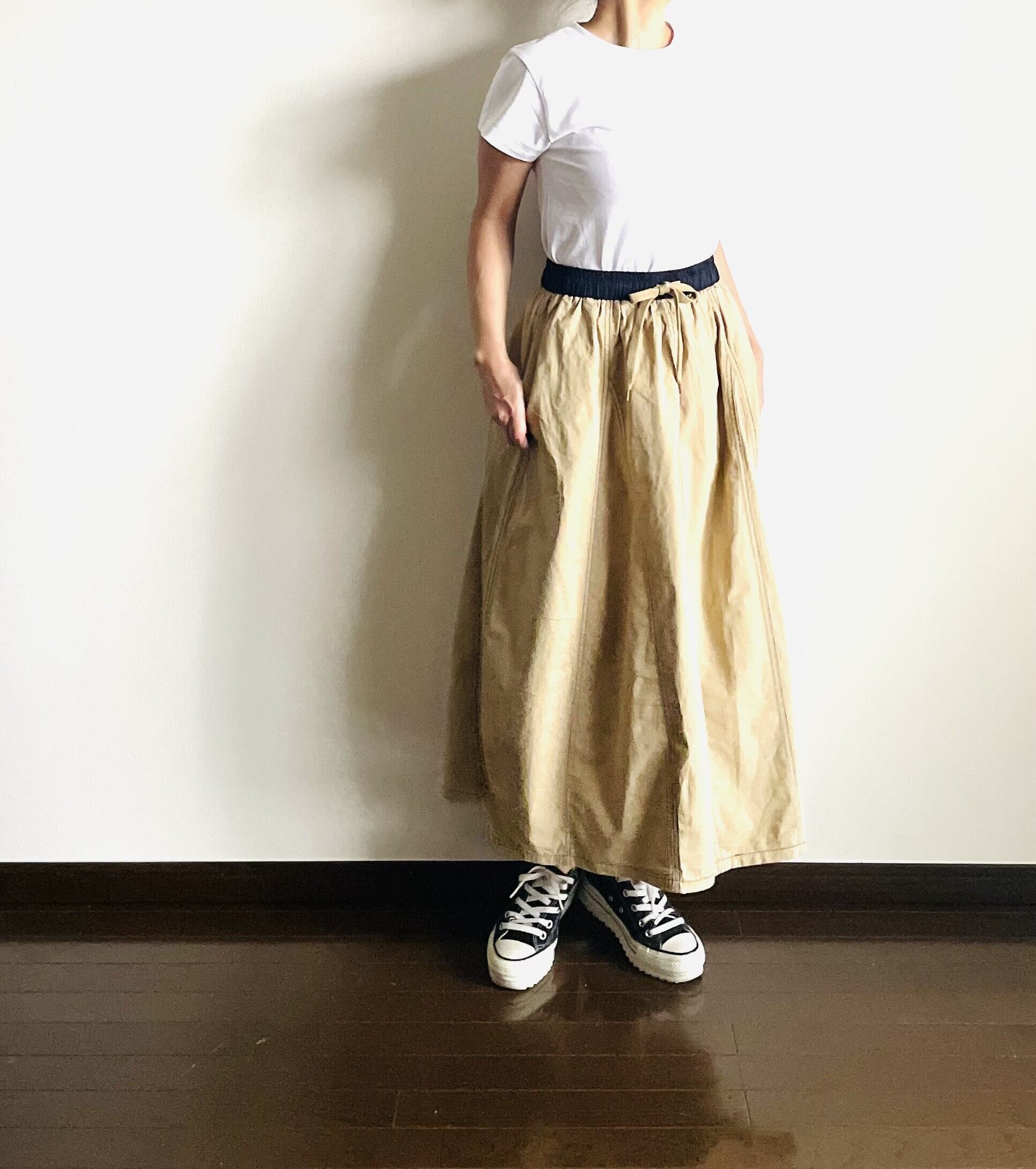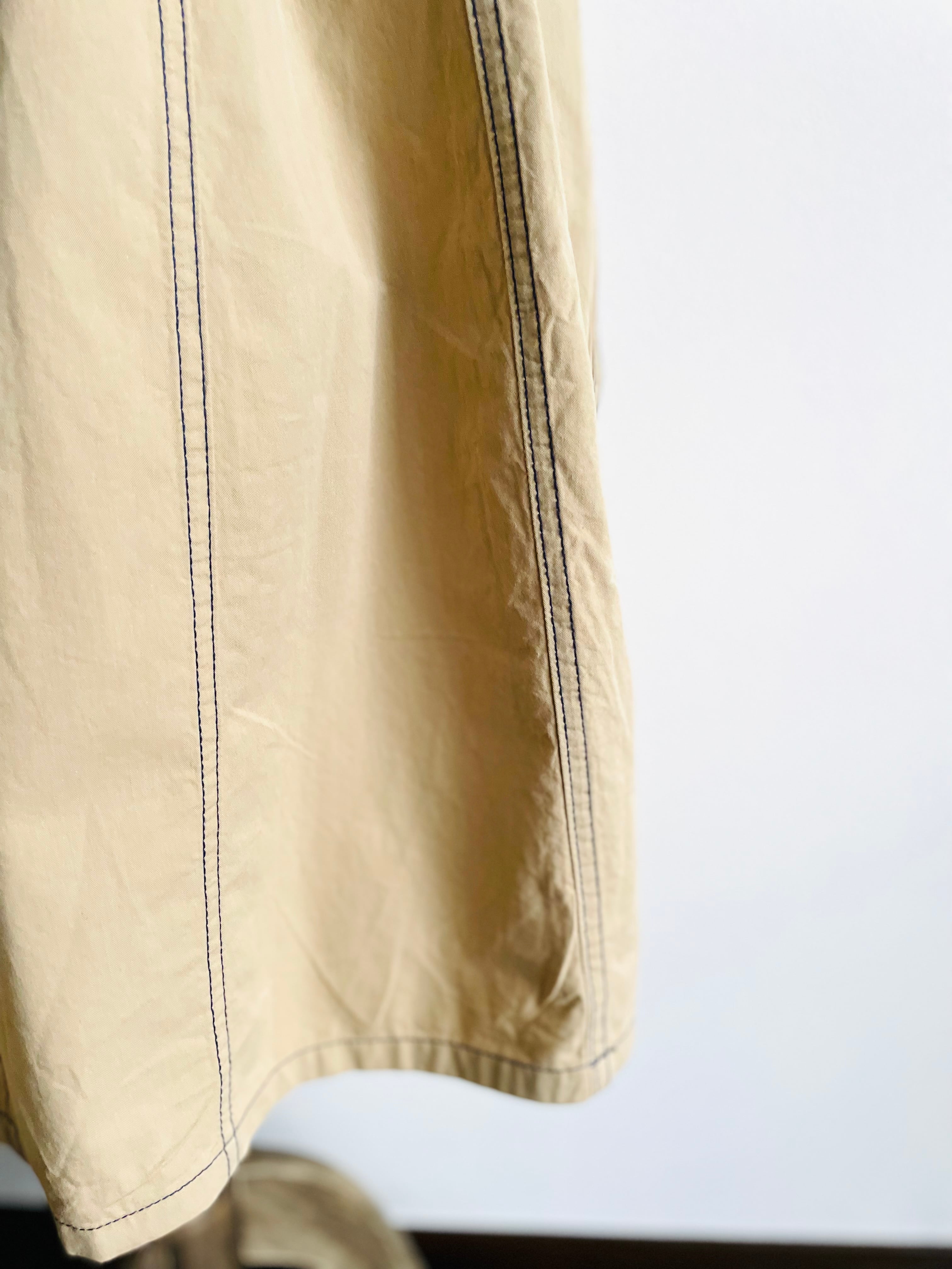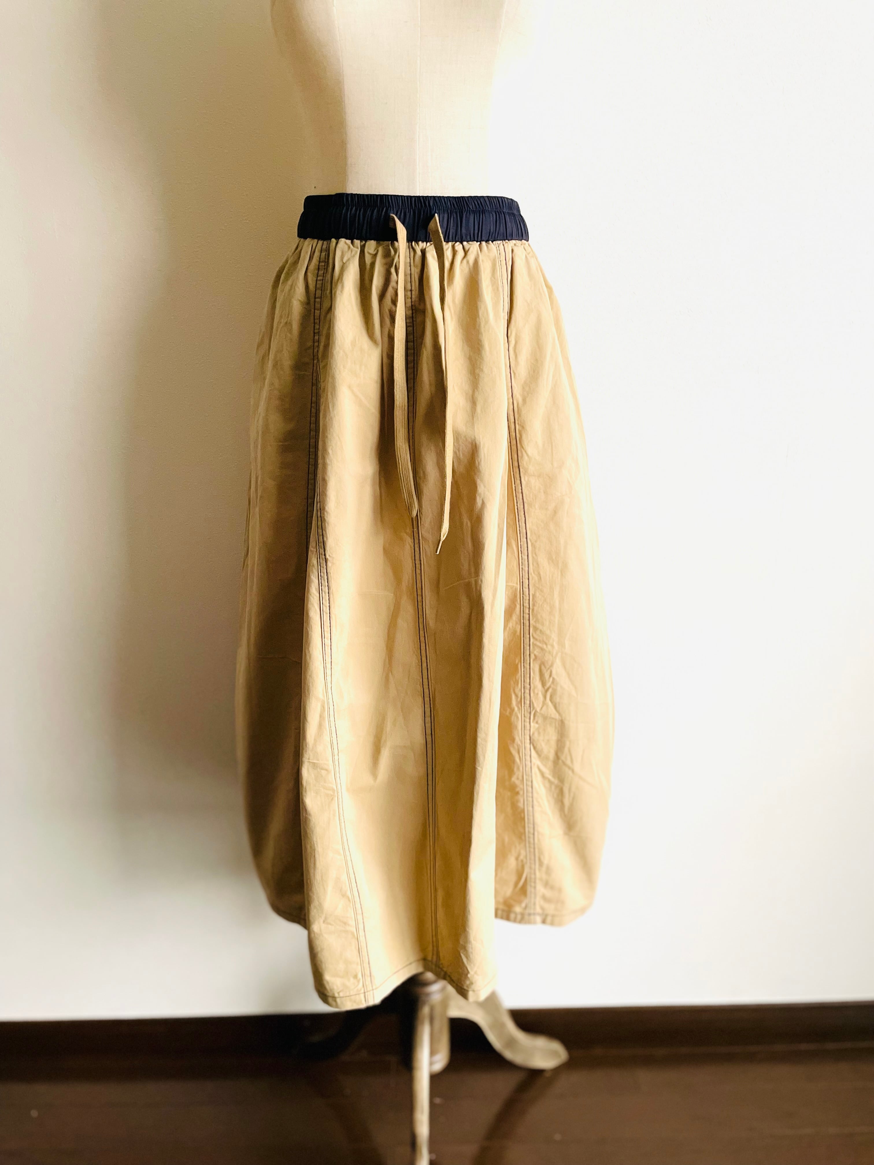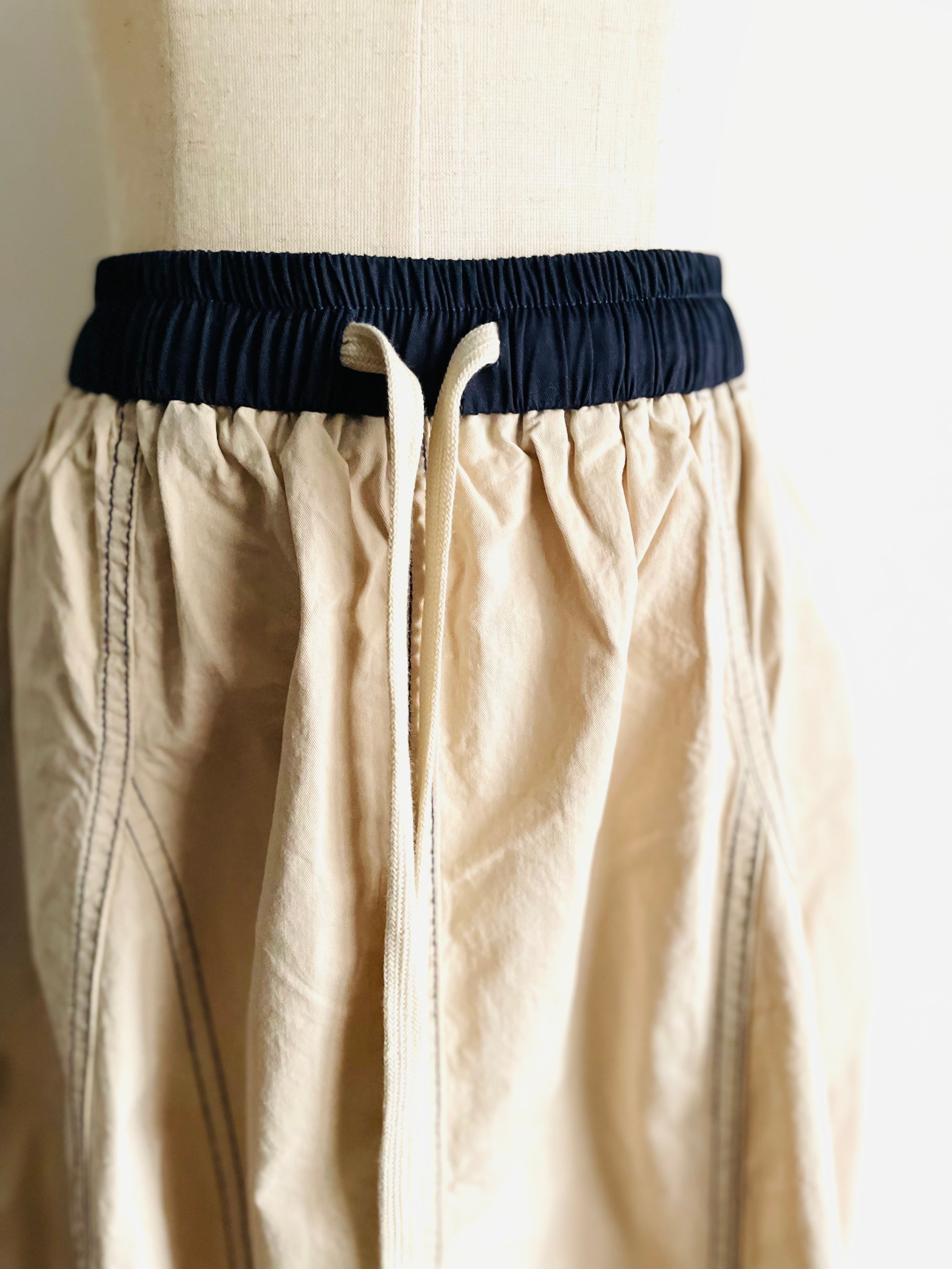 ネイビー色のステッチが特徴のAラインスカート。