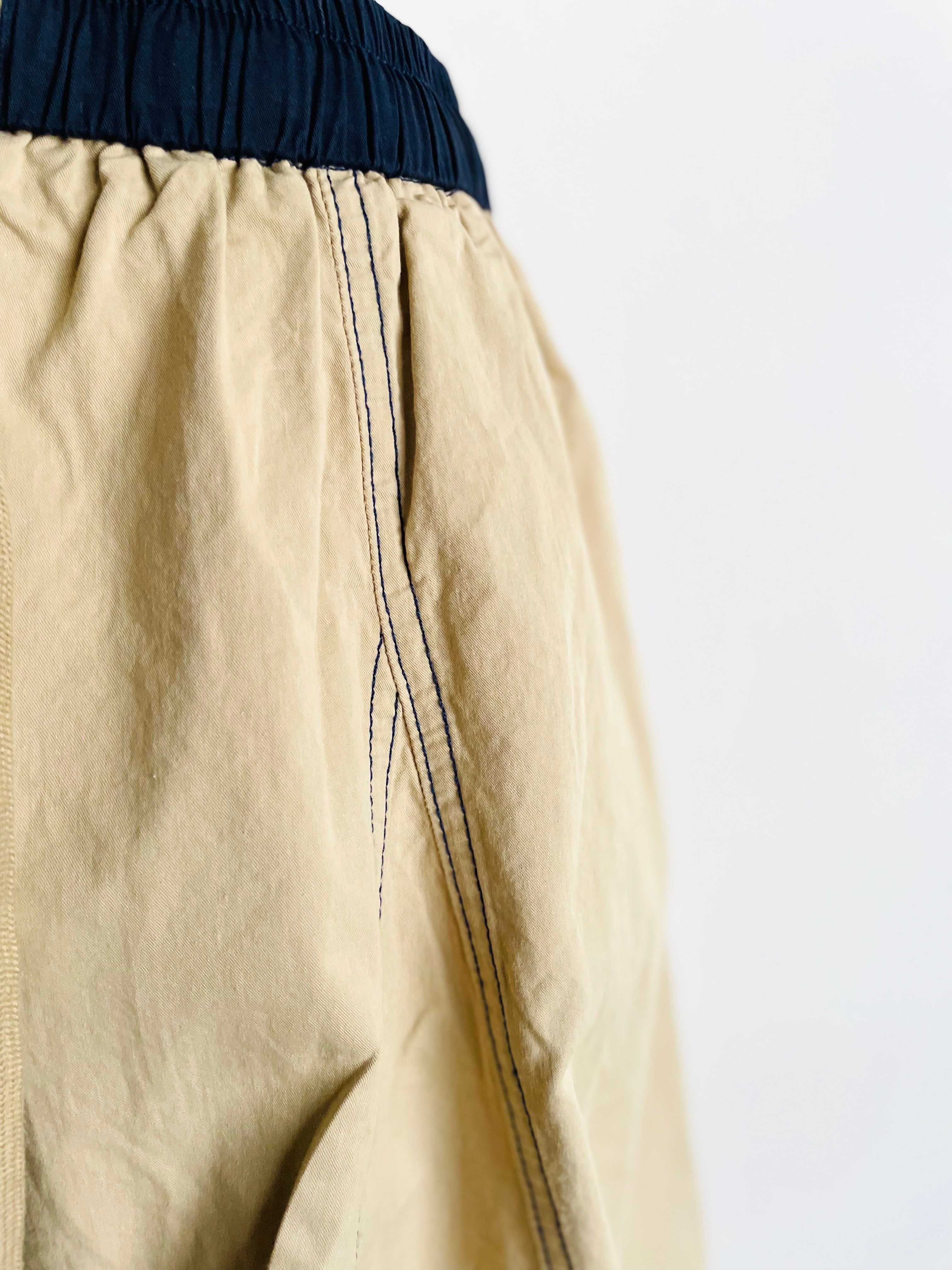 濃紺のウエスト切り替えや縦に施されたステッチデザインがカジュアルなスタイルにピッタリの一枚です。コットン&ポリエステル素材なので、着心地もとても良く、両サイドにポケットもあるので便利に使えます。ウエストはゴム仕様で、フロントにある紐で調整できます。
