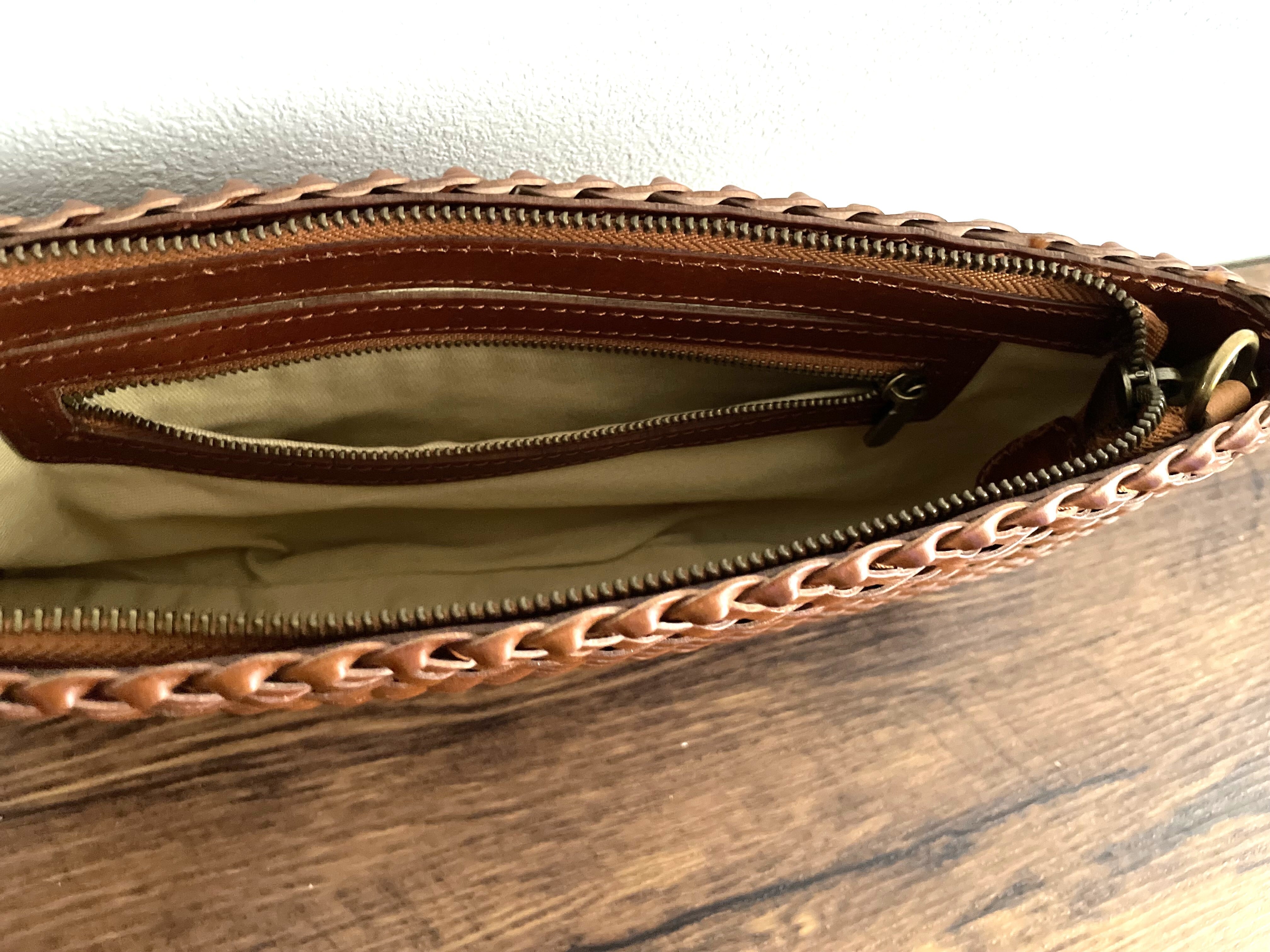 開閉口はファスナーでしっかり閉められ、内側にもファスナータイプのポケットで便利に安心して使えます。内側にもレザーをポイントであしらい、上品さをプラスしています。