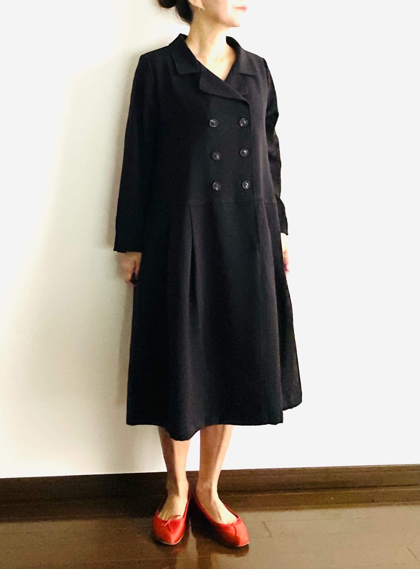 裏地がついた厚手のしっかりとしたポリエステル素材はシワが付きにくく、秋は一枚で、冬はタートルニットなどをインナーに重ねても素敵です。