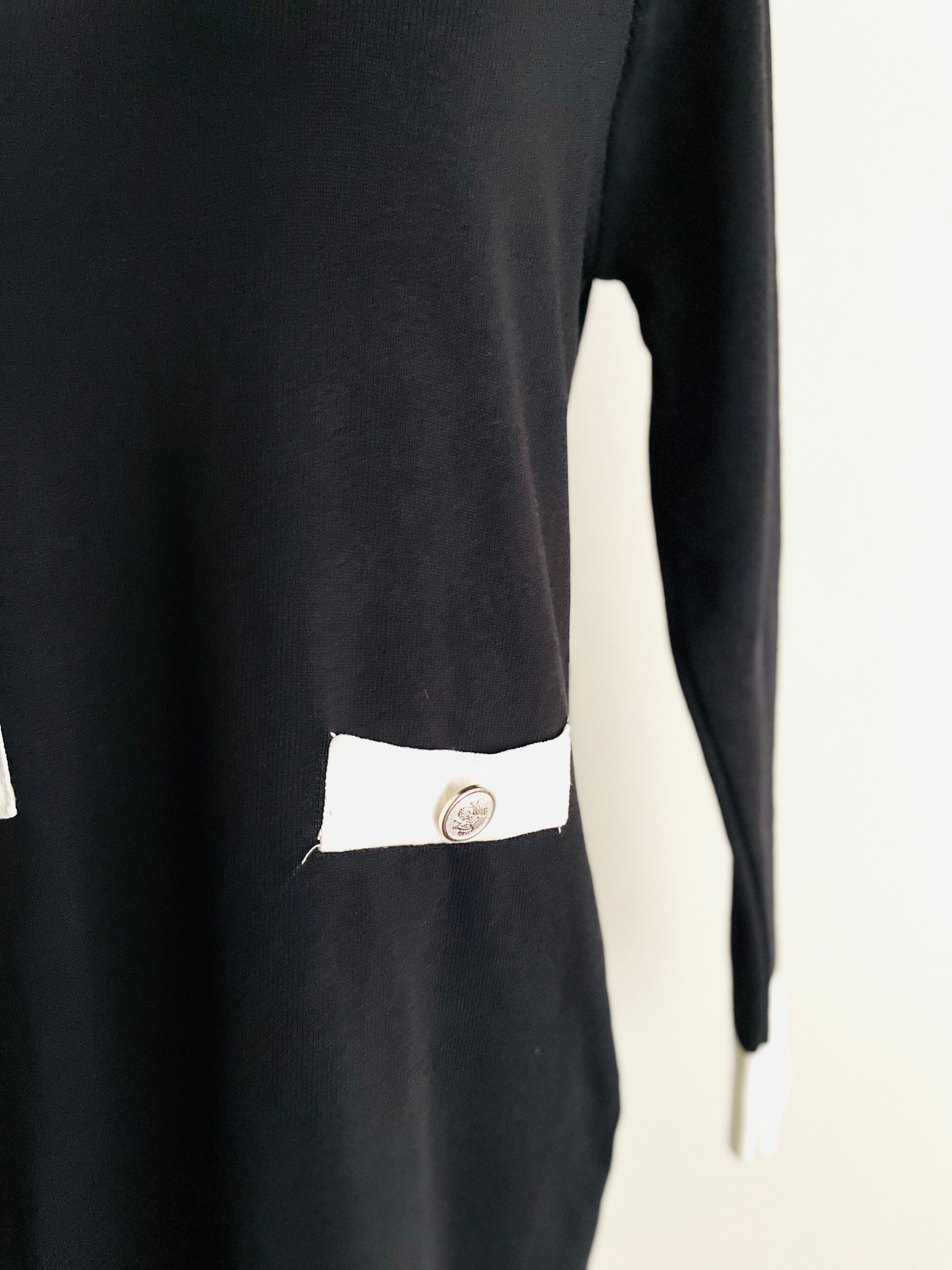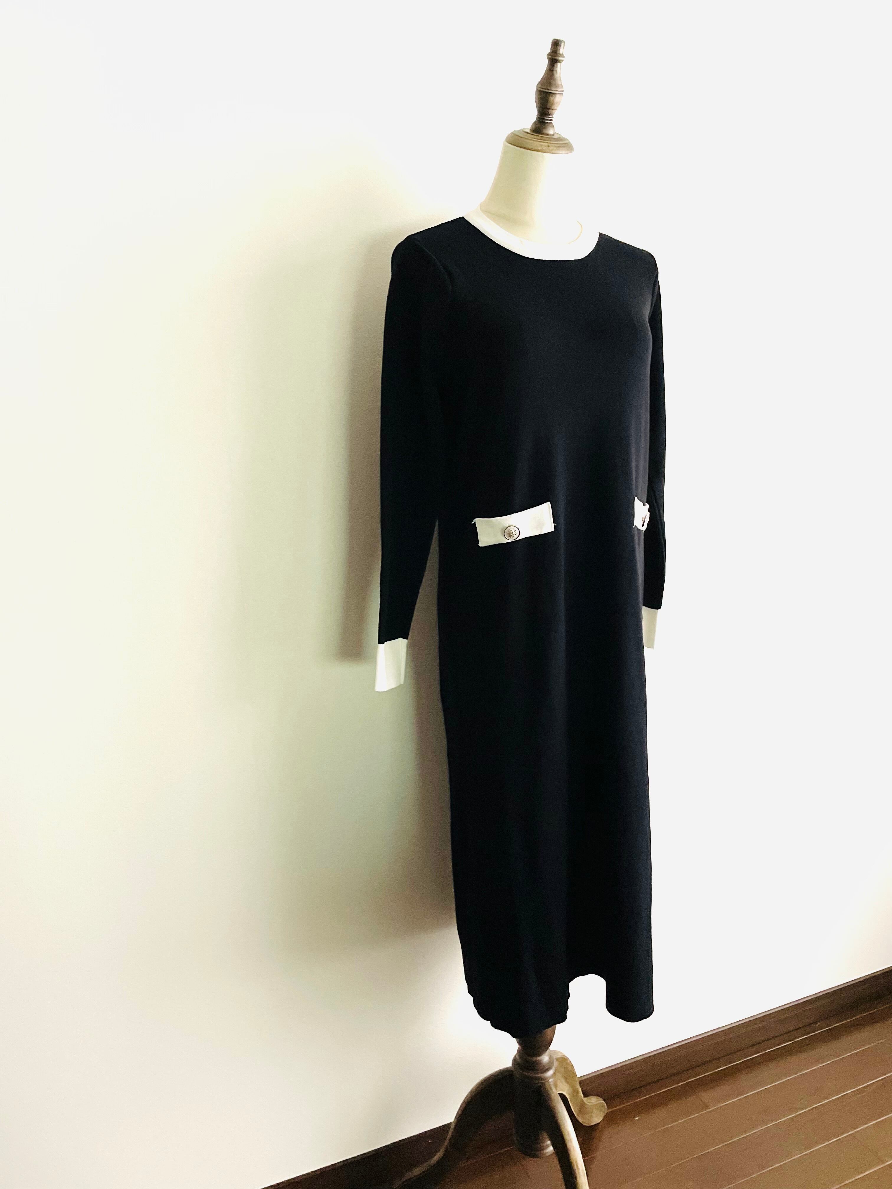 シックな雰囲気で、襟、袖、そしてフロントの飾りボタンの切り替えが特徴です。