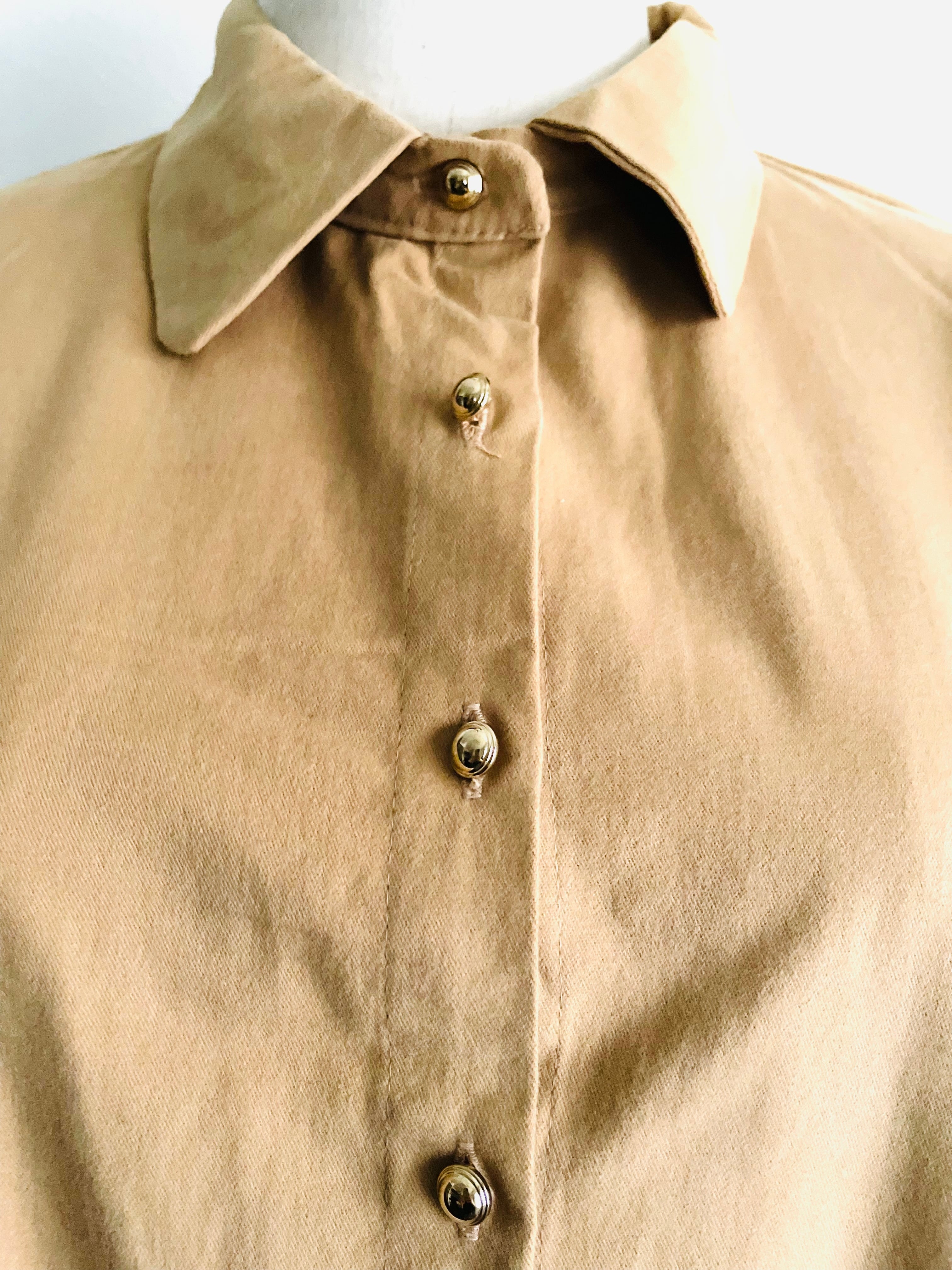 柔らかな綿100%のコットンコーデュロイの素材は、しっとりとしたやさしい手触りと、ほどよいハリと厚地で着心地も良く、そしてフロントのクラシカルな丸い金ボタンがとってもオシャレな雰囲気を演出する一枚。