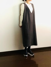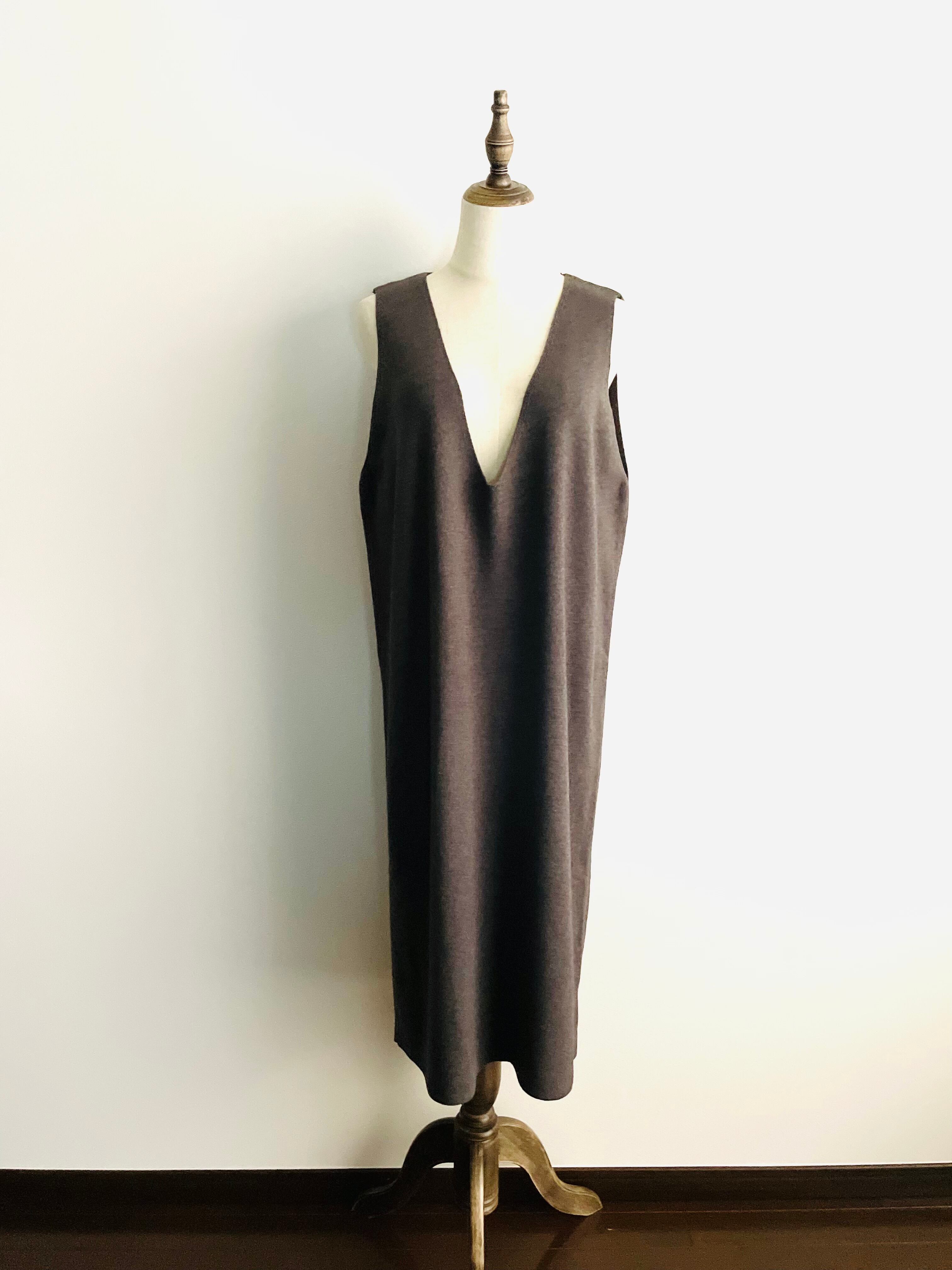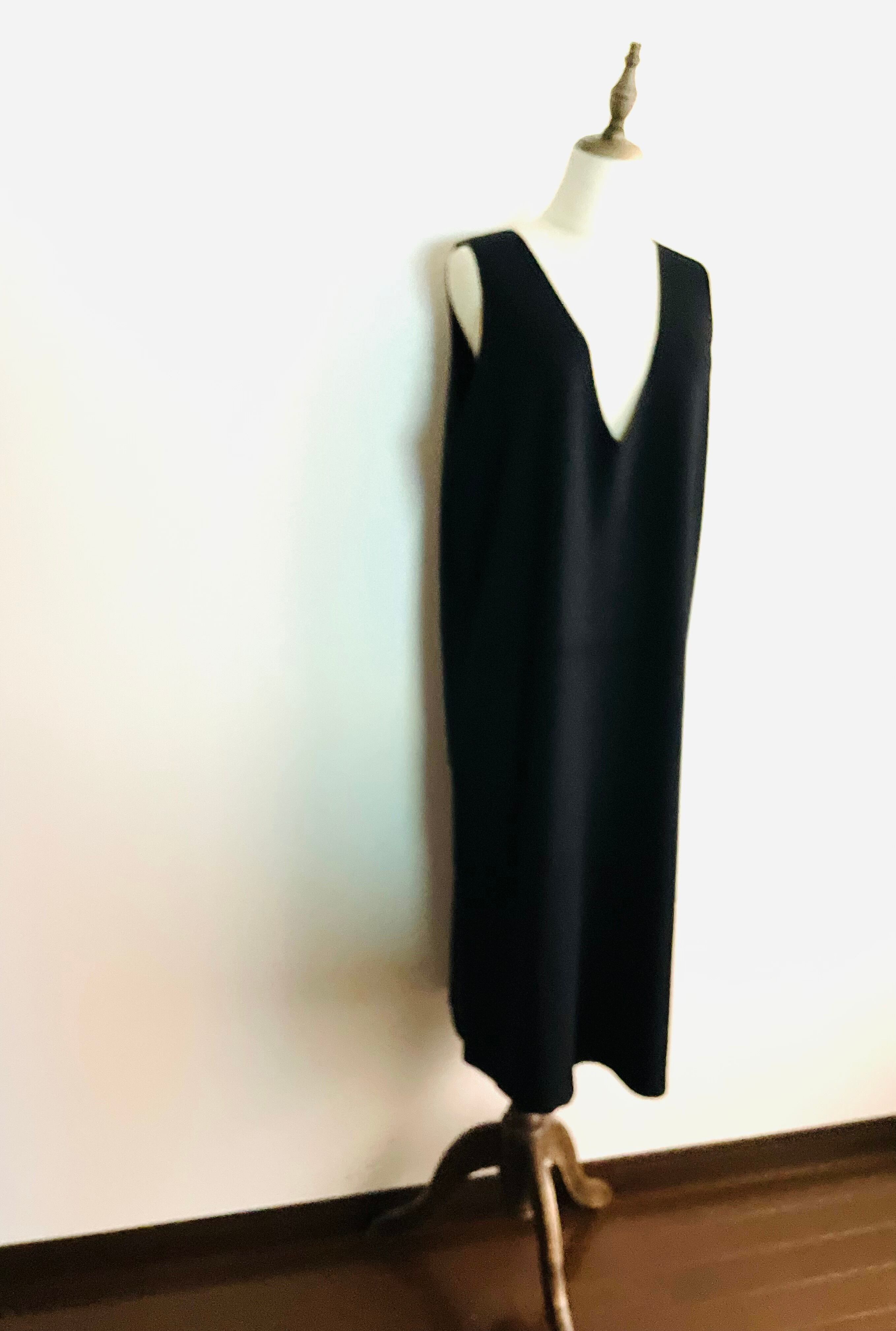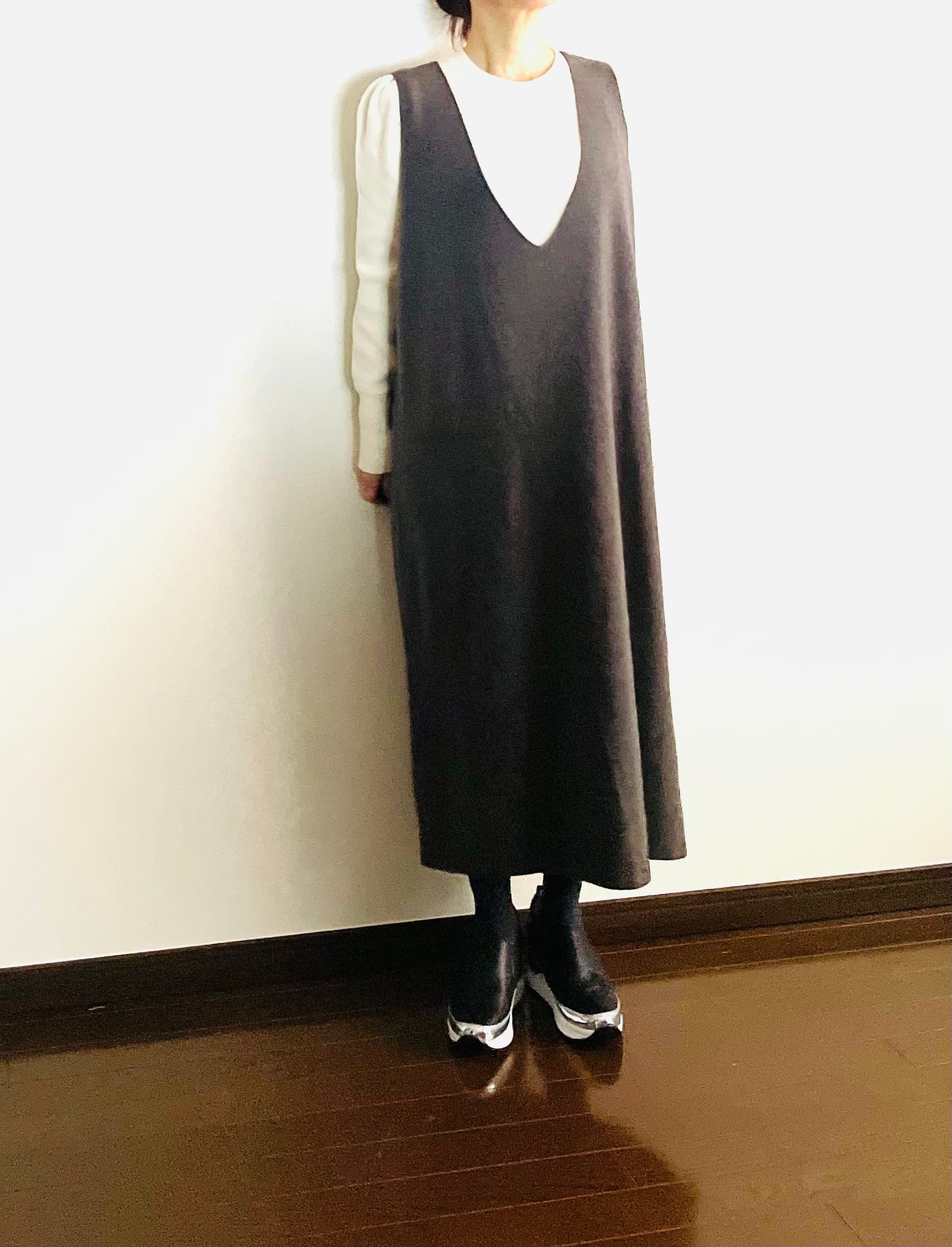 バスト下あたりまで入った深めのVネックが縦のラインを強調し、全体的にバランス良く見せてくれます。