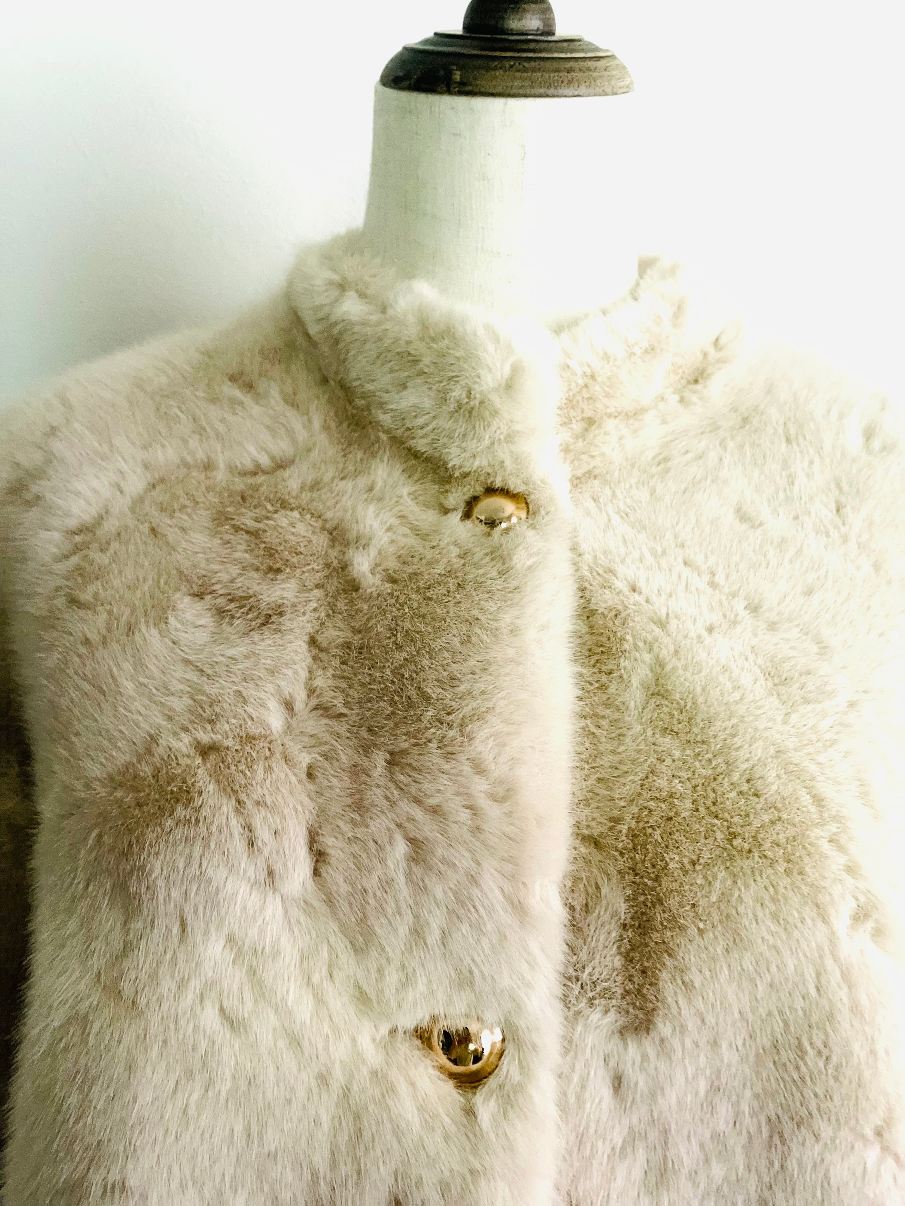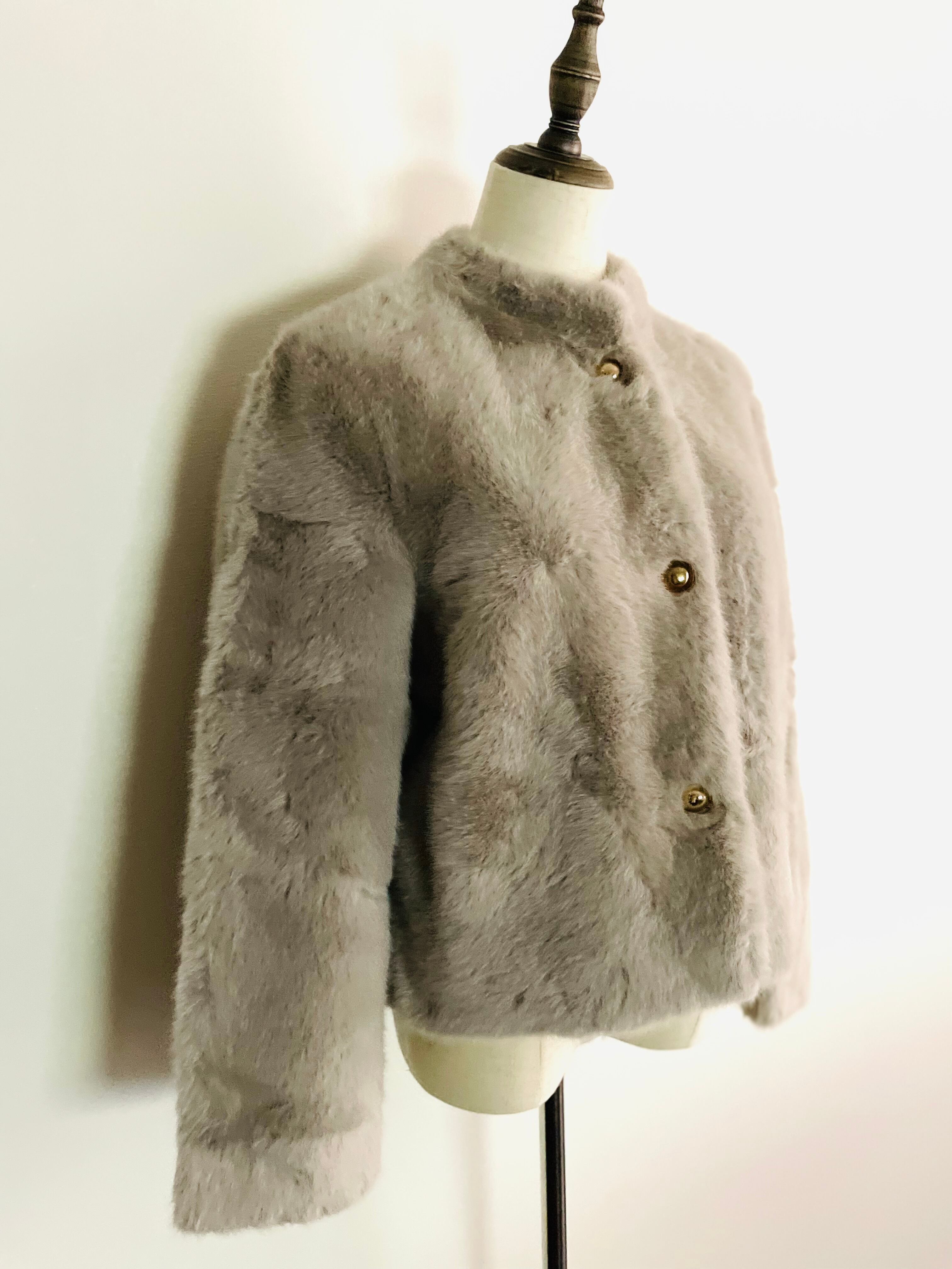 フロントはピンクゴールドのボタンが優しい雰囲気を演出してくれます。内側はムートン風のしっかりした素材で、暖かく、そして高級感抜群の一枚です。